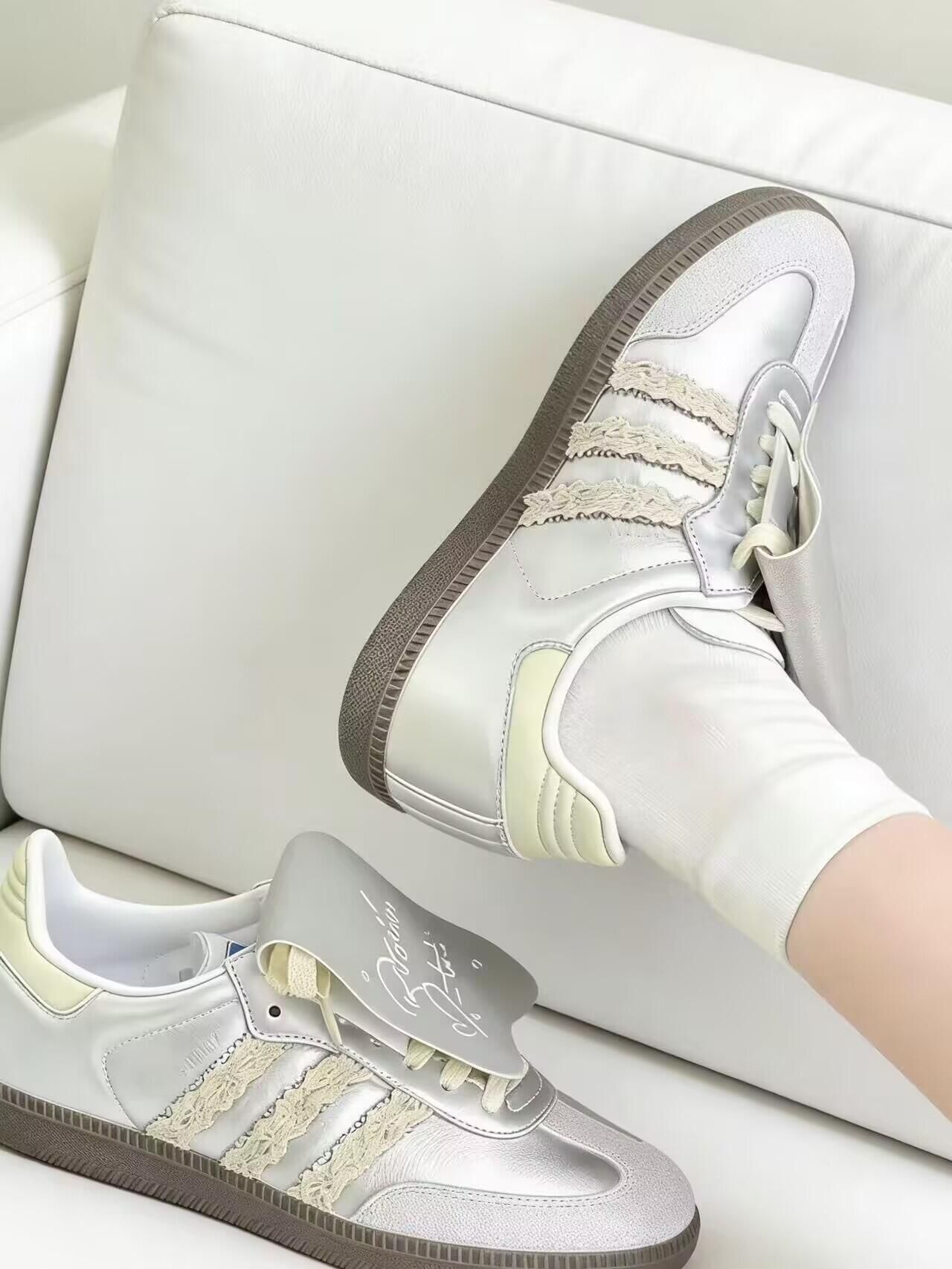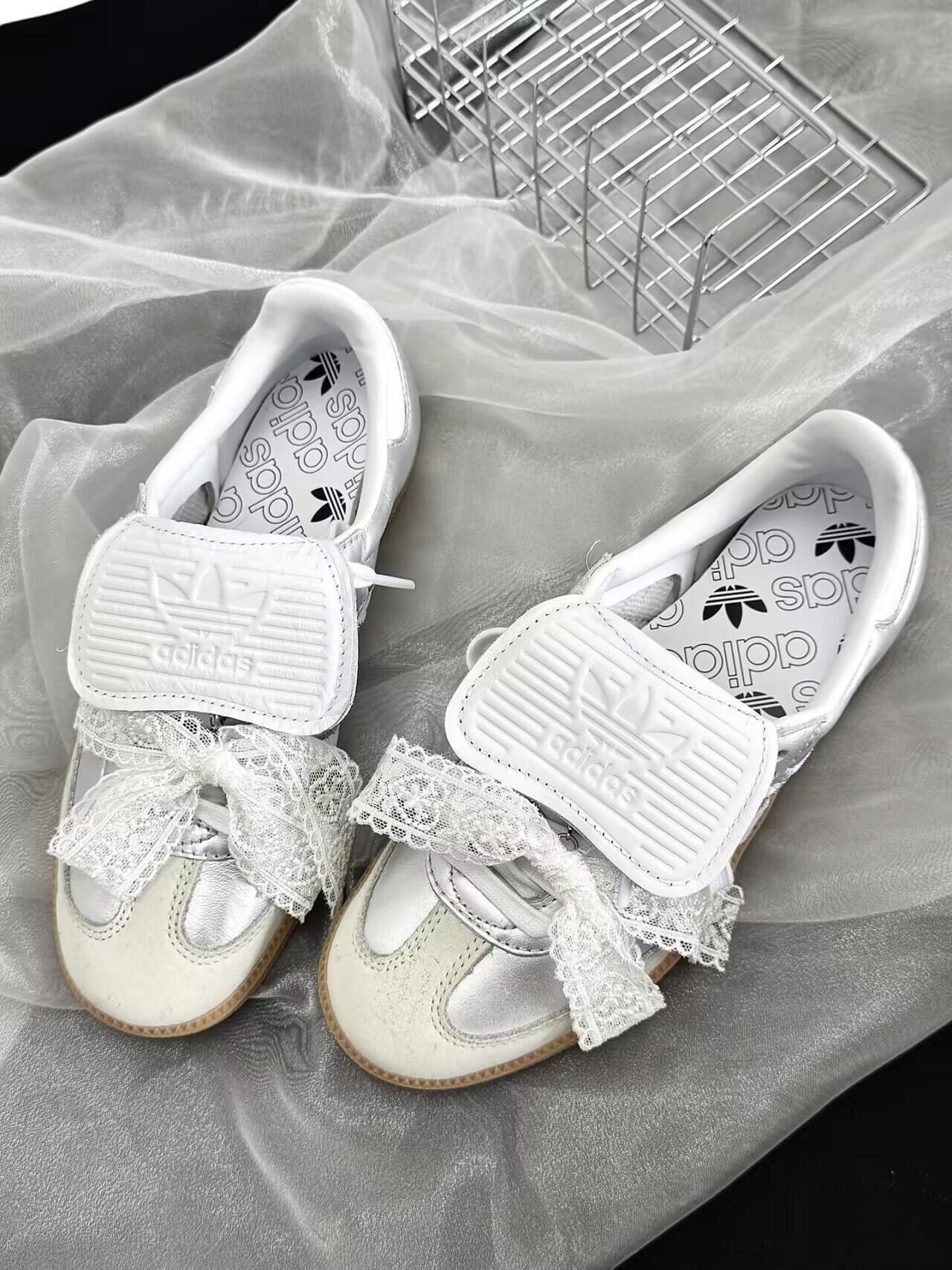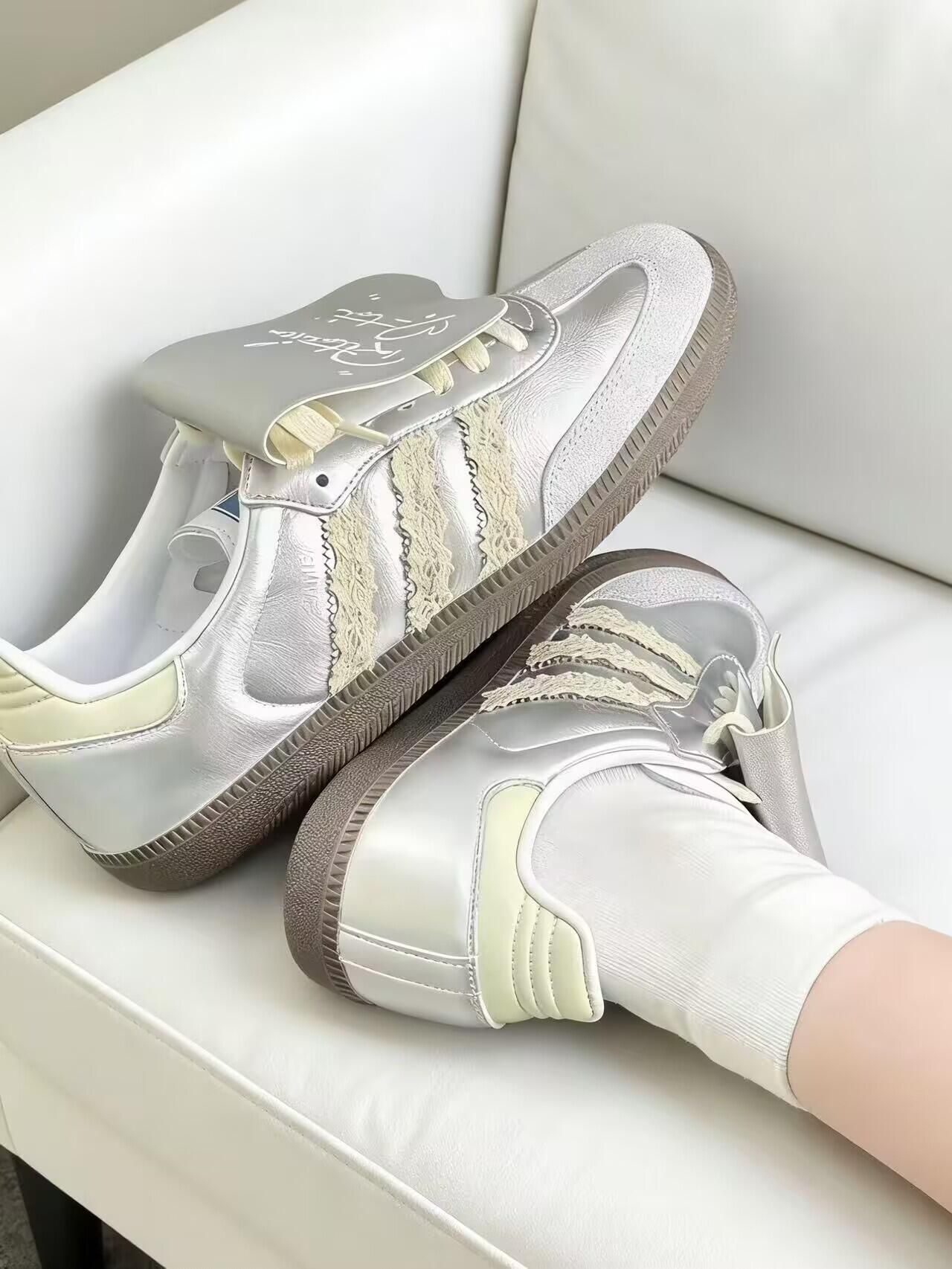 今天出门前随手拍了这双鞋,真的越看越爱。 这双银色德训鞋是我最近的心头好。它的皮质很软,上脚完全不磨脚,暴走一天也不累。蕾丝三条杠的设计特别戳我,甜酷感拉满,搭配白袜就很有韩系松弛感。 鞋面上的魔术贴是点睛之笔,穿脱方便还能调节松紧。银色在阳光下巨闪,配牛仔短裤、碎花裙都好看。复古的生胶底和银色鞋面撞出独特的复古甜妹风,完全不挑风格。 最近出门基本只穿它,已经被好几个朋友问链接了。如果你也想找一双...
