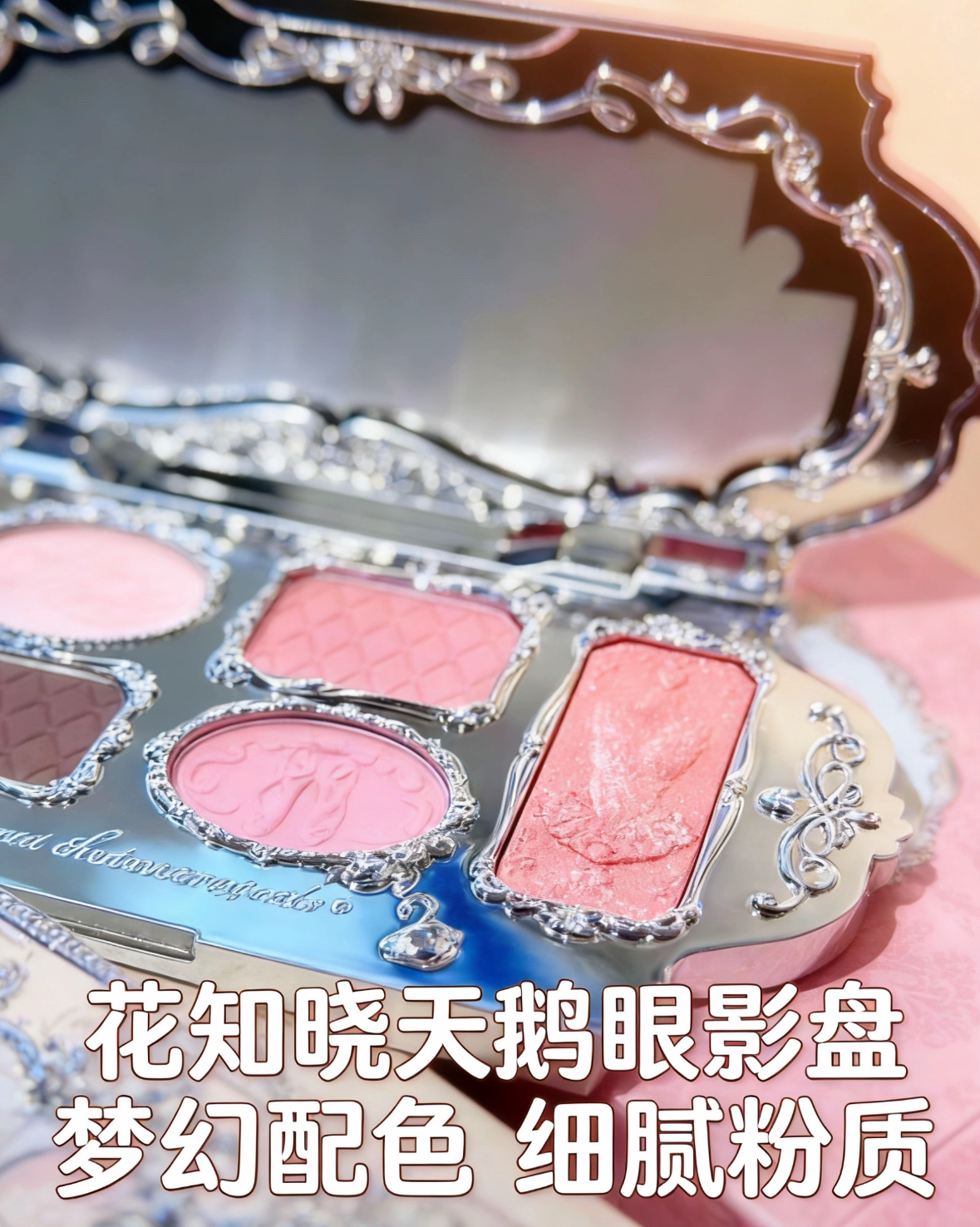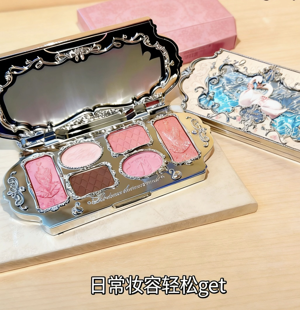 谁懂啊!花知晓这款天鹅芭蕾眼影盘真的美到我心巴上💖 外壳是精致的巴洛克浮雕花纹,搭配粉白天鹅与水波纹设计,拿在手里像一件艺术品,放在化妆台上都像个精致摆件。 打开后里面的六色眼影更是绝绝子,每一格都有细腻的浮雕压纹,粉质软糯像融化的奶油,显色度在线又不会飞粉,日常通勤、约会、舞台妆都能hold住。 自带的大镜子补妆超方便,金属外壳质感拉满,拿出来补妆都自带氛围感~ 不管是粉白天鹅的温柔,还是白...