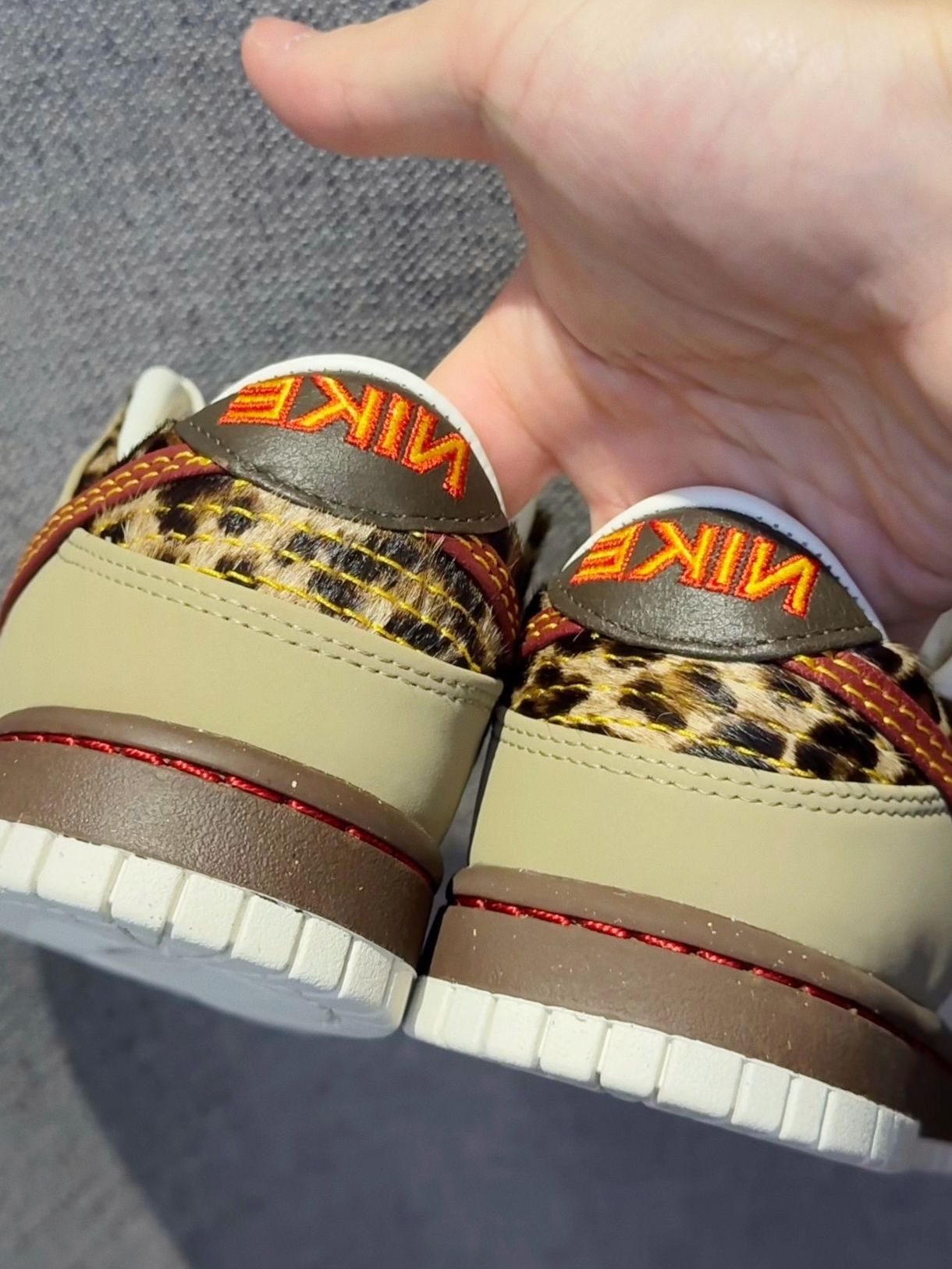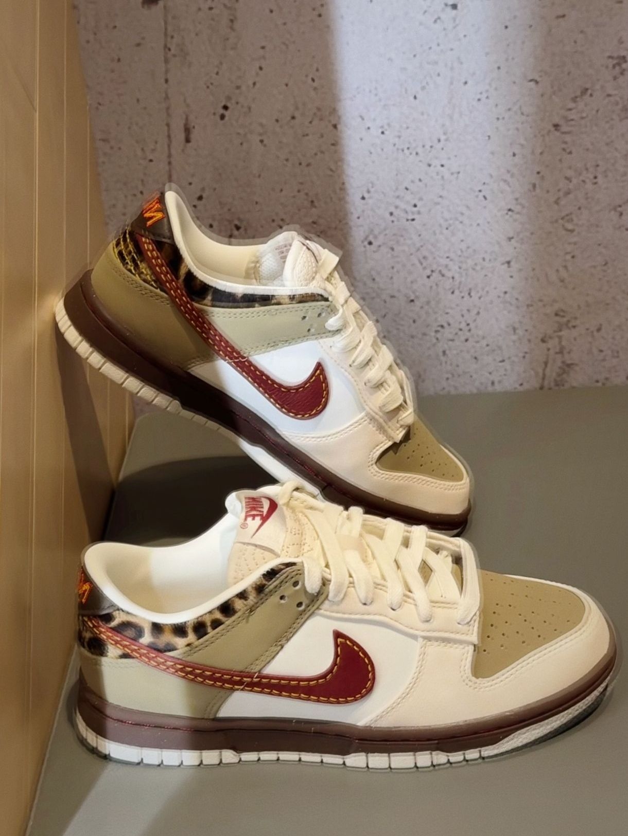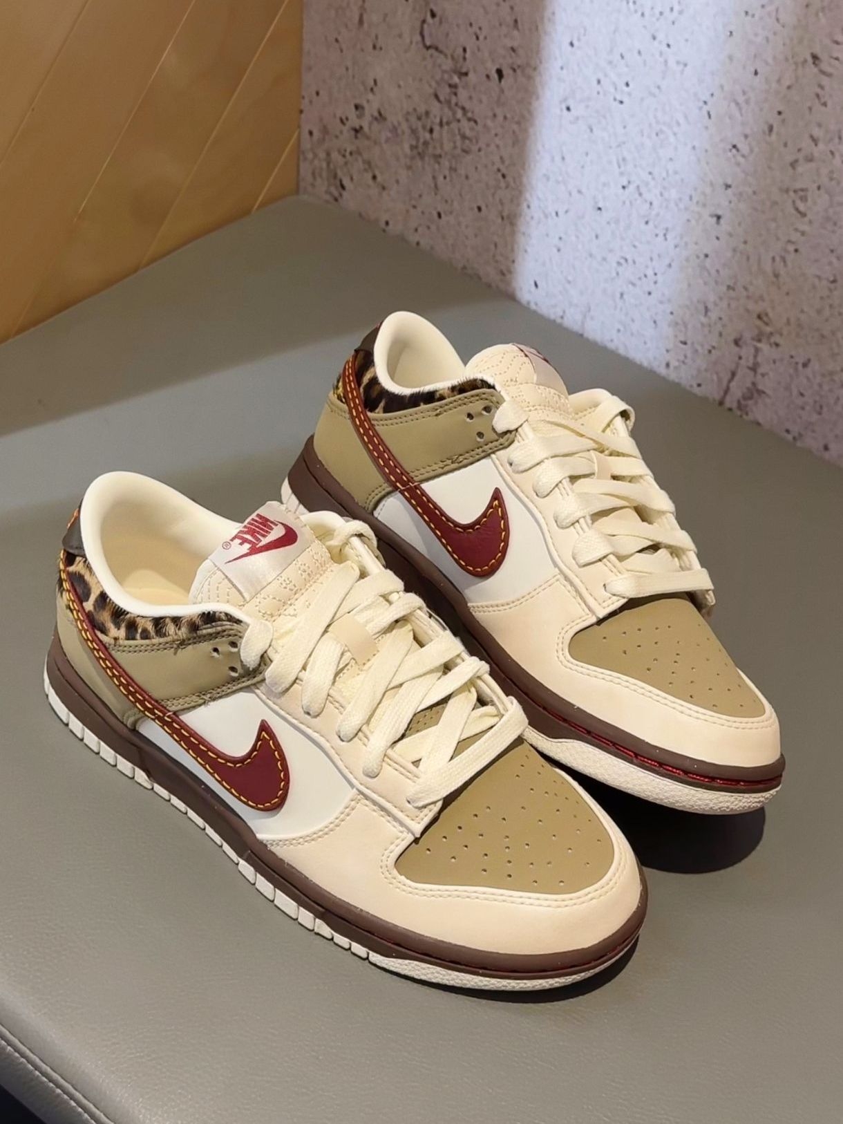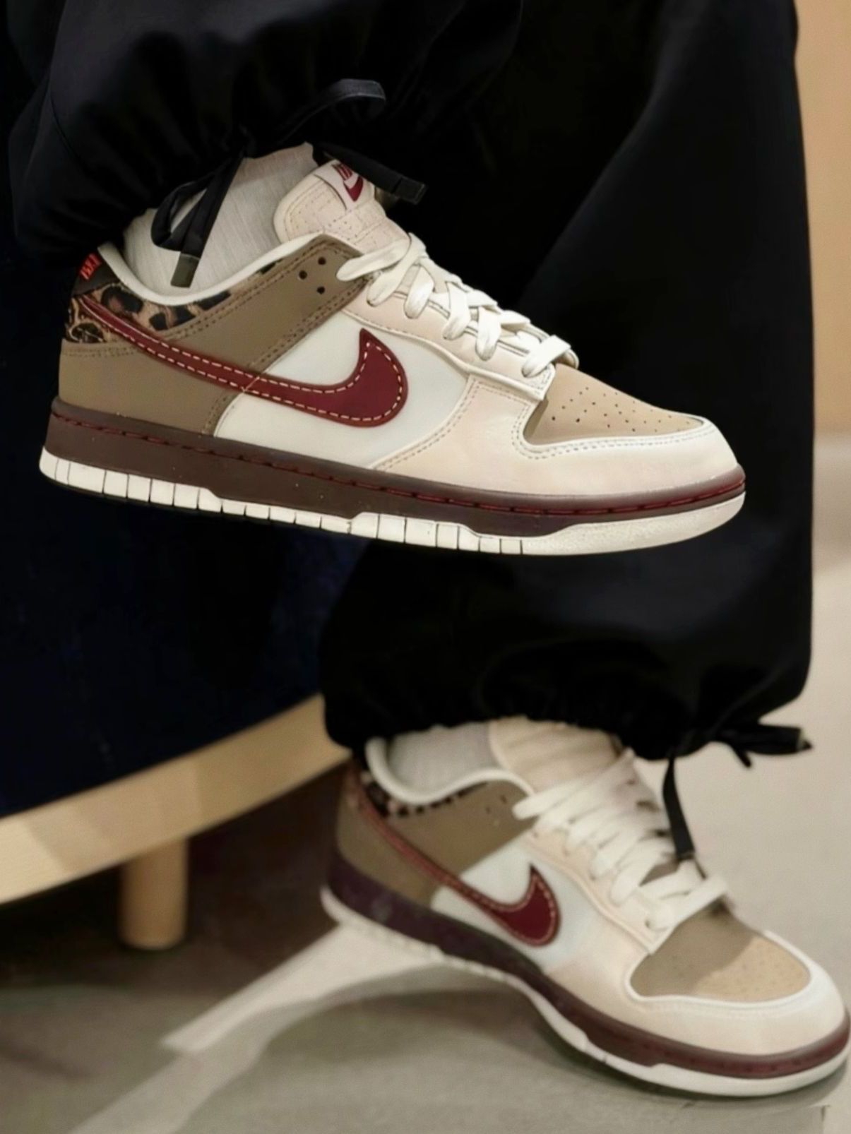 Nike Dunk的野性与温柔碰撞 谁能拒绝一双带豹纹的Dunk啊!米白+卡其的温柔色系打底,鞋侧那抹酒红Swoosh复古感拉满,后跟的豹纹细节直接把野性值拉满,非常喜欢 拼接色系,质感在线 穿上它谁还不是时尚弄潮儿
