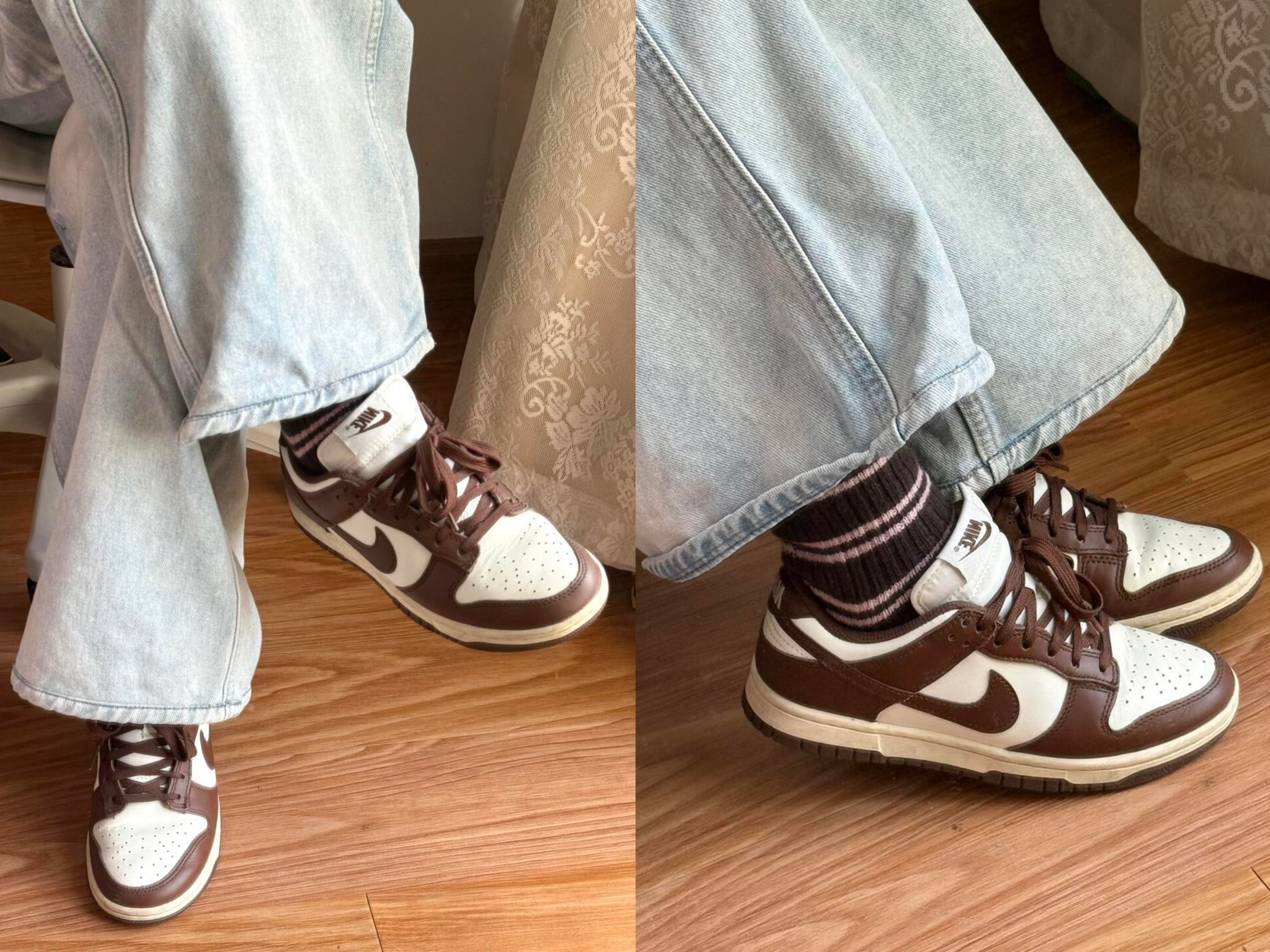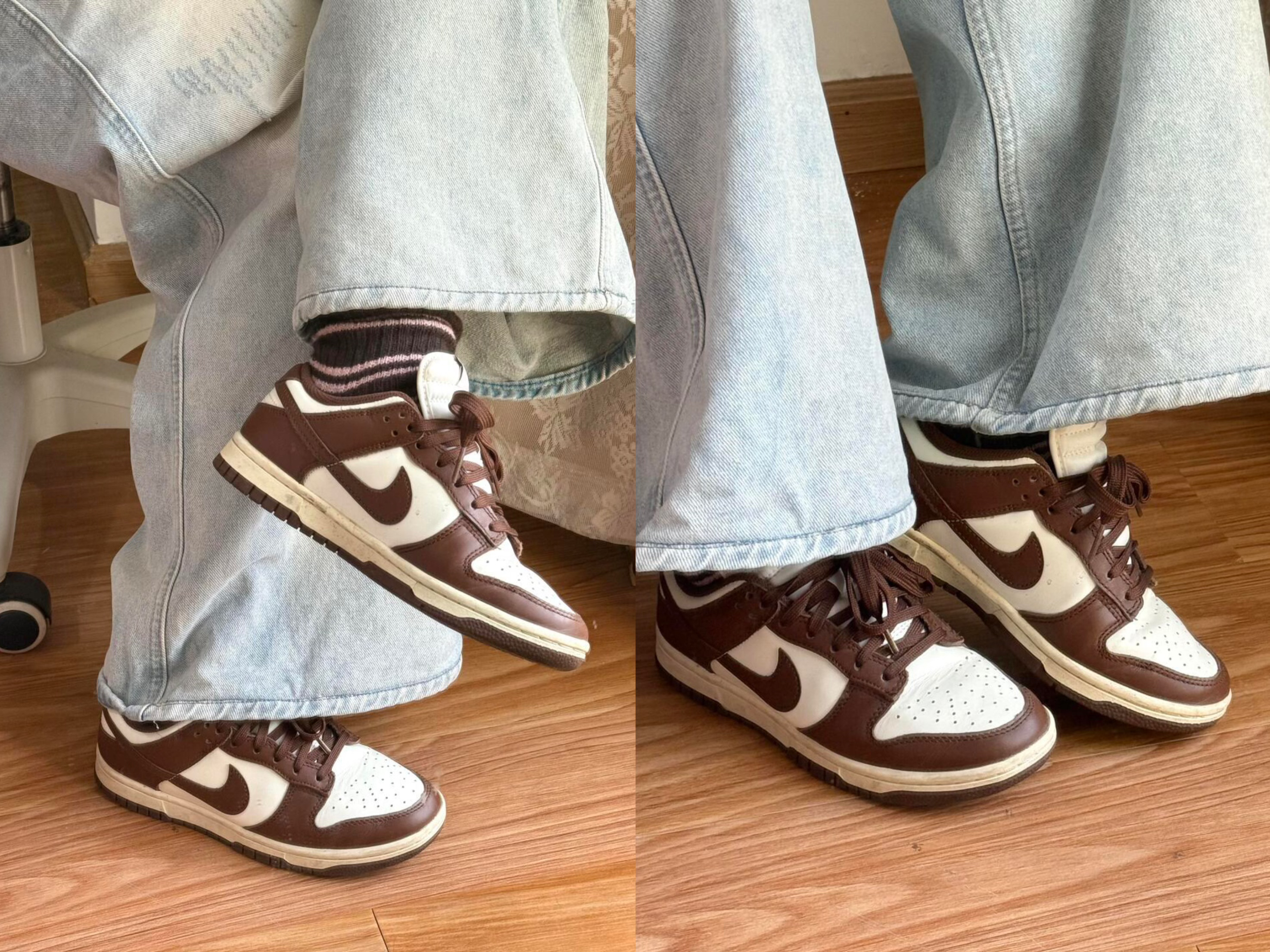 这双Nike Dunk棕白配色我穿了快一个月,整体很适合日常通勤。皮革鞋面质感不错,走线工整,鞋头的透气孔能缓解闷脚感。鞋底偏硬,走路久了会有点累,但支撑性不错,适合短途出行。棕白配色很百搭,搭配牛仔裤、运动裙都很和谐,日常出街很省心。新鞋前两次穿有点磨脚踝,需要穿长袜过渡一下,整体是一双耐看又实用的鞋款。