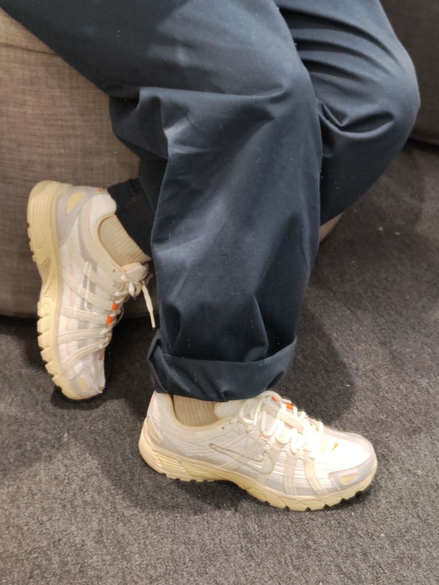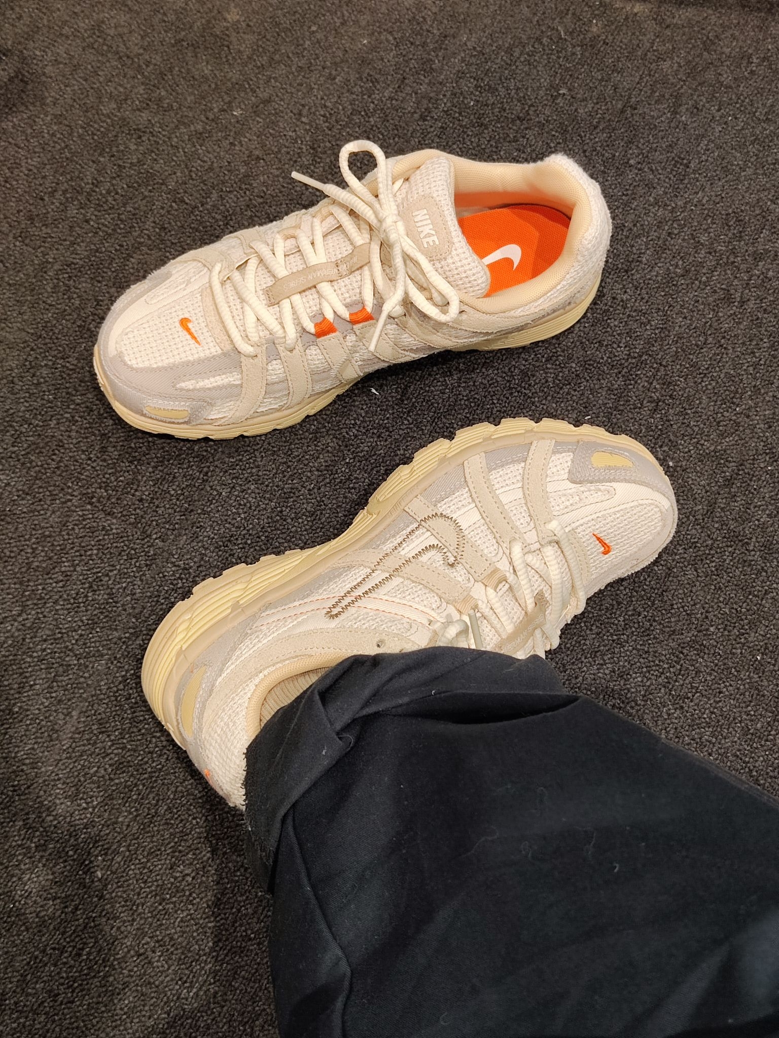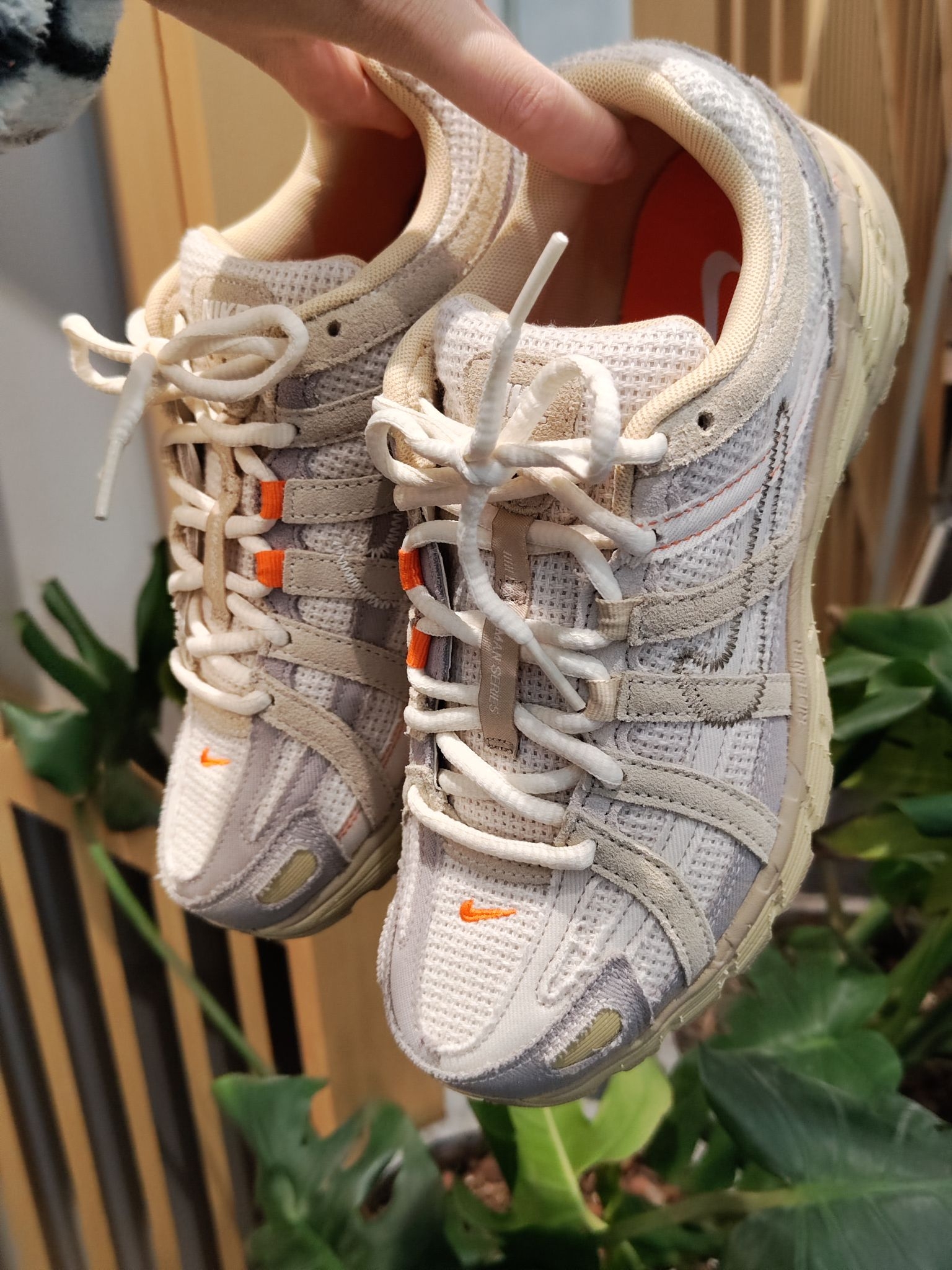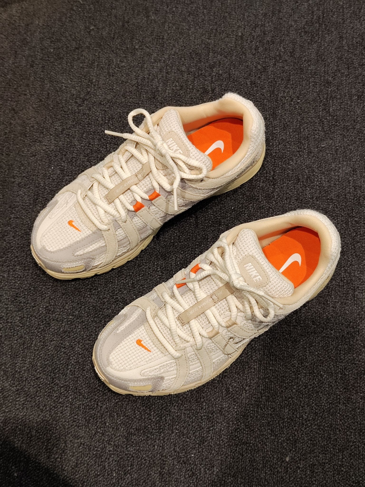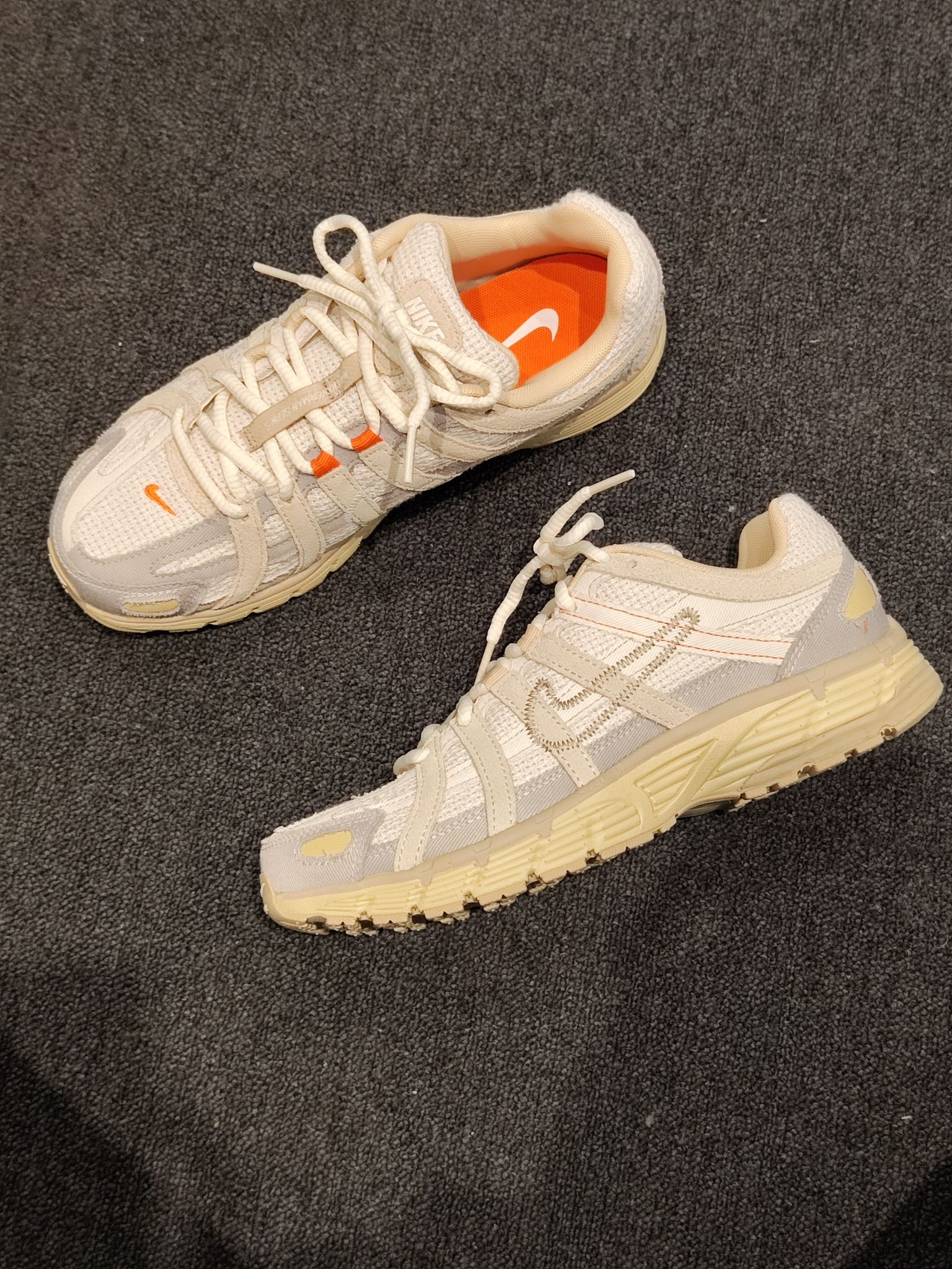 终于蹲到这双Nike P-6000米白橙配色!奶呼呼的米白色鞋面搭亮眼的橙勾内衬,复古解构风直接拉满~鞋身的网布+麂皮拼接质感超棒,脚感也很轻软,日常搭牛仔裤、运动裤都超百搭,复古鞋控真的会爱惨