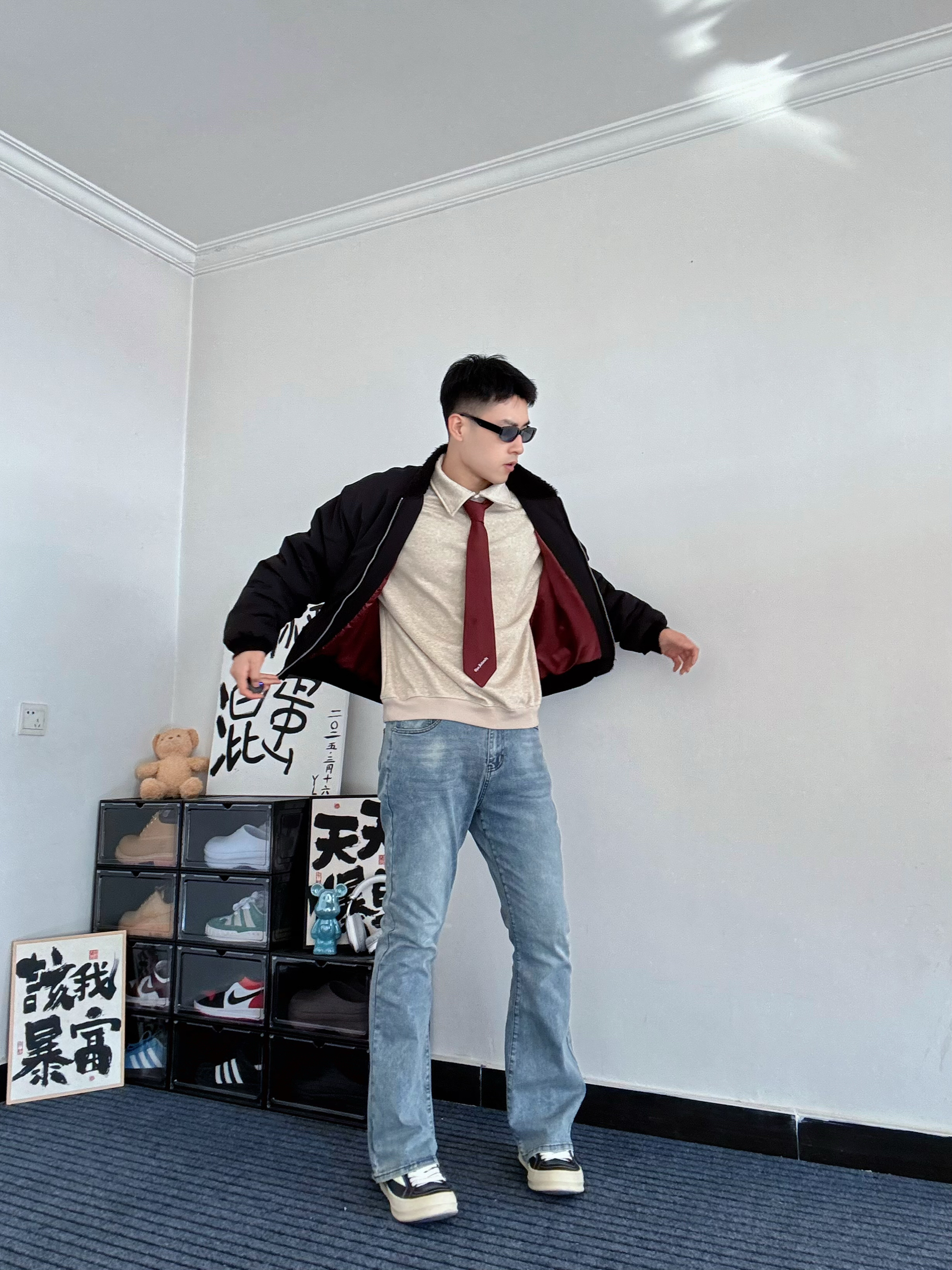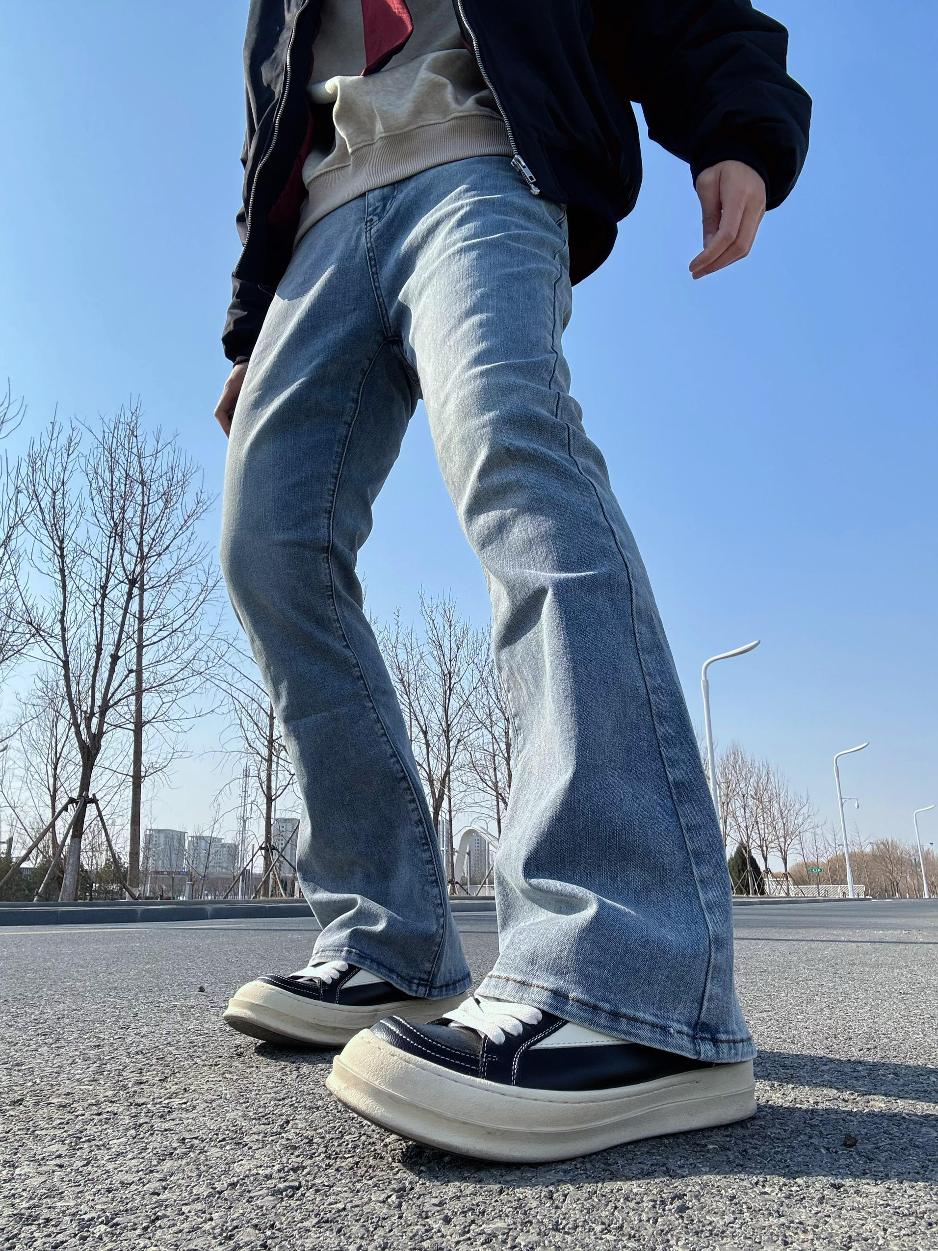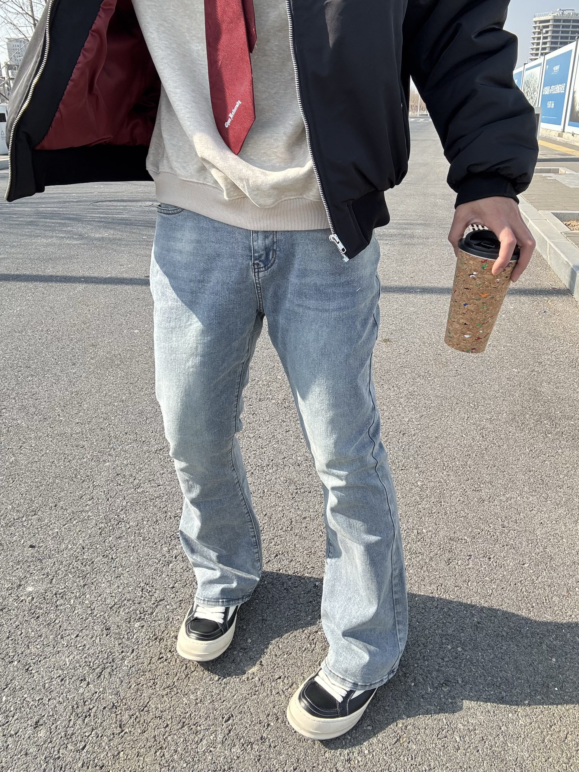 这条微喇牛仔裤算是把复古味拿捏住了👖 水洗做旧很自然,中腰版型把腿衬得又长又直 裤脚微微散开,走路带点风,刚好盖住鞋面 上身搭件黑色飞行夹克,红色内里露出一小截 卡其Polo衫系条红领带,增加点层次感 脚踩黑色RO板鞋,再架上墨镜🕶️ 干干净净的简约穿搭,带点高智感,很耐看✨ 尺码:180/70 XL
