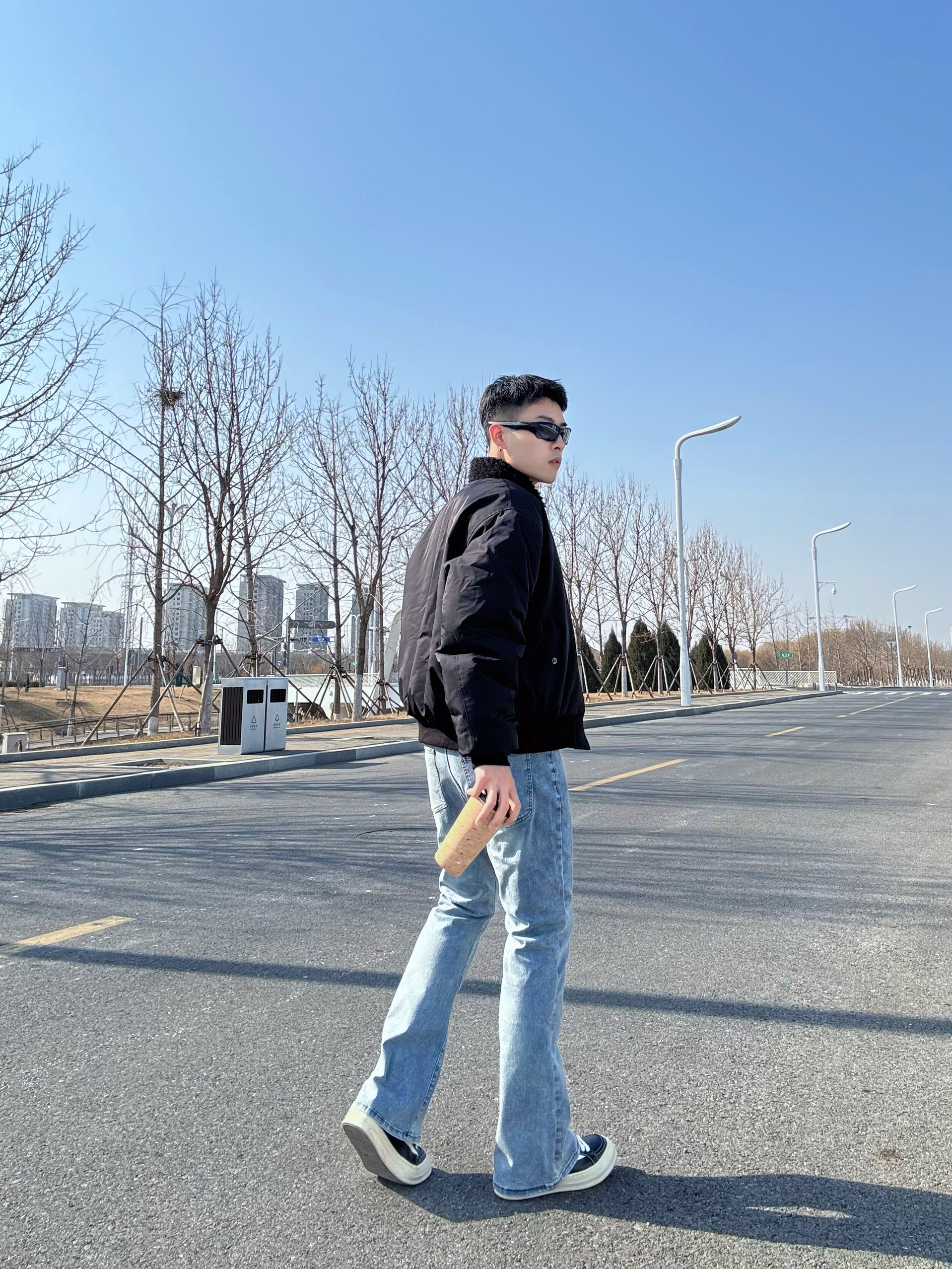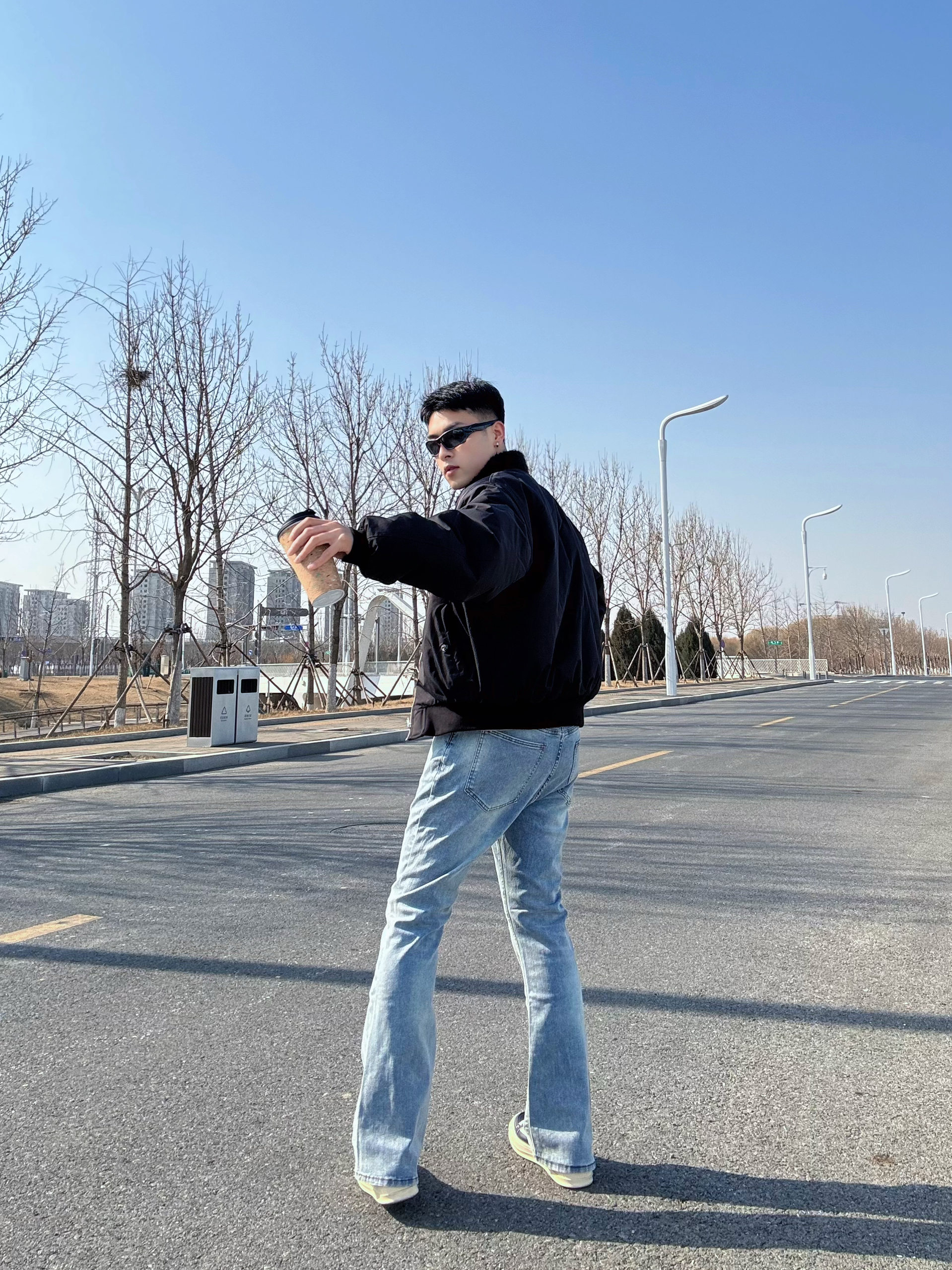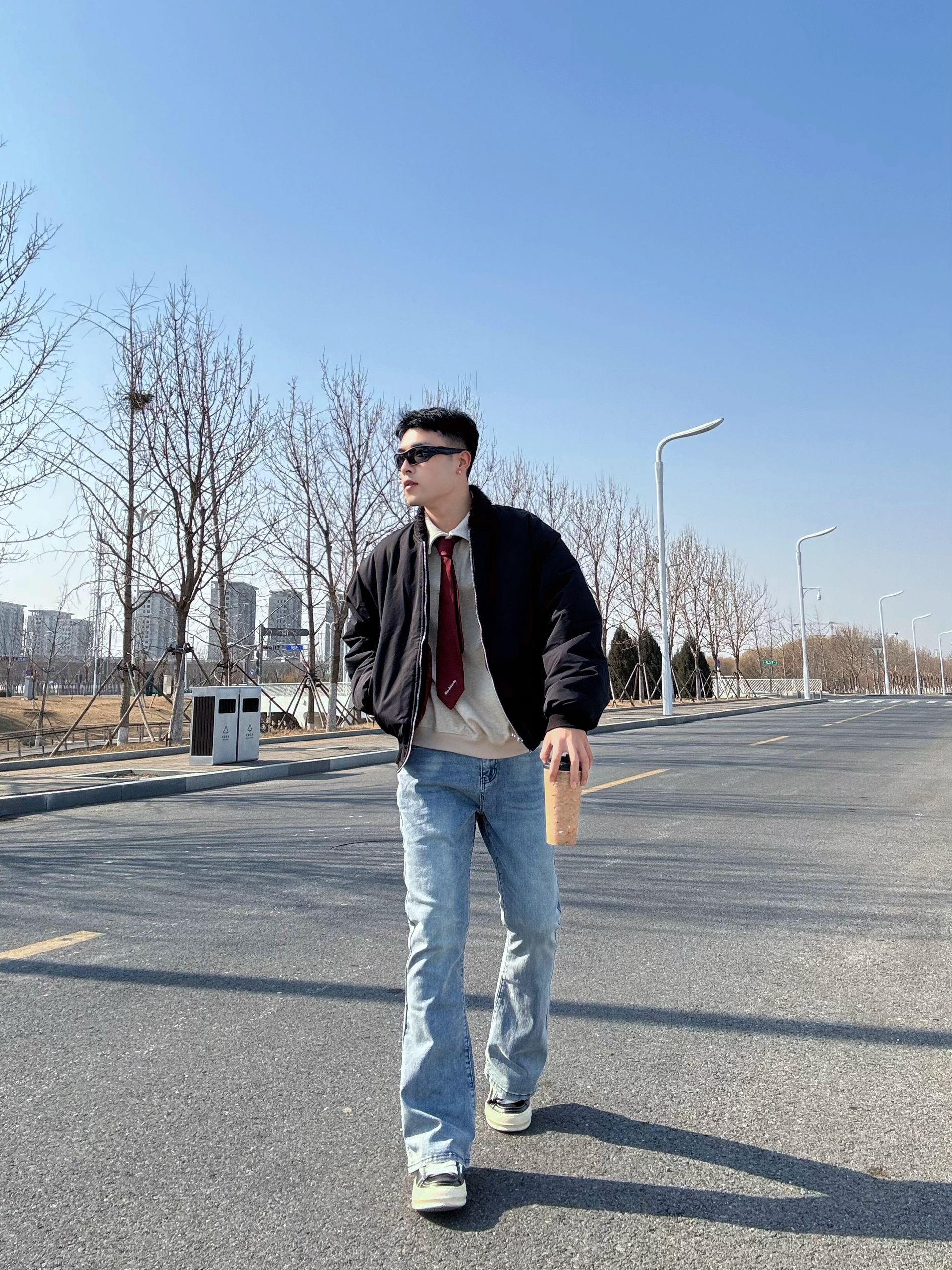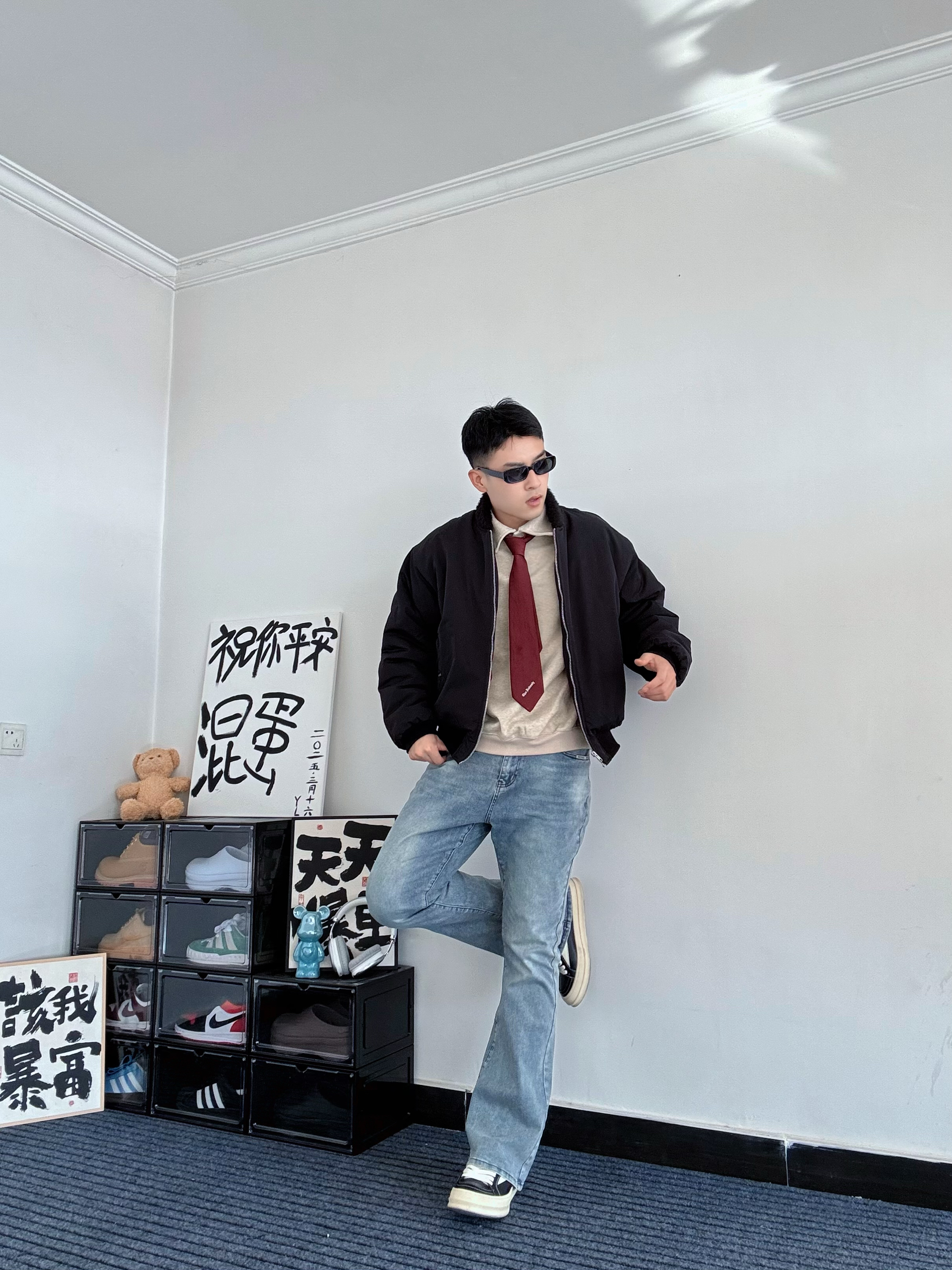 这条微喇牛仔裤算是把复古味拿捏住了👖 水洗做旧很自然,中腰版型把腿衬得又长又直 裤脚微微散开,走路带点风,刚好盖住鞋面 上身搭件黑色飞行夹克,红色内里露出一小截 卡其Polo衫系条红领带,增加点层次感 脚踩黑色RO板鞋,再架上墨镜🕶️ 干干净净的简约穿搭,带点高智感,很耐看✨ 尺码:180/70 XL
