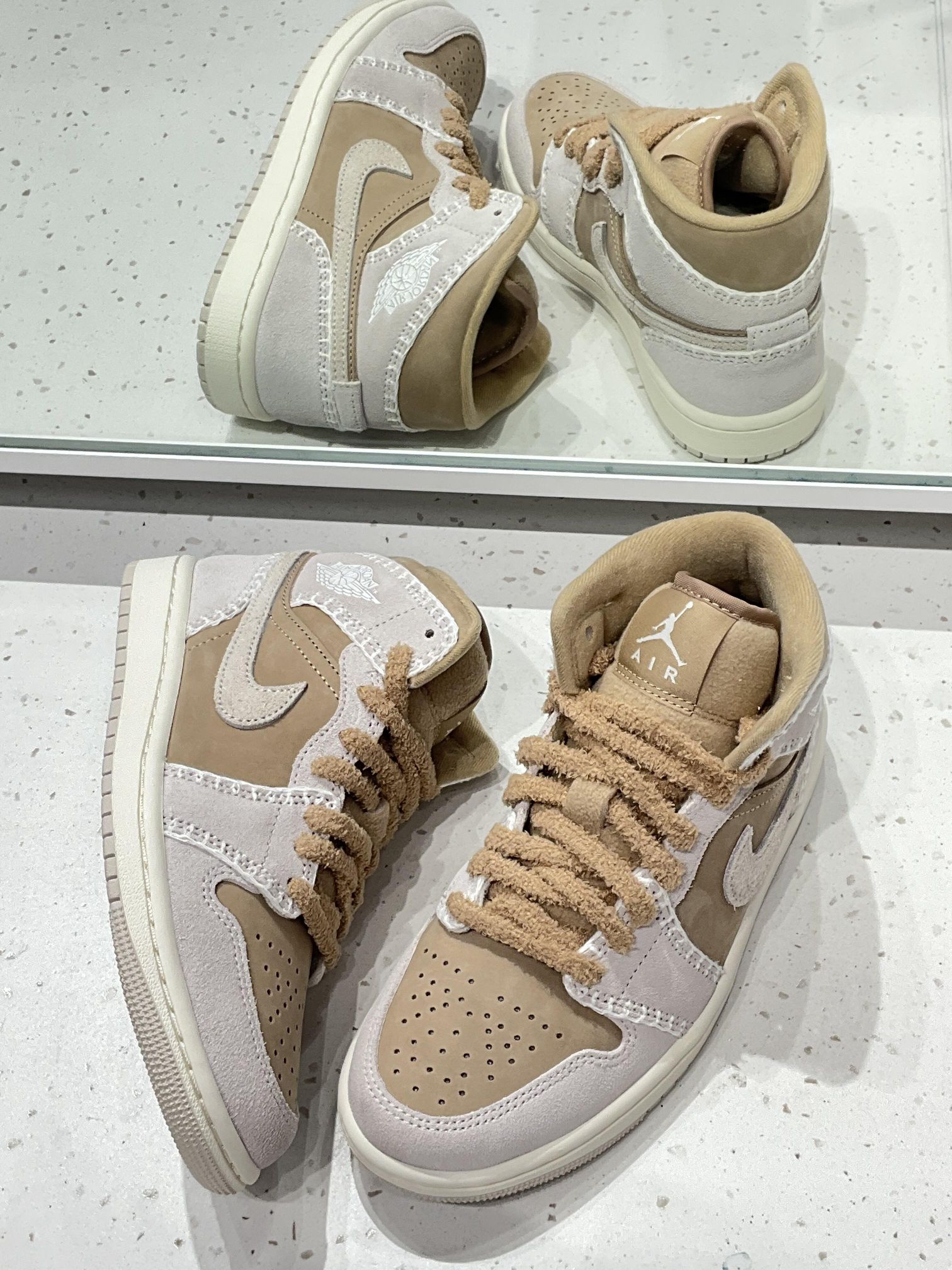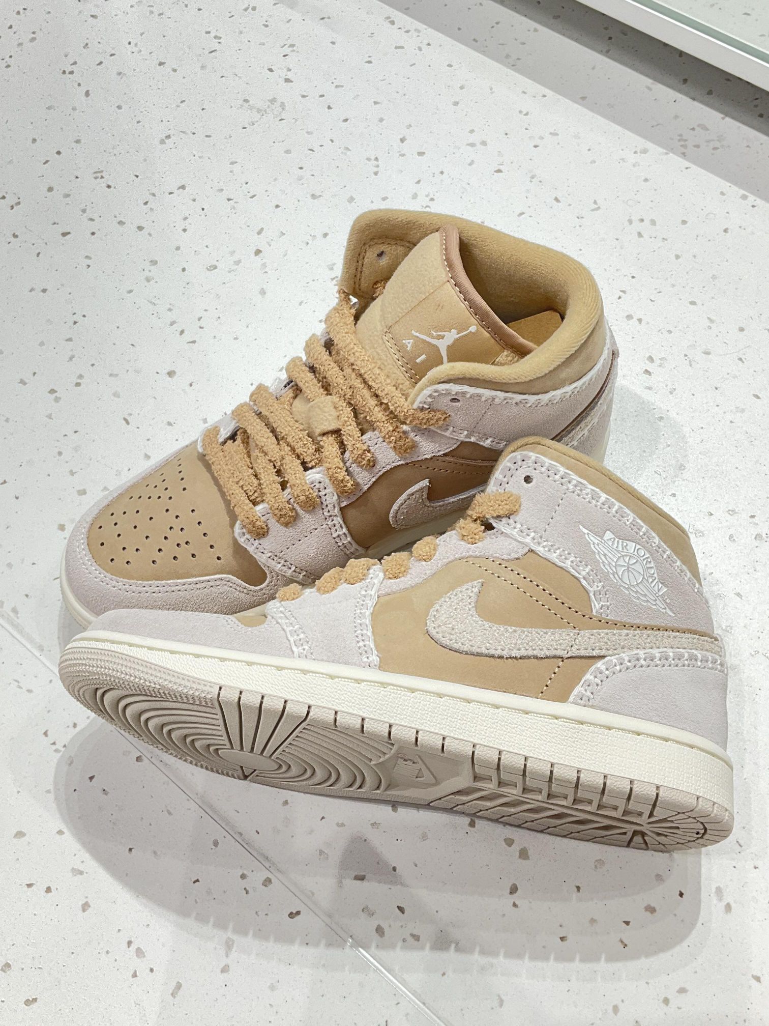 谁懂啊宝子们! Nike乔丹专属命名【奶棕茸绒空军】太戳人😭 浅棕+米白撞色,皮面拼鹿茸面巨有质感✅ 摇粒绒鞋带+鹿茸Logo,软fufu不廉价 中帮显腿细,通勤出街都百搭,闭眼冲就对了!