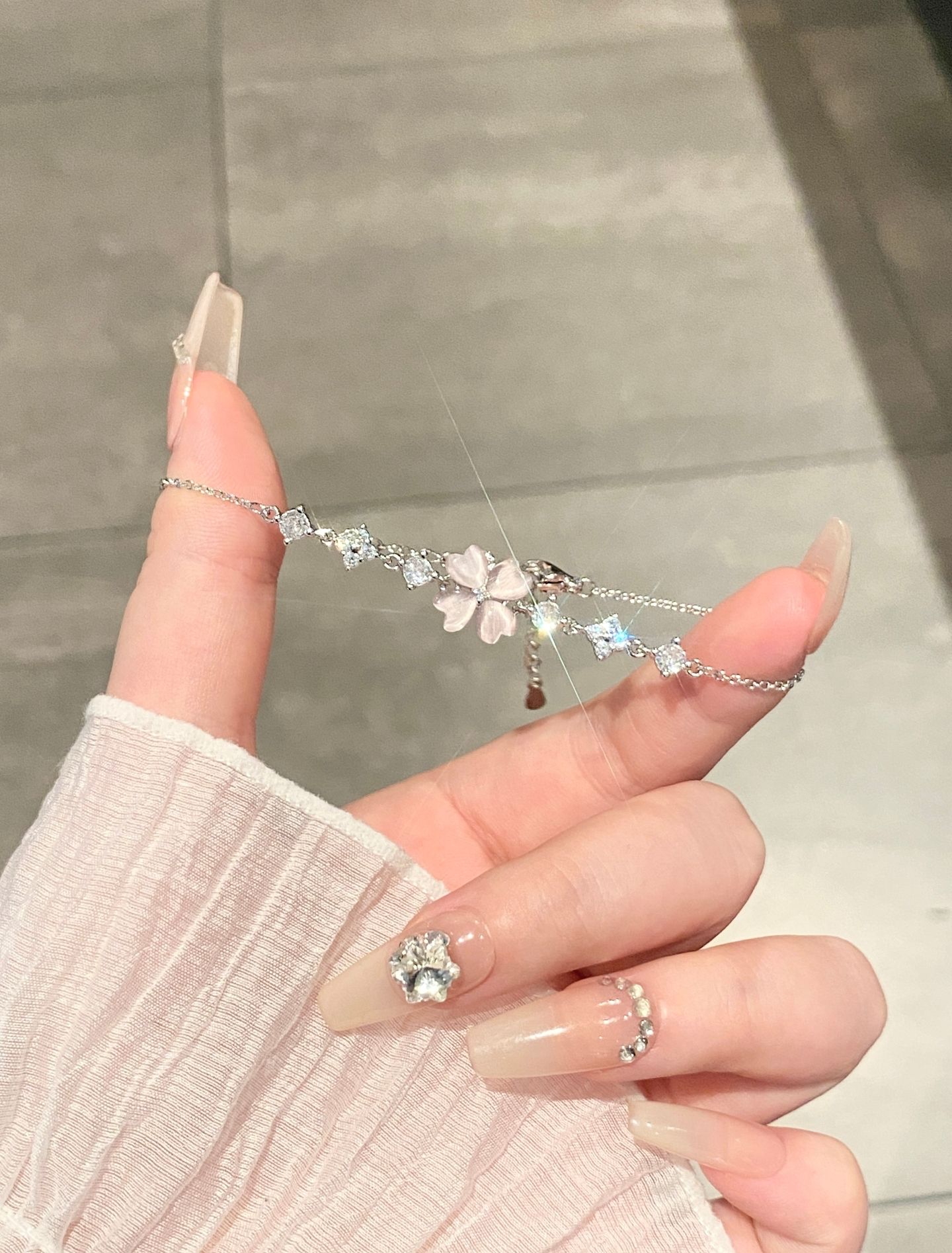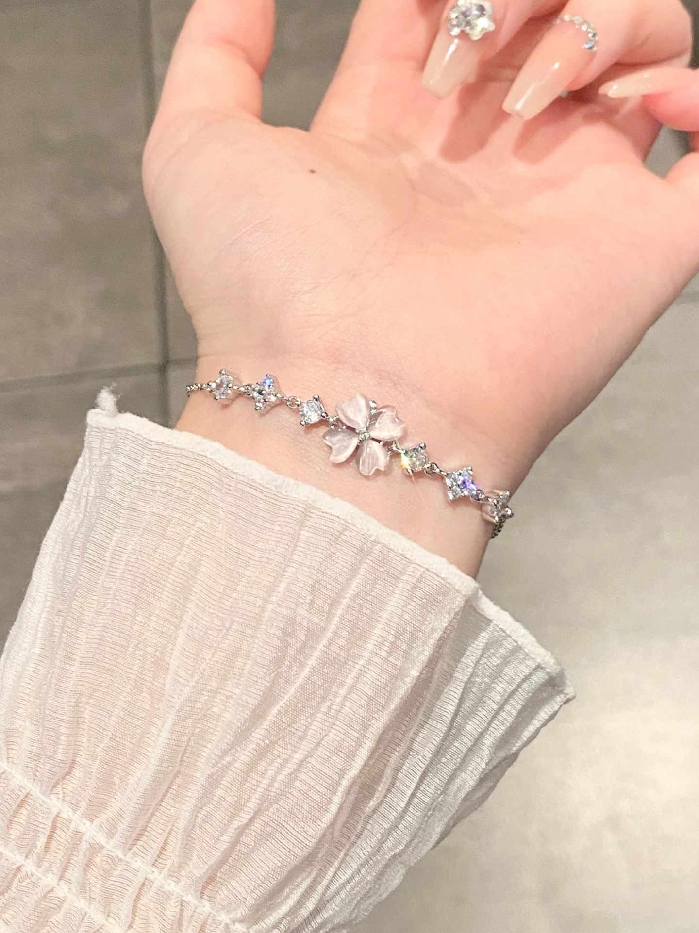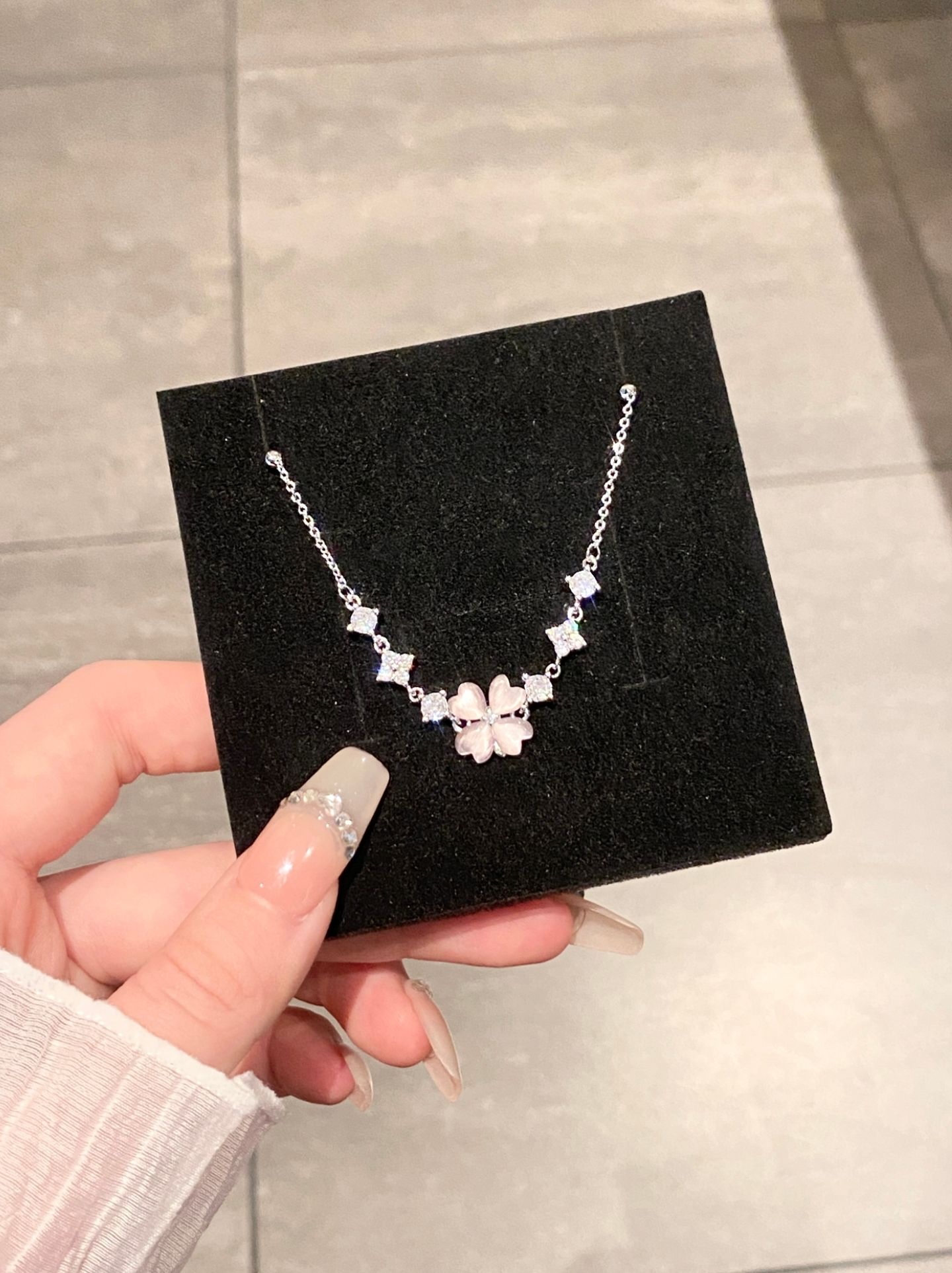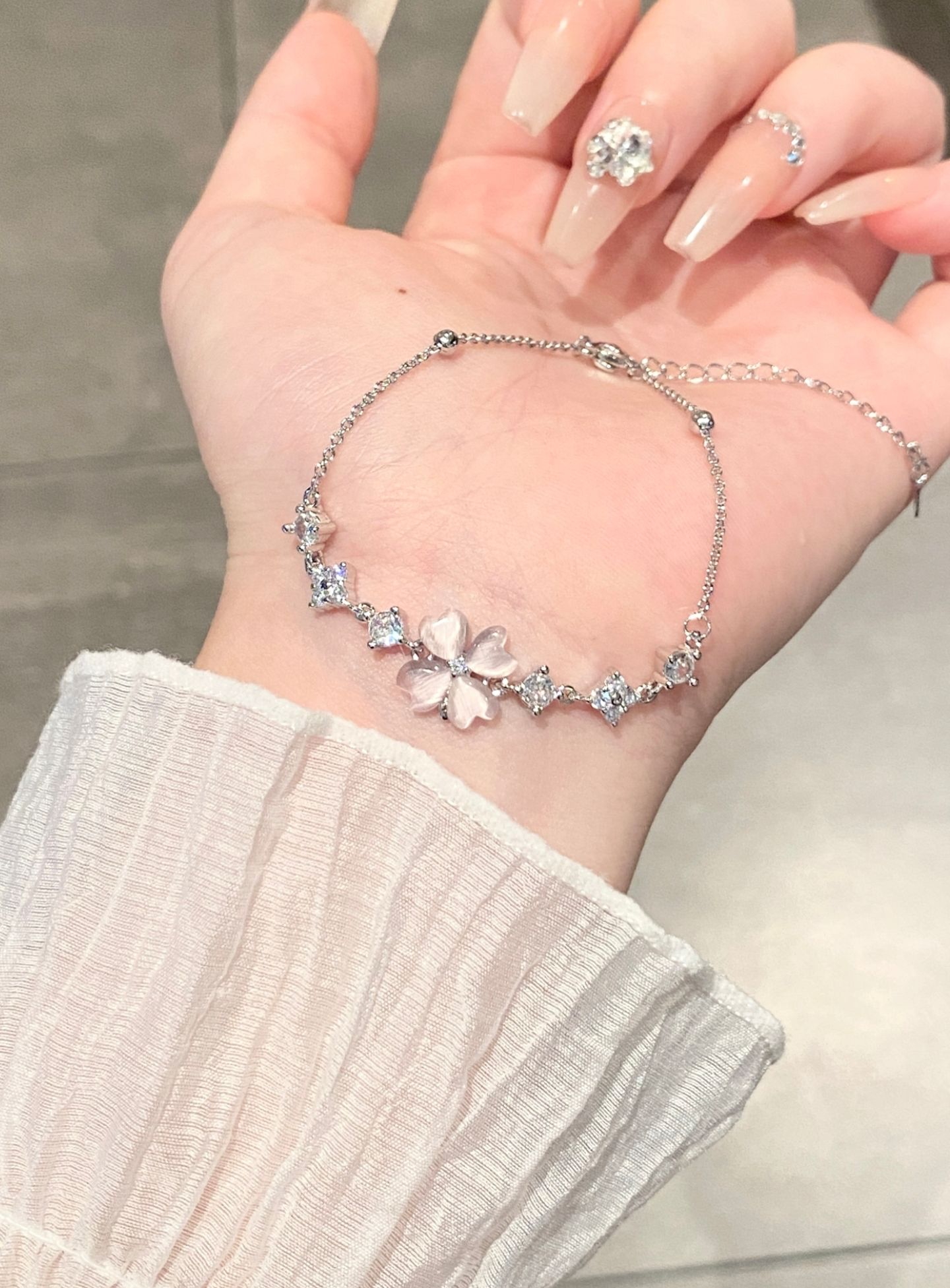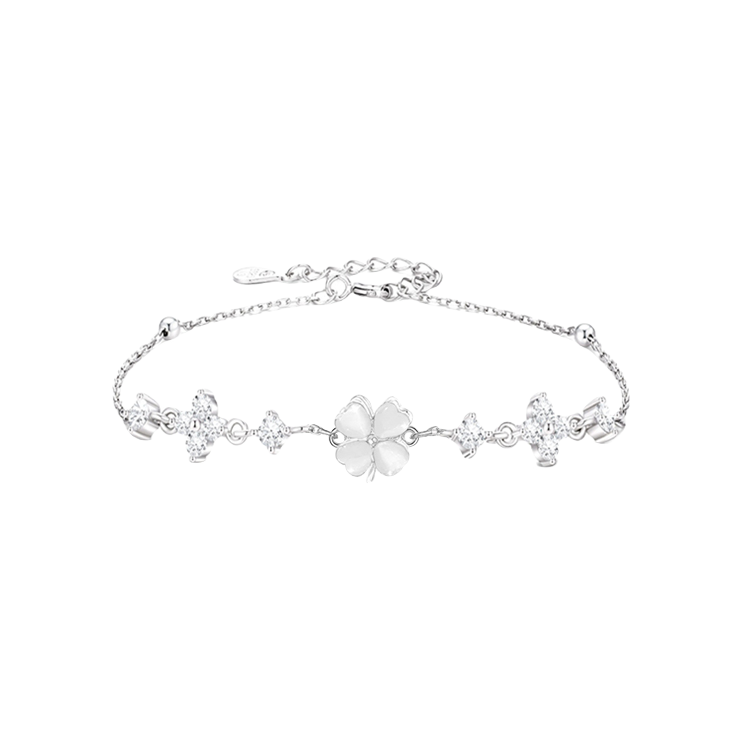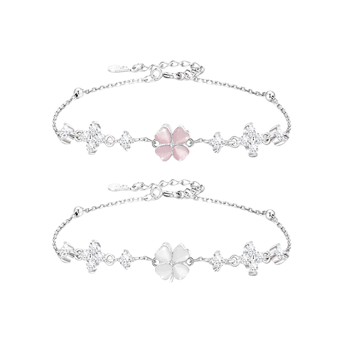 谁能拒绝温柔又显白的四叶草饰品啊! 粉白渐变四叶草+细闪小钻,阳光下巨好看, 质感完全不输大牌,日常戴超百搭。 手链可调节大小,细链条很显手腕细, 同款项链配小裙子、T恤都很绝, 一套戴直接拉满精致感~