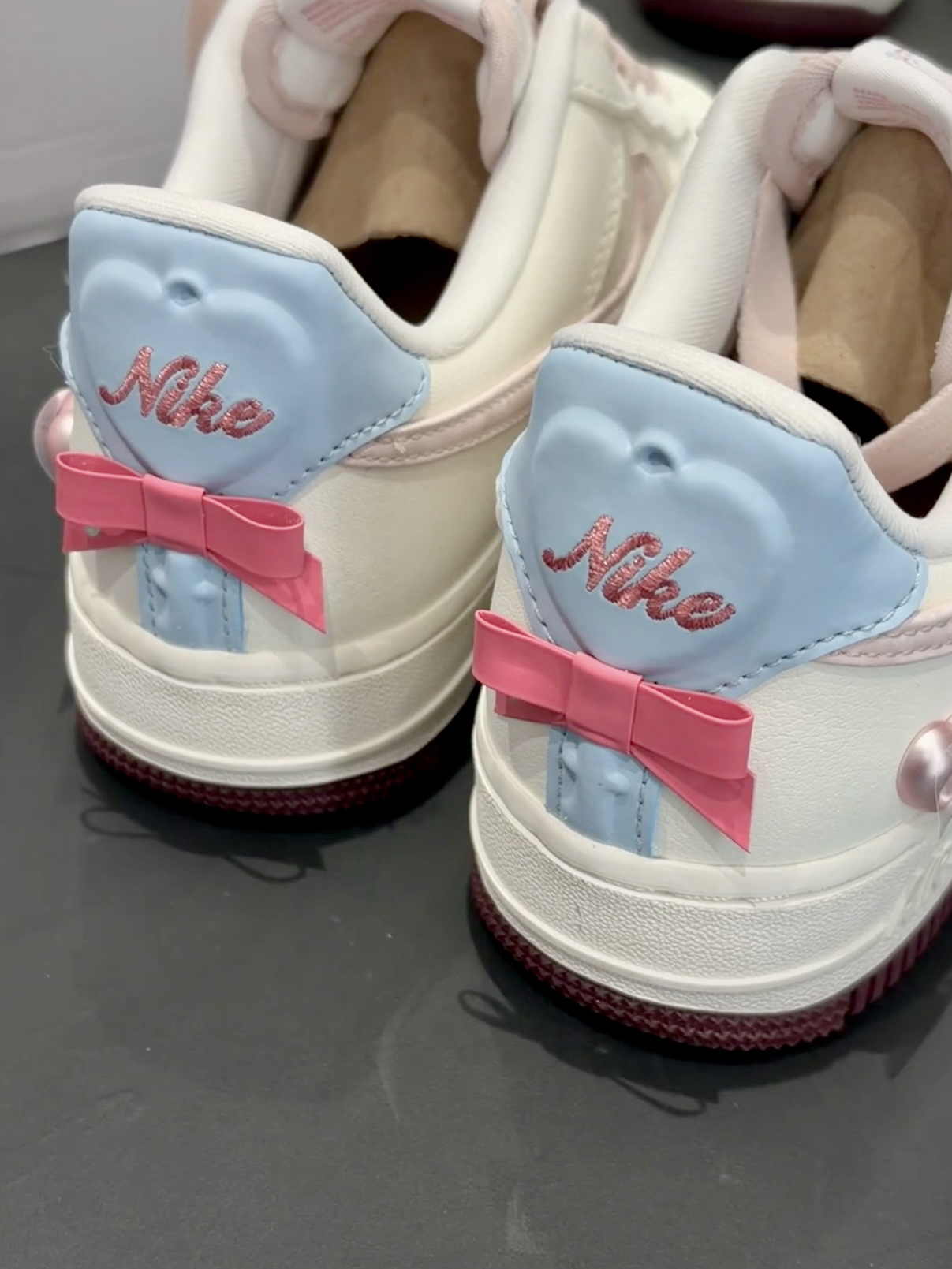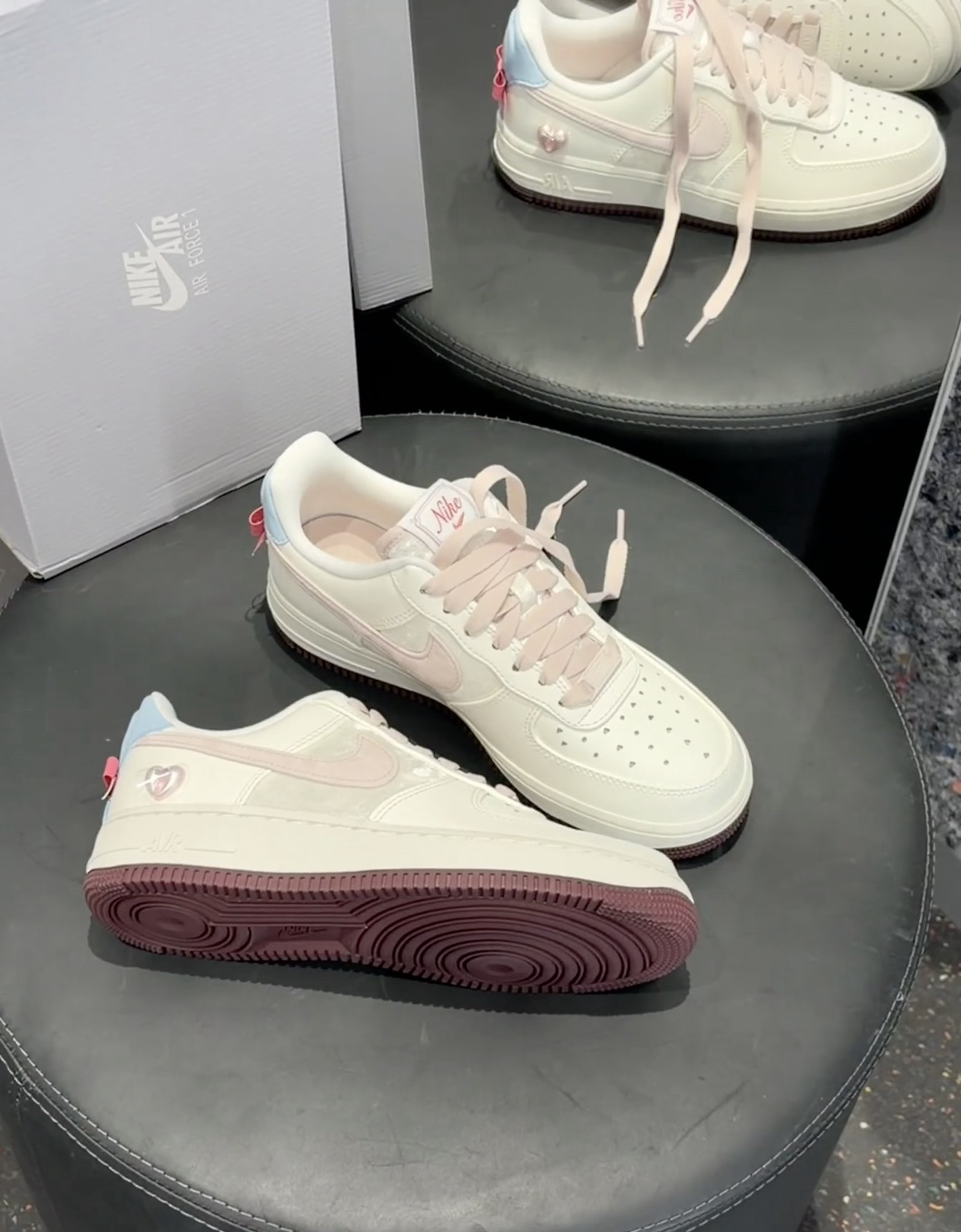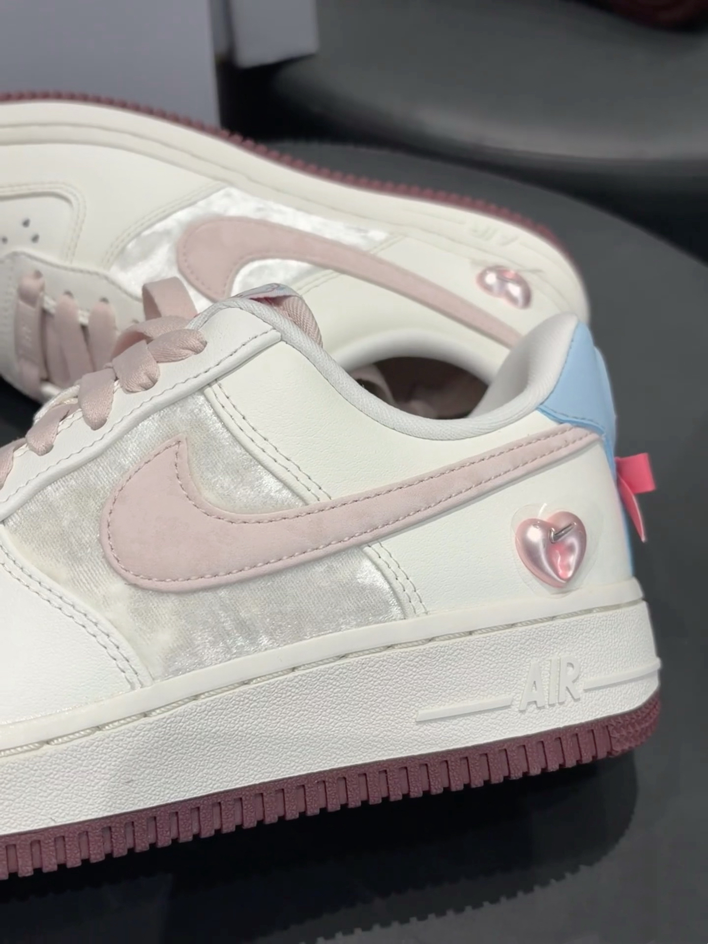 🎀主色是干净的奶白色,搭配柔雾粉Swoosh,温柔又不甜腻 🎀后跟淡蓝+浅粉撞色,还有一颗金属爱心挂饰,细节拉满 🎀深紫色外底做了撞色收尾,让整体造型更有层次,不会太单调