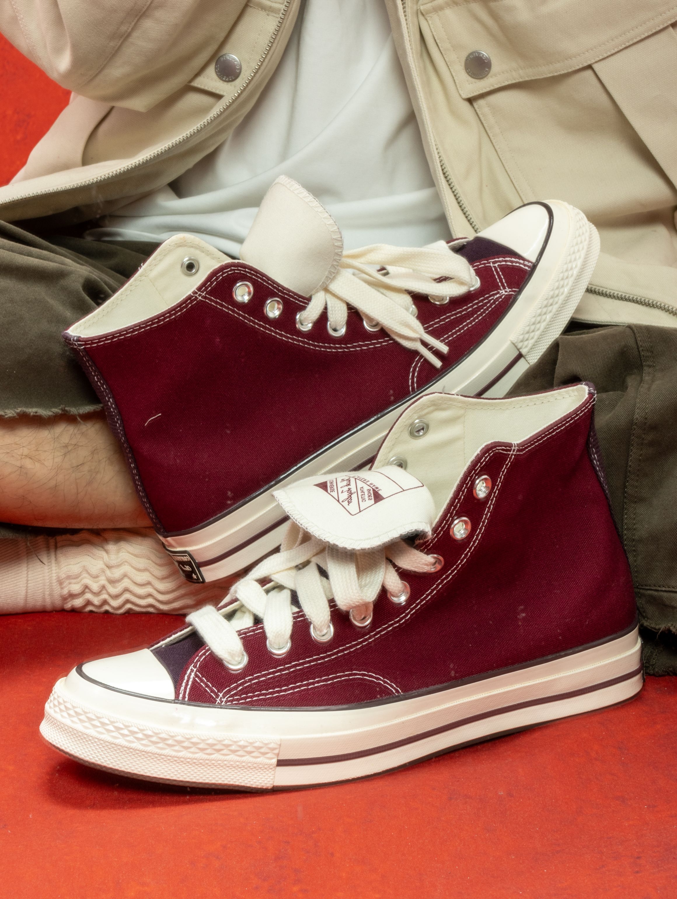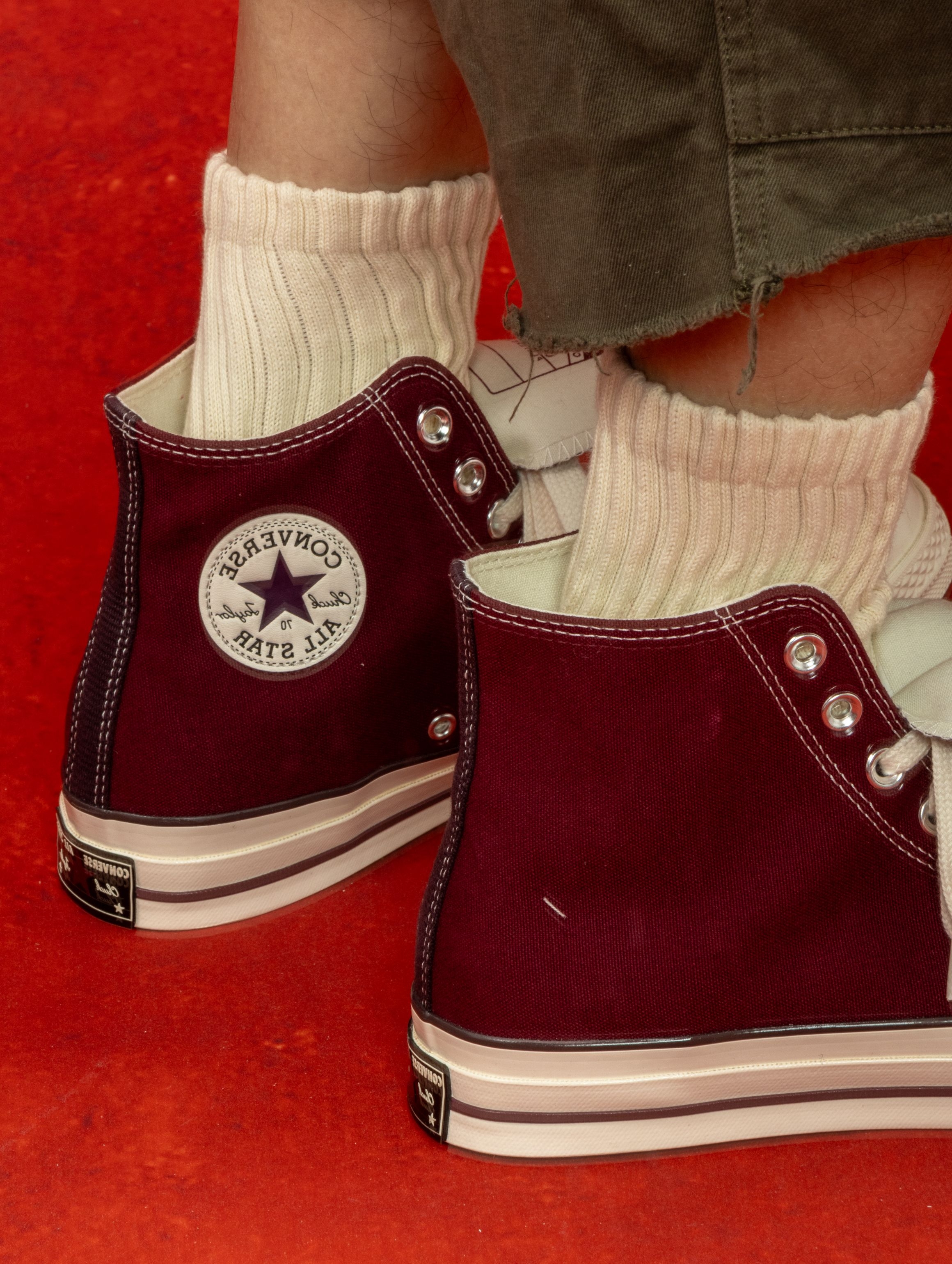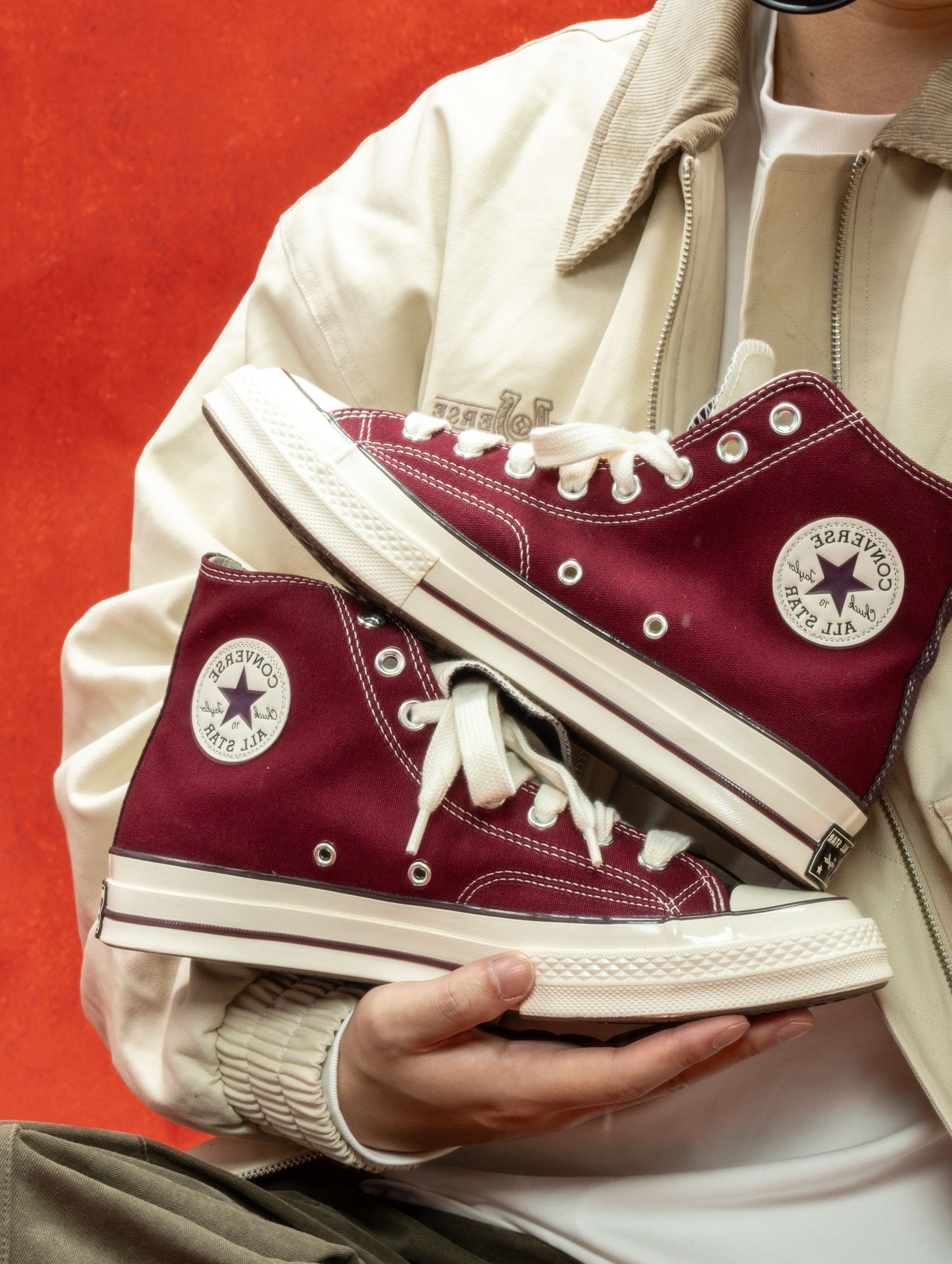 匡威这双深紫红色实物太绝了!在店里挂着的时候还犹豫,上脚一试直接走不动道😂 颜色像陈年的红酒渍染进帆布里,暗光下是深紫,阳光下透出隐隐的红调。1970s鞋型懂的都懂,加厚鞋垫软弹适中,高帮裹住脚踝刚刚好,完全不勒。 一双能从秋天穿到春天的鞋,要的就是这种越旧越有味道的感觉。