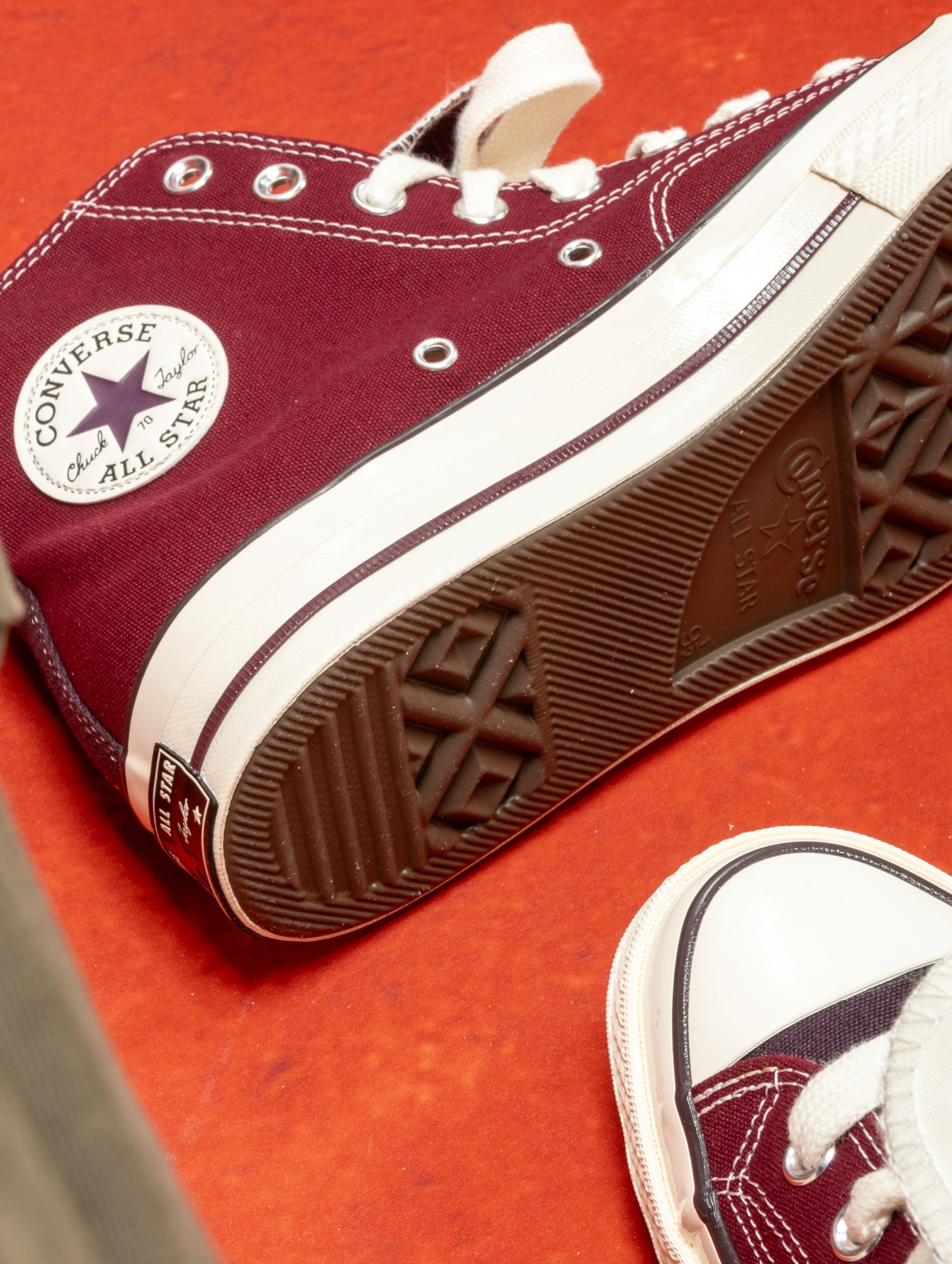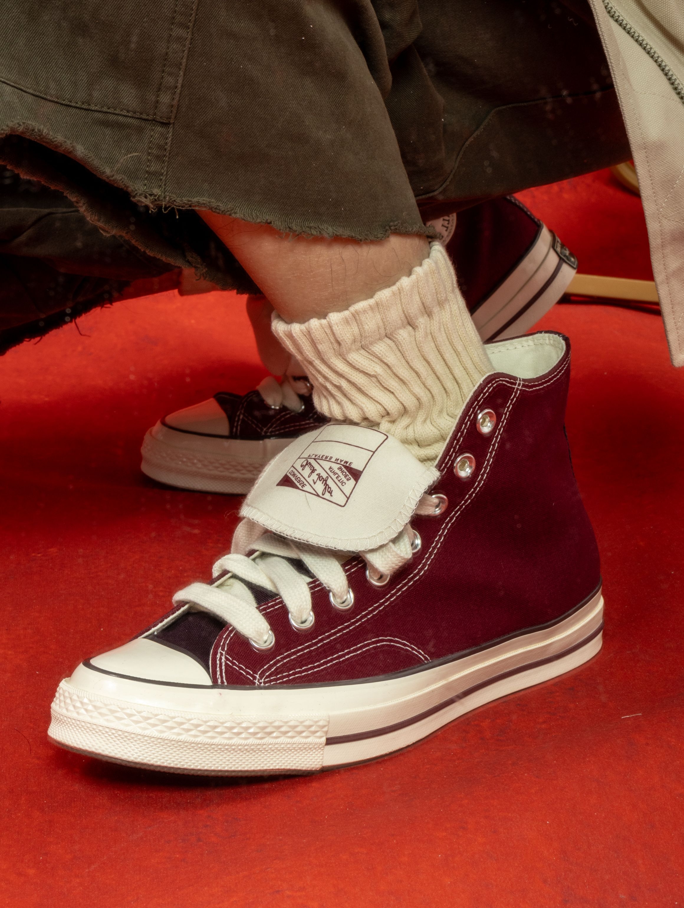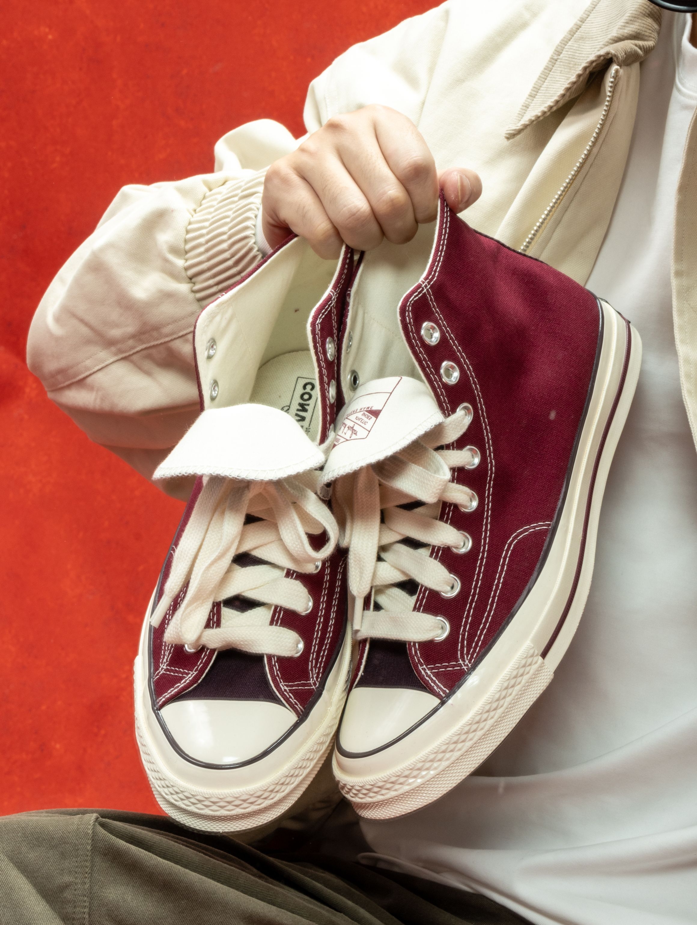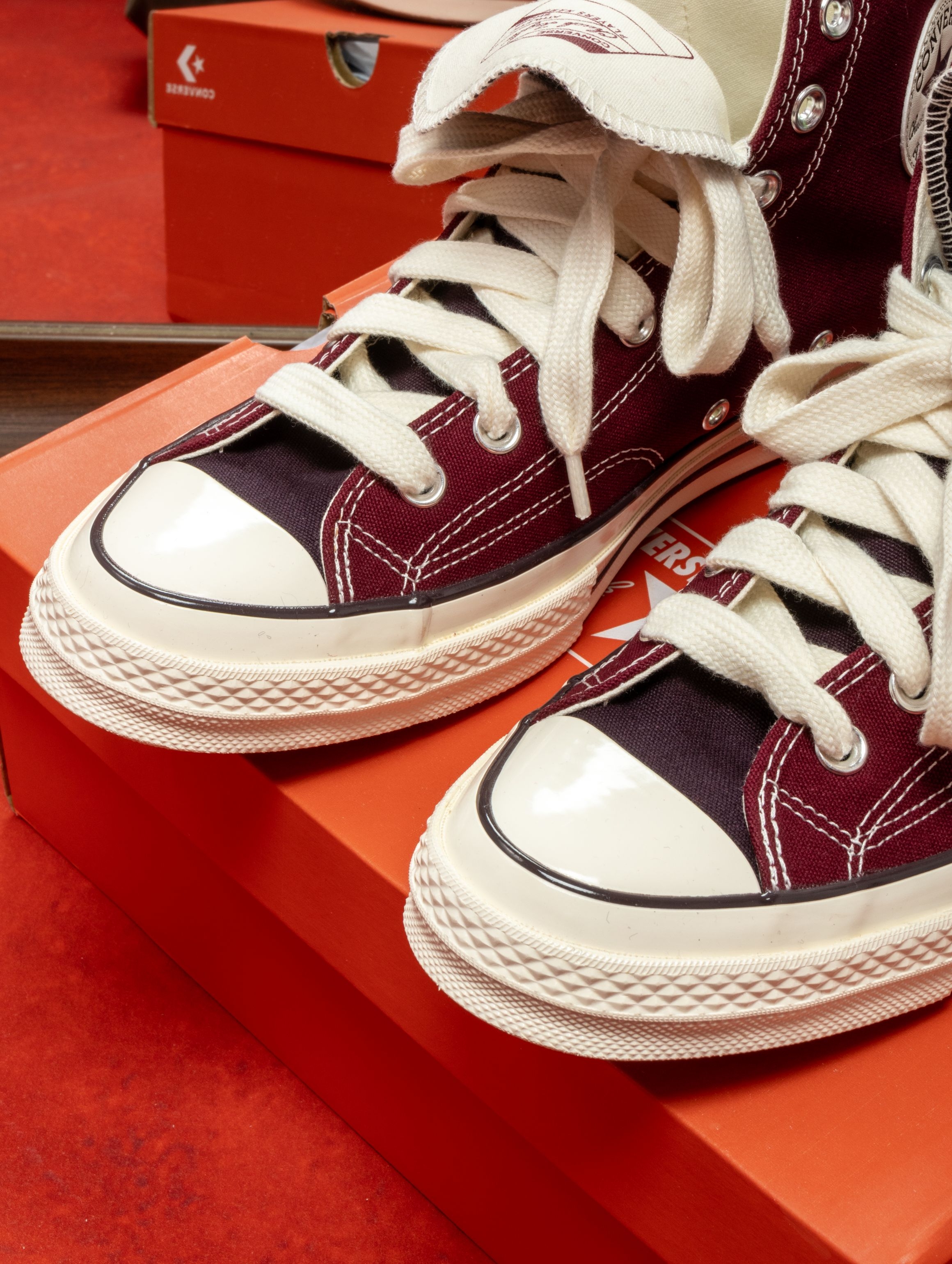 匡威这双深紫红色实物太绝了!在店里挂着的时候还犹豫,上脚一试直接走不动道😂 颜色像陈年的红酒渍染进帆布里,暗光下是深紫,阳光下透出隐隐的红调。1970s鞋型懂的都懂,加厚鞋垫软弹适中,高帮裹住脚踝刚刚好,完全不勒。 一双能从秋天穿到春天的鞋,要的就是这种越旧越有味道的感觉。