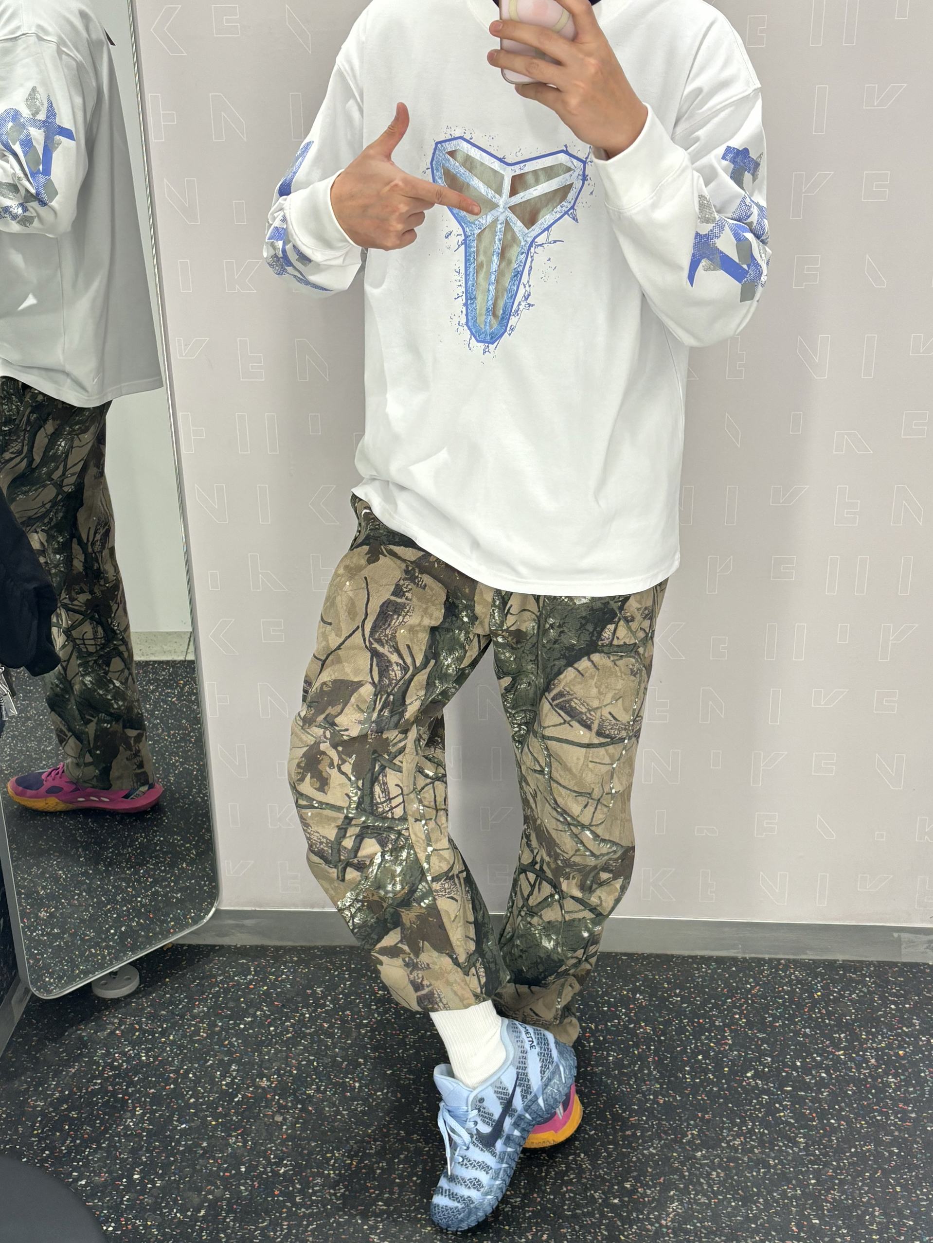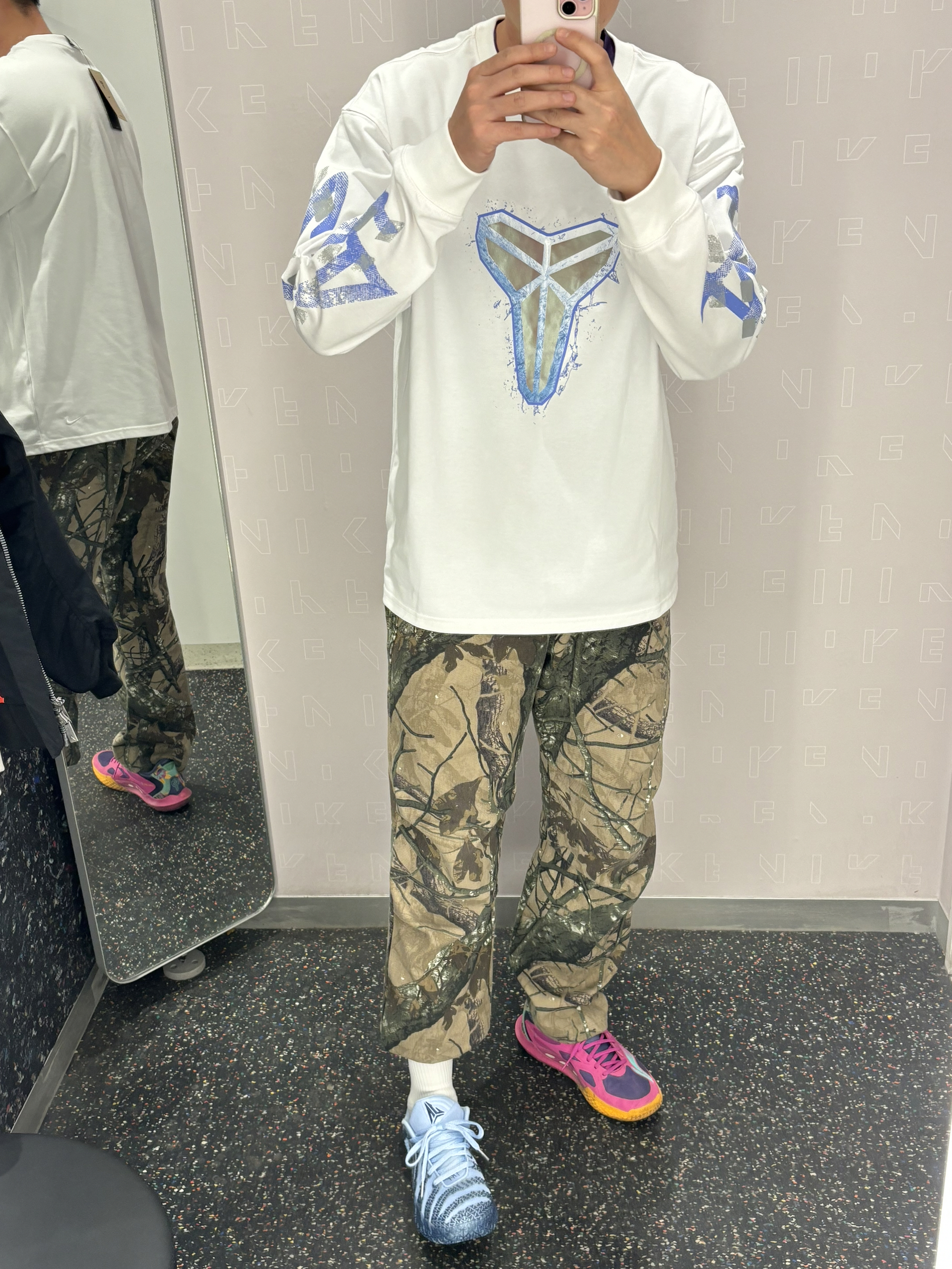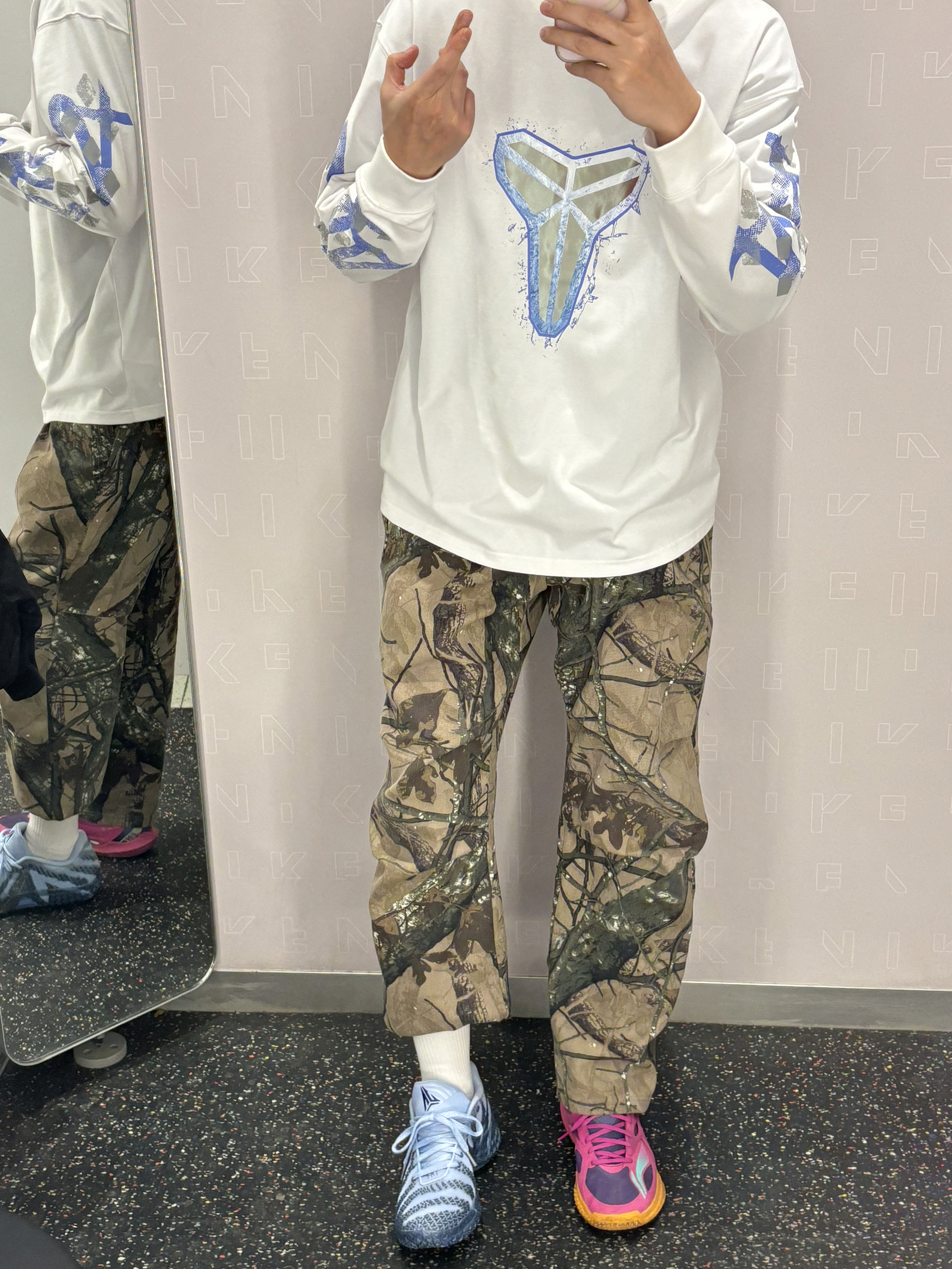 2026年nba全明星赛我就穿这套去了 户外迷彩风的直筒裤就很有气质 小细节还是有的褶皱的纹理感 淡绿色迷彩风很有感觉 搭配一件冰蓝色🧊曼巴logo长袖 有种冰冷的气息 搭配冰蓝色莫兰特3就很合适 整体就很高冷初春的质感 👔曼巴长袖 👖uzis迷彩直筒裤 👟莫兰特3银蓝色