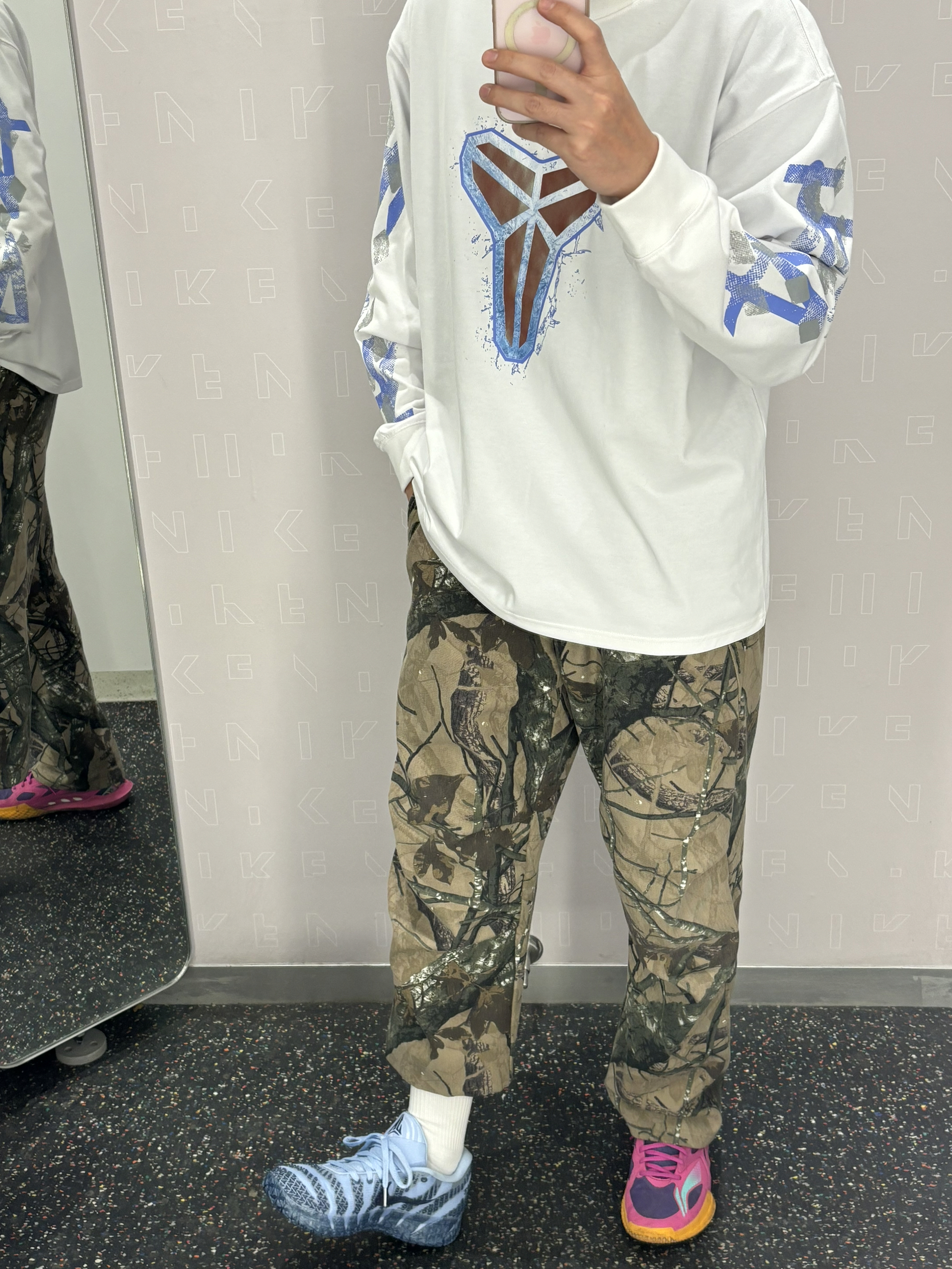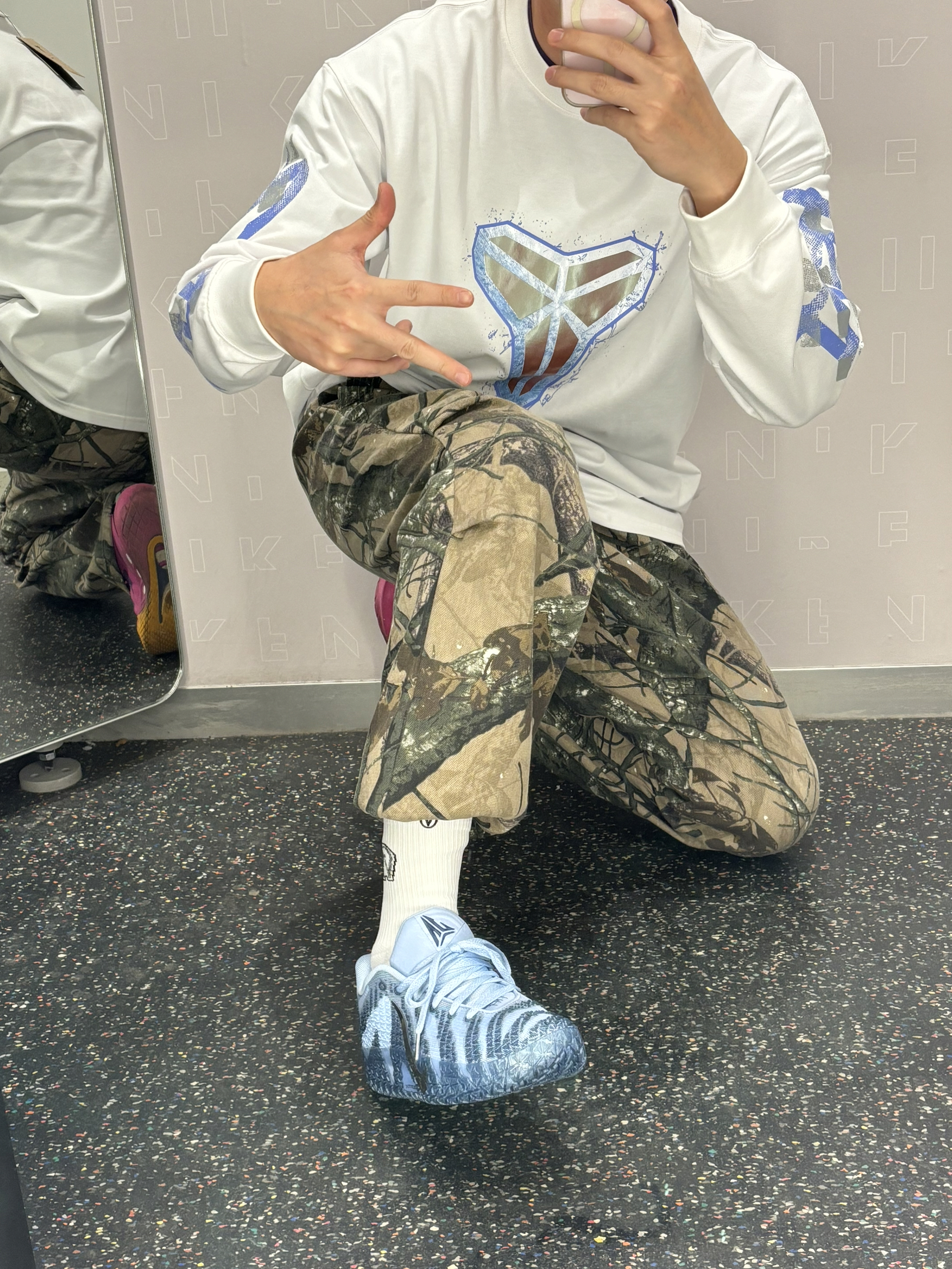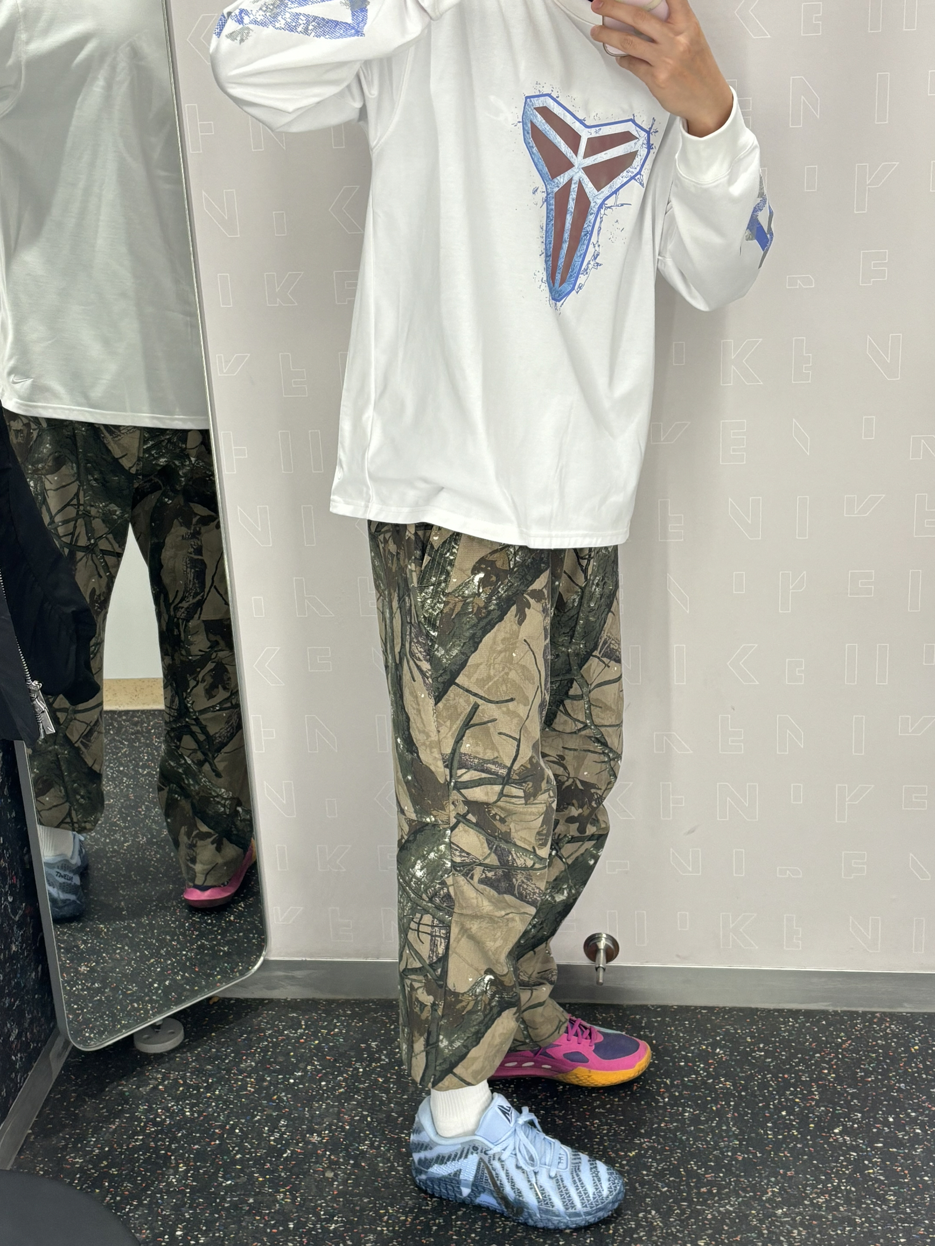 2026年nba全明星赛我就穿这套去了 户外迷彩风的直筒裤就很有气质 小细节还是有的褶皱的纹理感 淡绿色迷彩风很有感觉 搭配一件冰蓝色🧊曼巴logo长袖 有种冰冷的气息 搭配冰蓝色莫兰特3就很合适 整体就很高冷初春的质感 👔曼巴长袖 👖uzis迷彩直筒裤 👟莫兰特3银蓝色