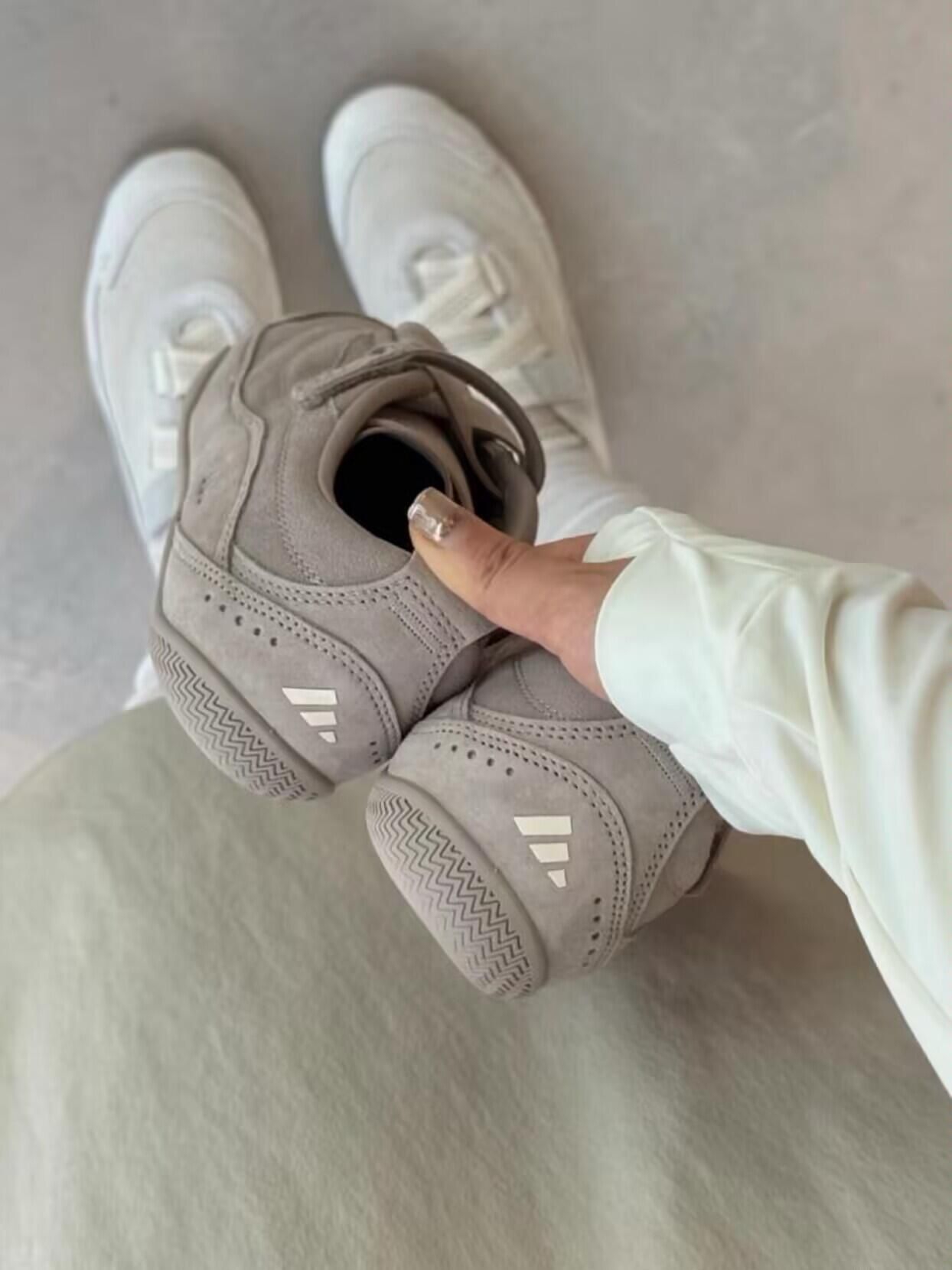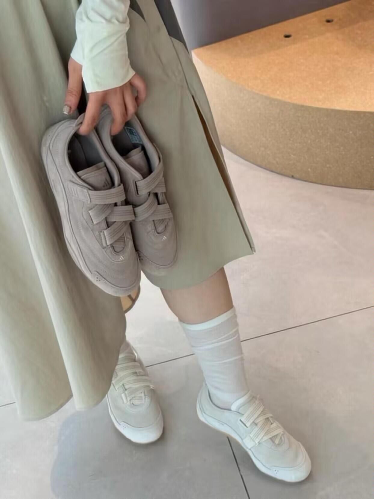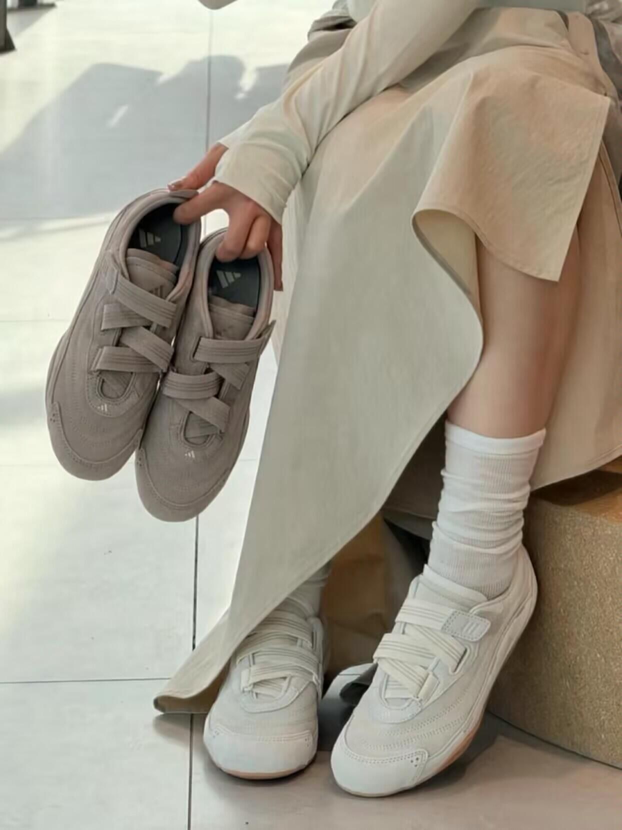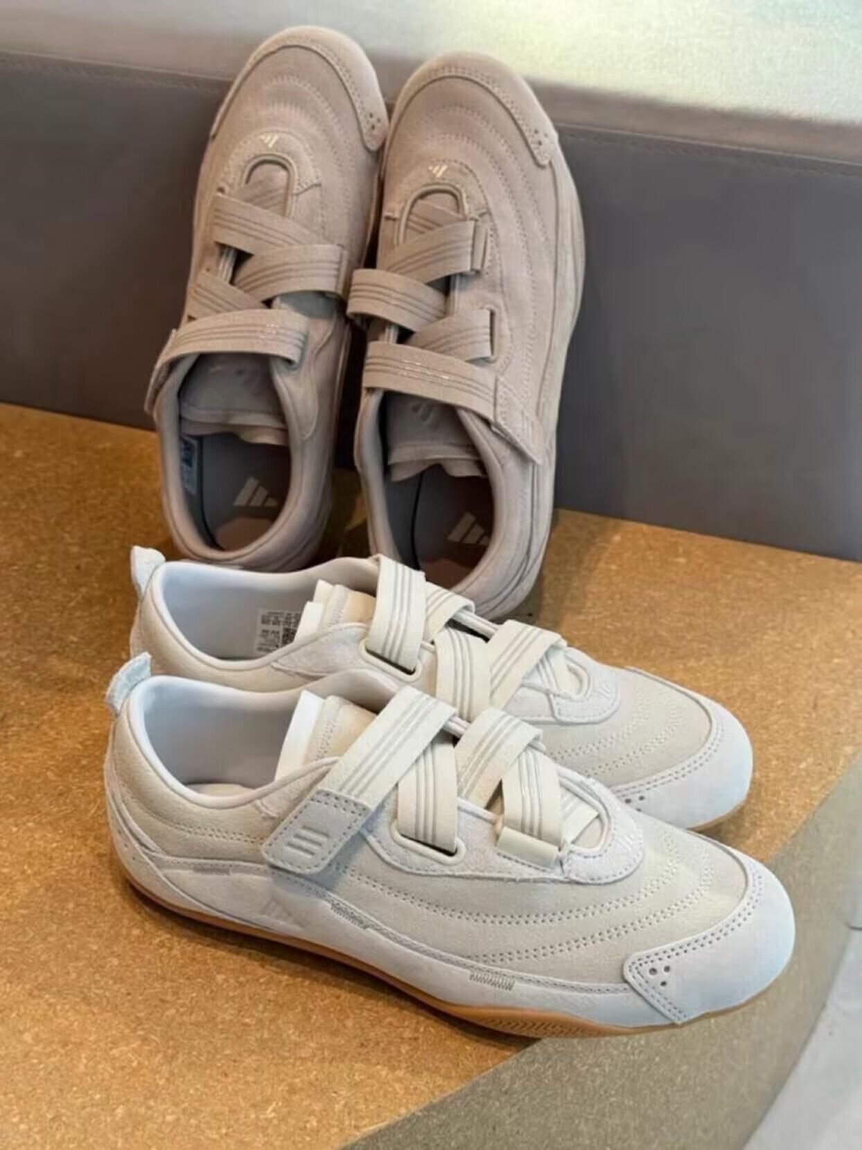 就是这个轻亚感!随着芭蕾风越来越火,阿迪FOS机能系列也推出了全新🩰“芭蕾感”薄底鞋。肯定又是下一个大爆款! 全麂皮鞋面,整个鞋身包括鞋舌都非常柔软,鞋底是复古生胶大底,绑带➕魔术贴设计超级好穿! ps:实物试穿反馈偏大半码