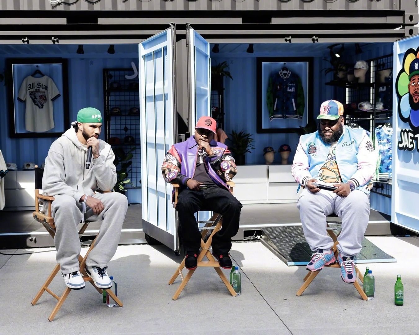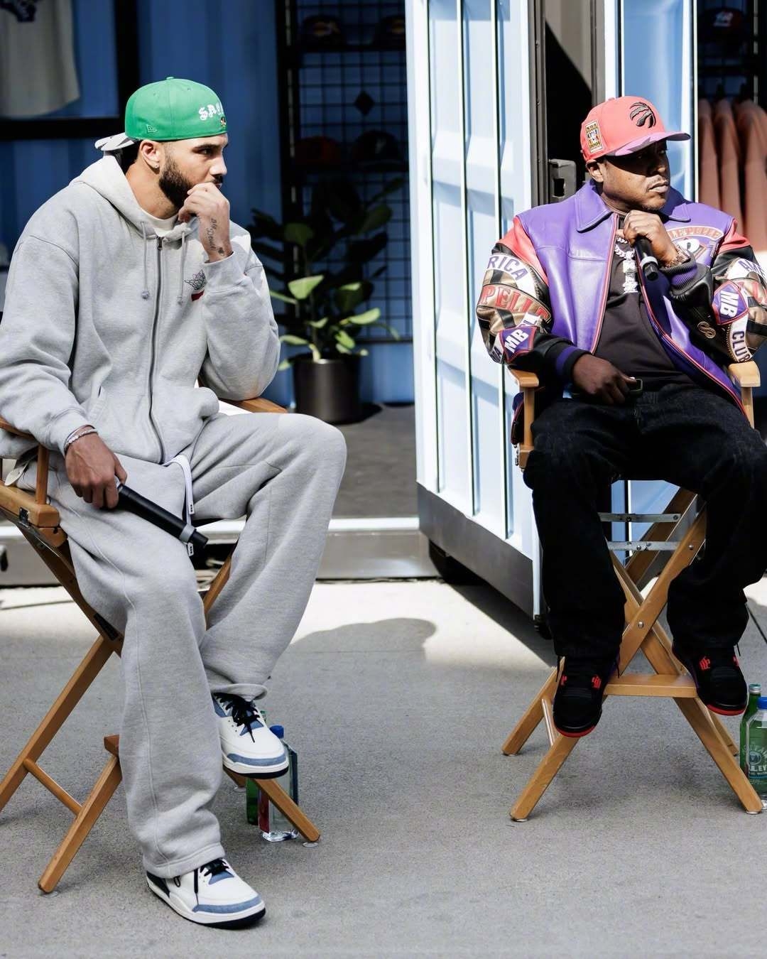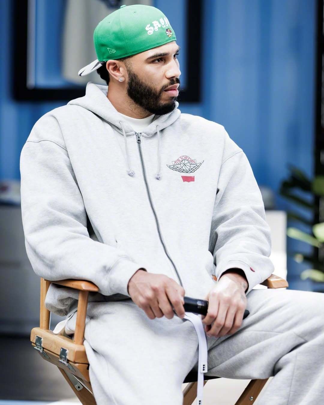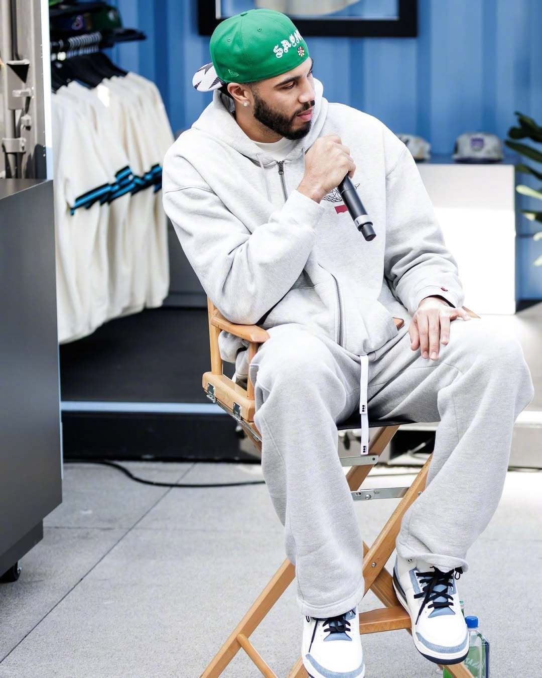 👟 鞋:levi’s × Jordan Air Jordan 3 Retro SP 🧢 帽:New Era 凯尔特人复古棒球帽 👕 衣:浅灰Jordan半拉链连帽卫衣 + 同色束脚卫裤 全明星采访现场,塔图姆用一套浅灰运动套装,把“美式松弛”穿明白了。 连帽衫的小Logo低调不抢戏,AJ3的白蓝撞色刚好点亮全身, 再配上那顶绿帽,既是球队信仰,也是穿搭点睛之笔。 随便一坐,就是采访局的穿搭范...