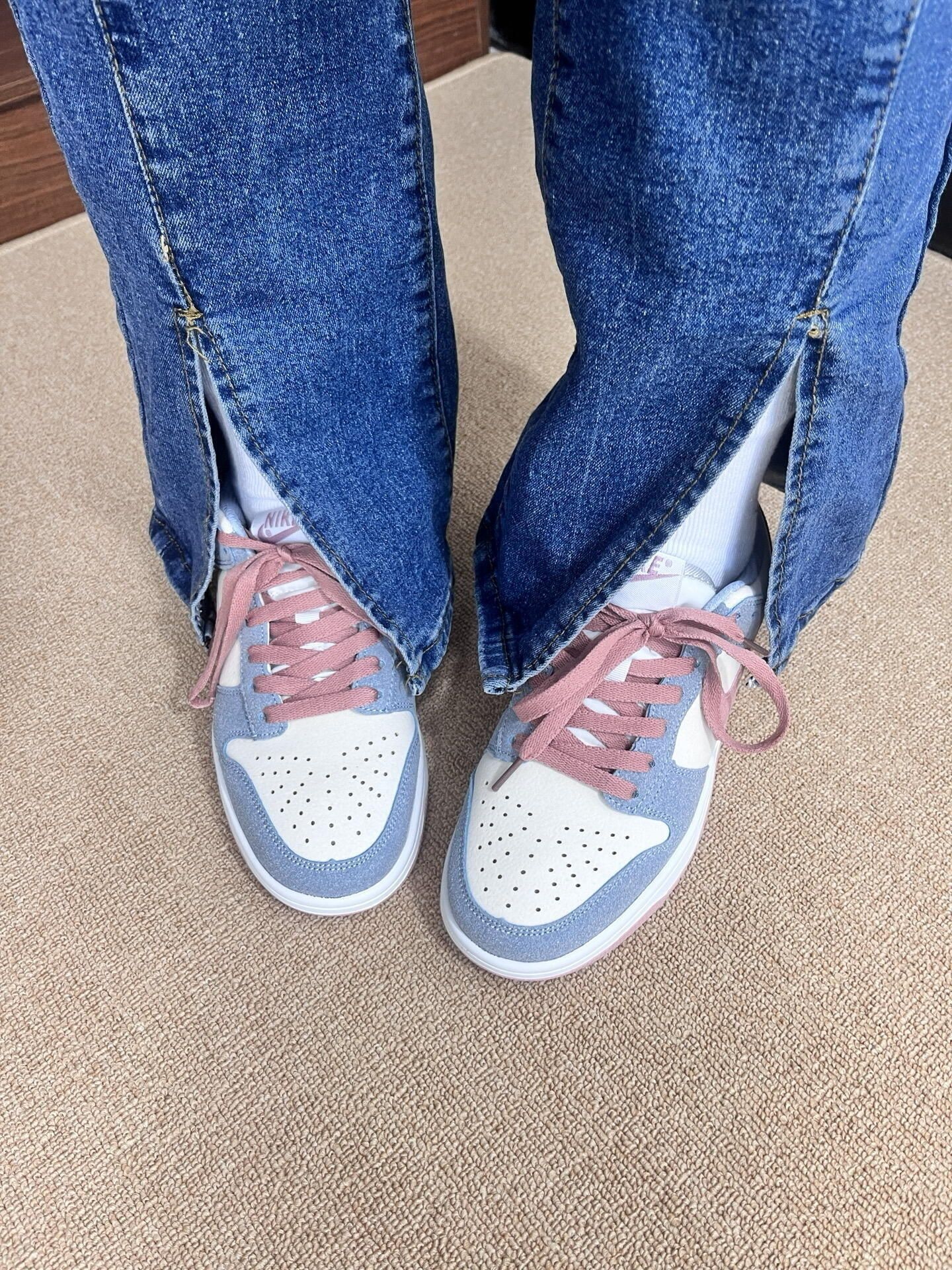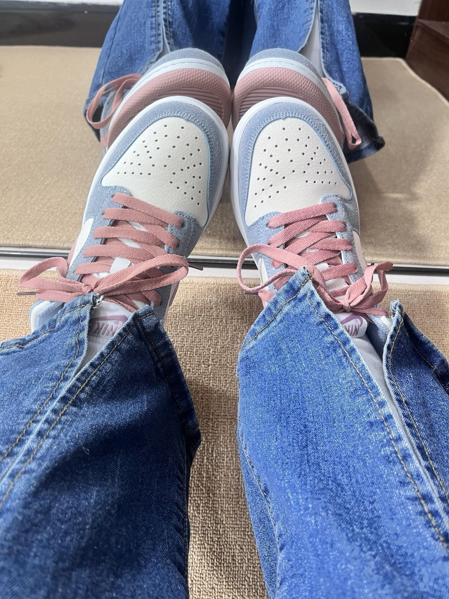 软乎乎的蓝粉板鞋,配牛仔裤绝了浅蓝+淡粉的配色太戳我了! 麂皮拼接的质感很软,鞋带是粉粉的宽绳,随便配牛仔裤都清爽又温柔~鞋型是那种不笨重的板鞋,脚感比想象中软和 细节里的小勾子也是同色系的粉,低饱和配色看着就舒服,属于是越看越喜欢的一双