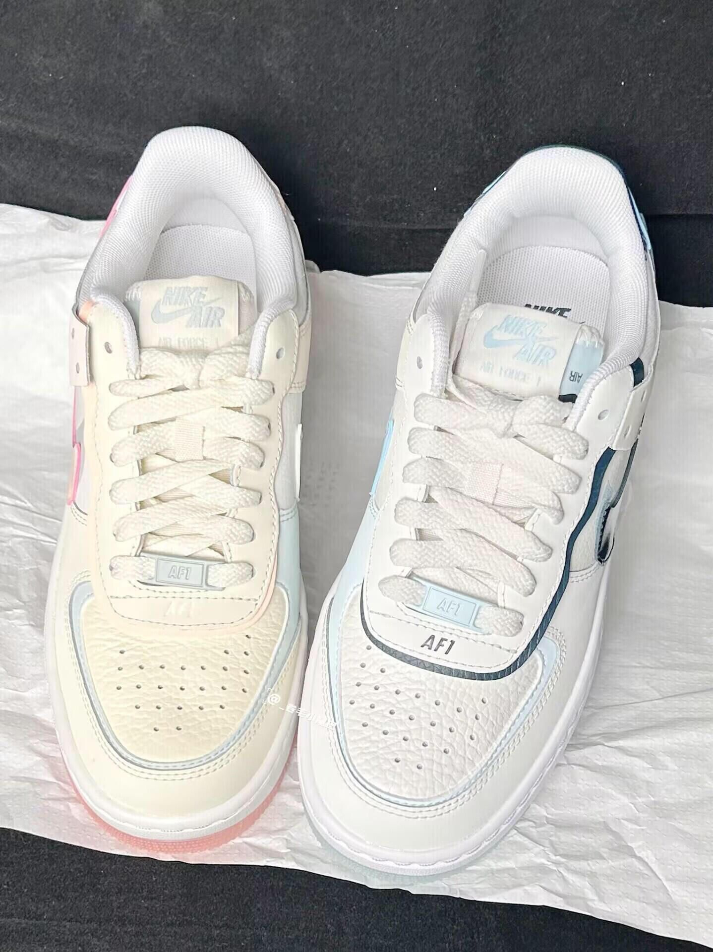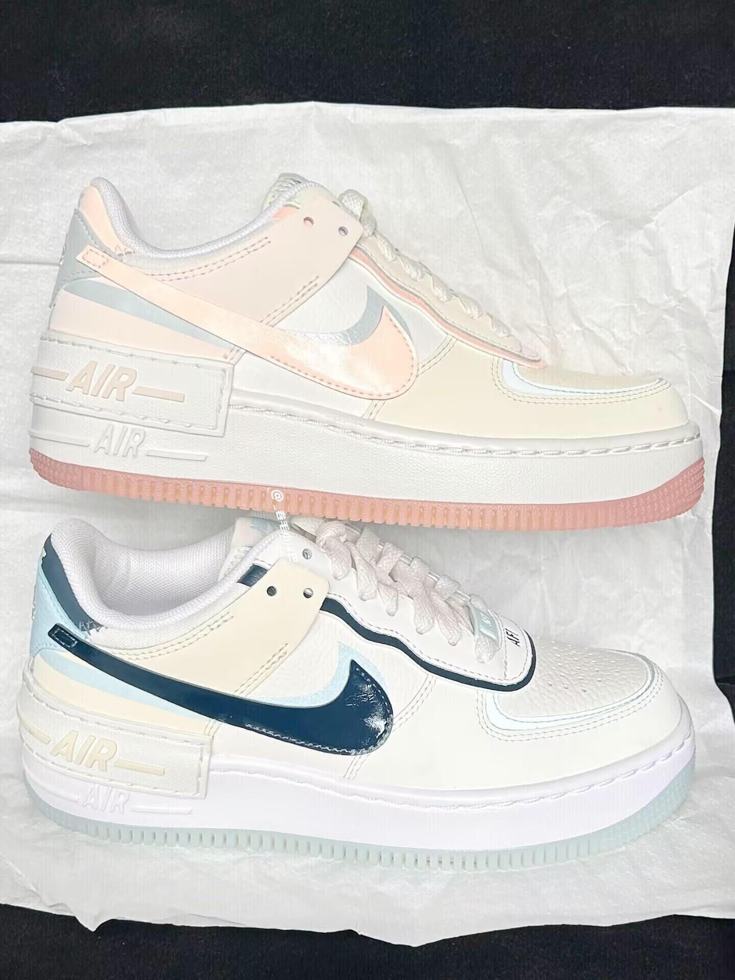 姐妹们!今天必须给你们安利这双Nike Air Force 1 Shadow!左右脚不同配色,直接把我拿捏住了🤏 🎨 配色绝了 左脚:奶油白+雾霾粉,温柔到骨子里🌸 右脚:纯白+海军蓝,清爽又高级🌊 双倍的快乐,一双鞋穿出两双的感觉! ✨ 细节控狂喜 双层Swoosh logo + 解构风叠加设计,层次感拉满! 鞋舌上的"AF1"小标超精致,厚底增高显腿长,小个子福音👧 💡 穿搭Tip...