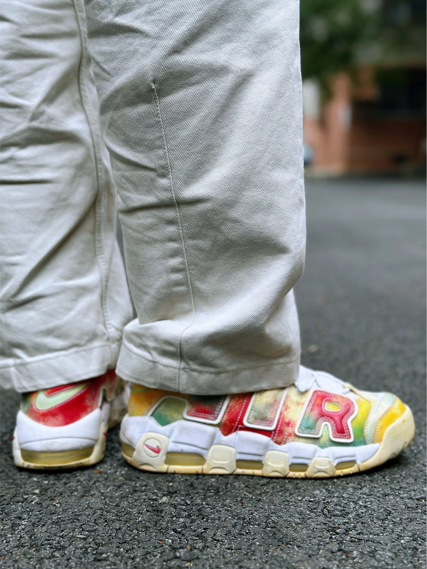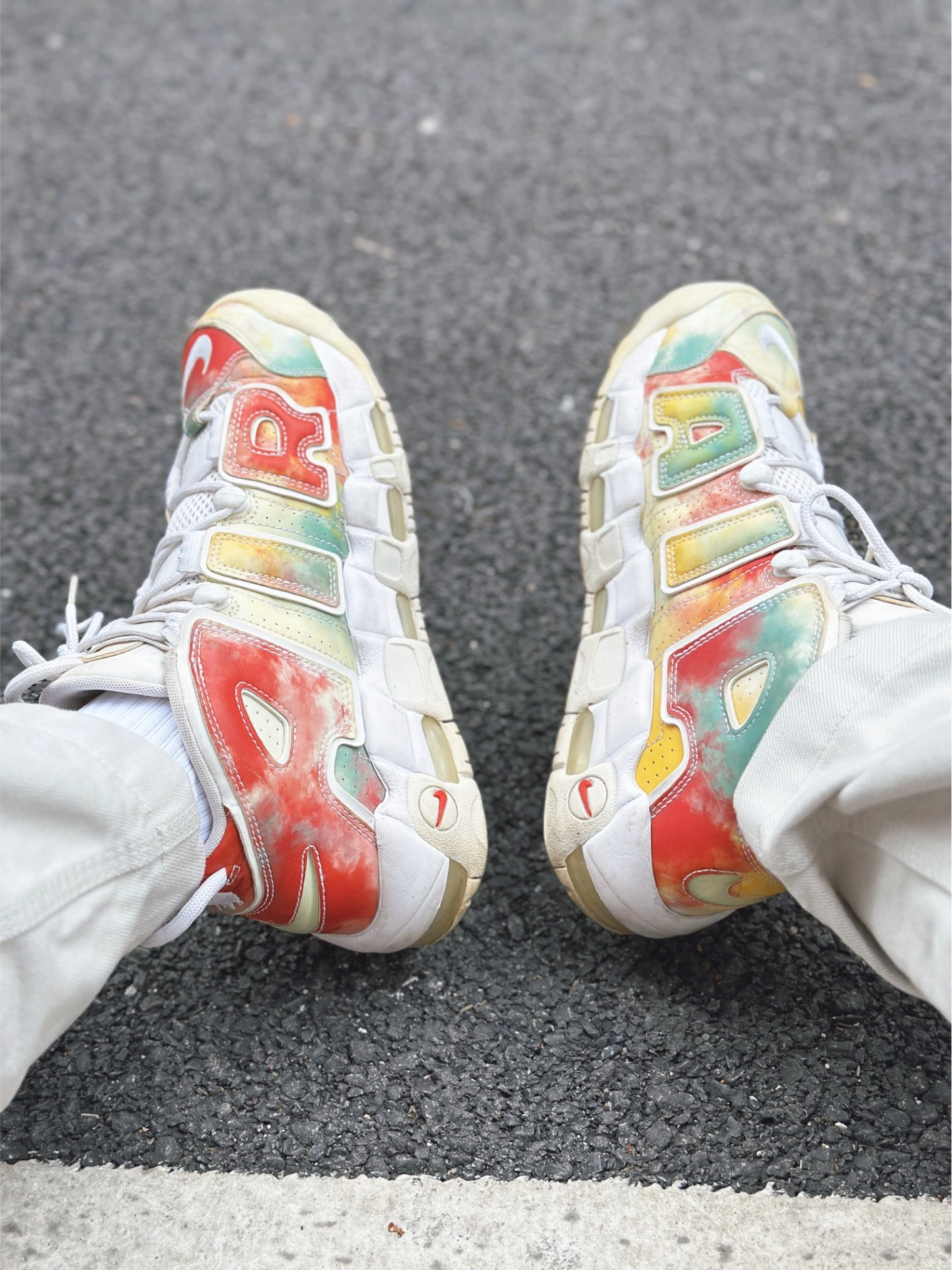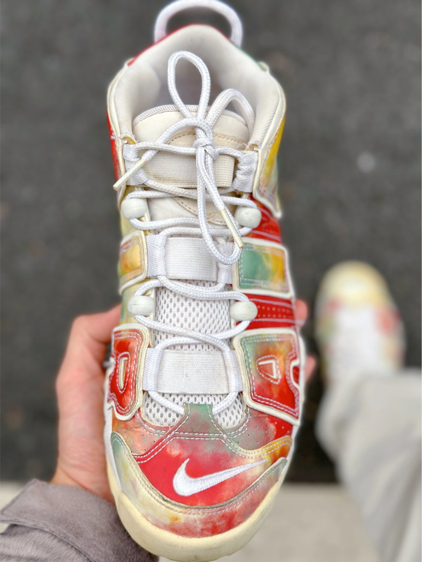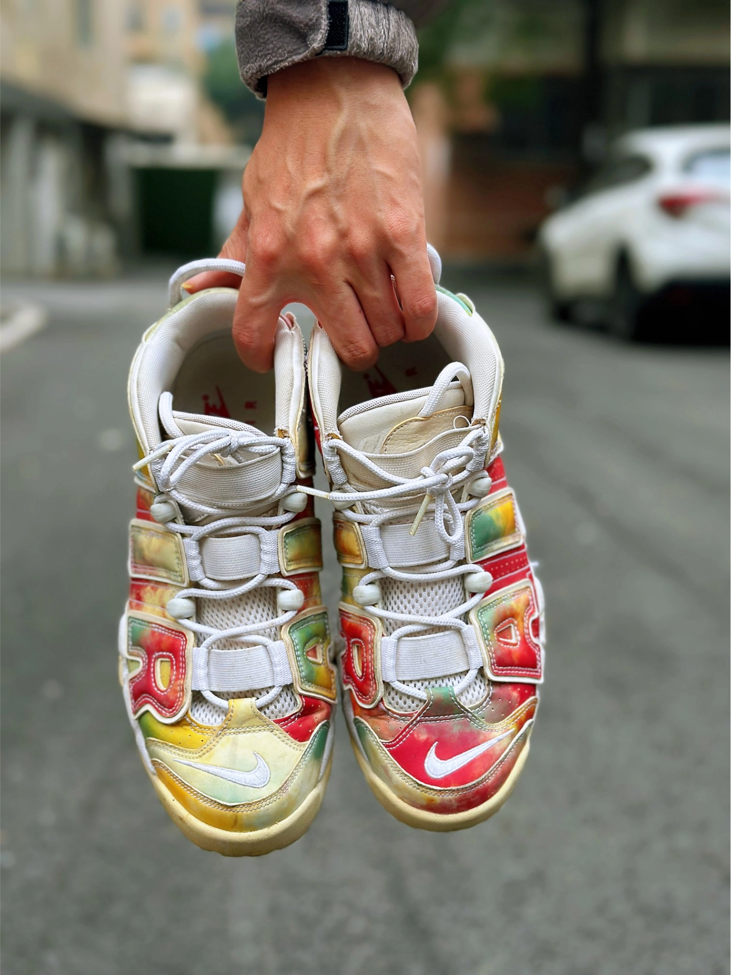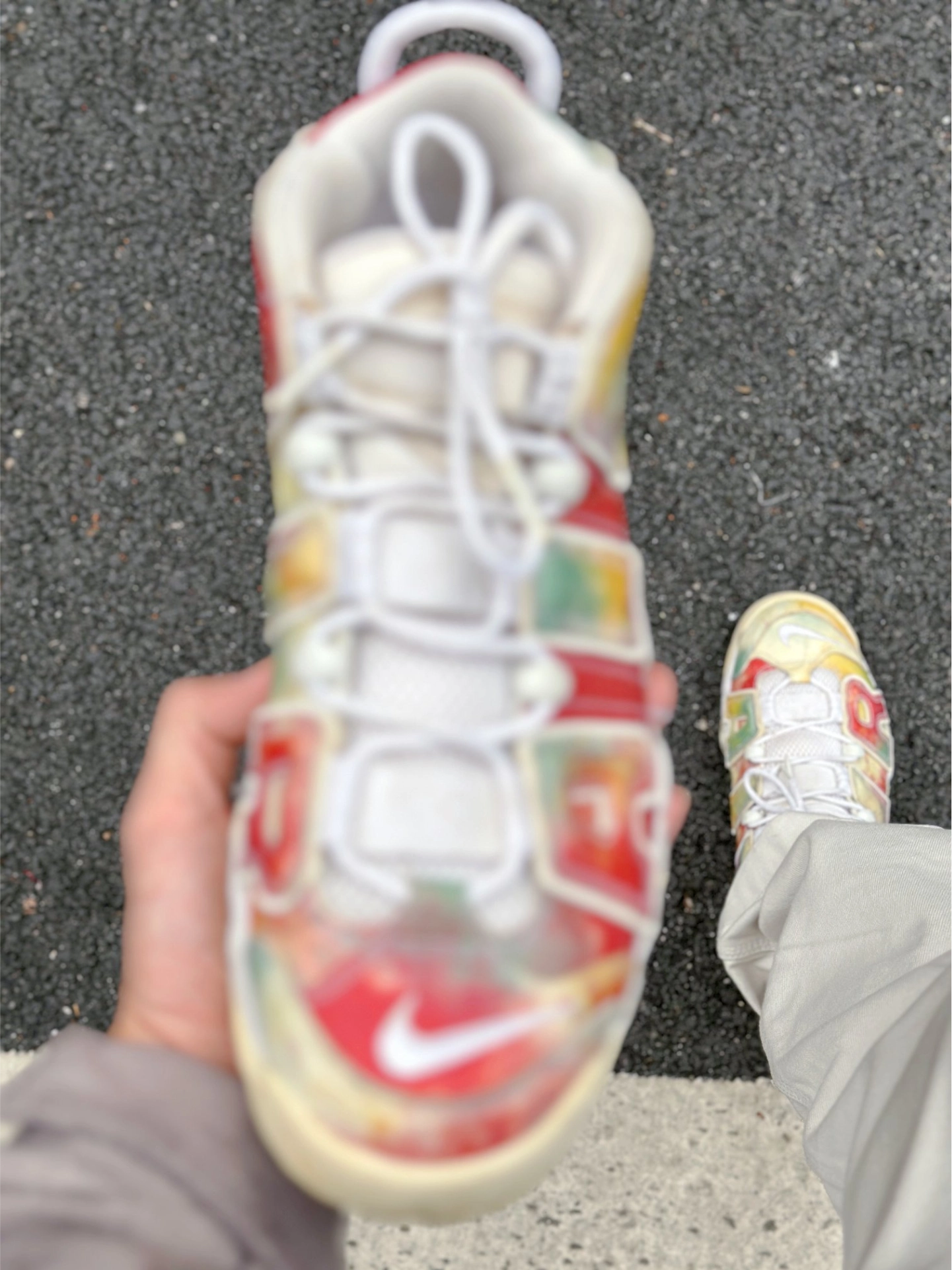 这双鞋是 Nike Air More Uptempo(大皮蓬)欧洲城市系列 里的伦敦/英国限定配色,鞋跟那个“⭐”形图案其实是英国(大不列颠及北爱尔兰联合王国)的地图轮廓,中间的五角星代表的是首都伦敦的位置。 这个系列是为了致敬欧洲三大城市:伦敦、米兰和巴黎,每双鞋后跟都绣有对应国家的地图,并用星星标出城市位置。这双的扎染配色正是伦敦款的标志性设计。 增高效果明显,这个扎染配色也很吸睛,就是出...