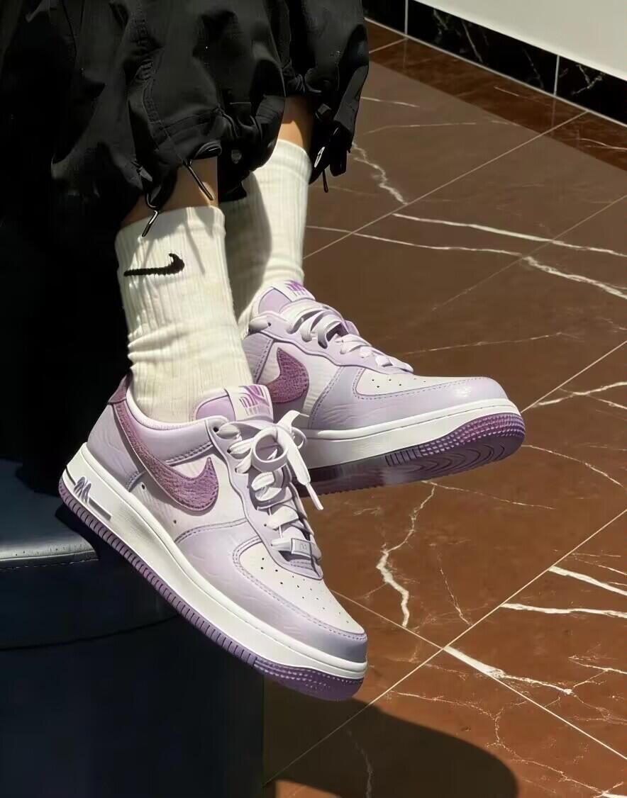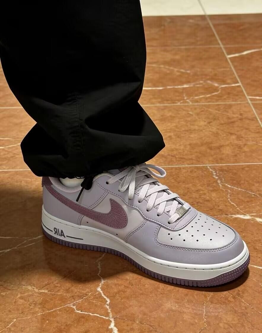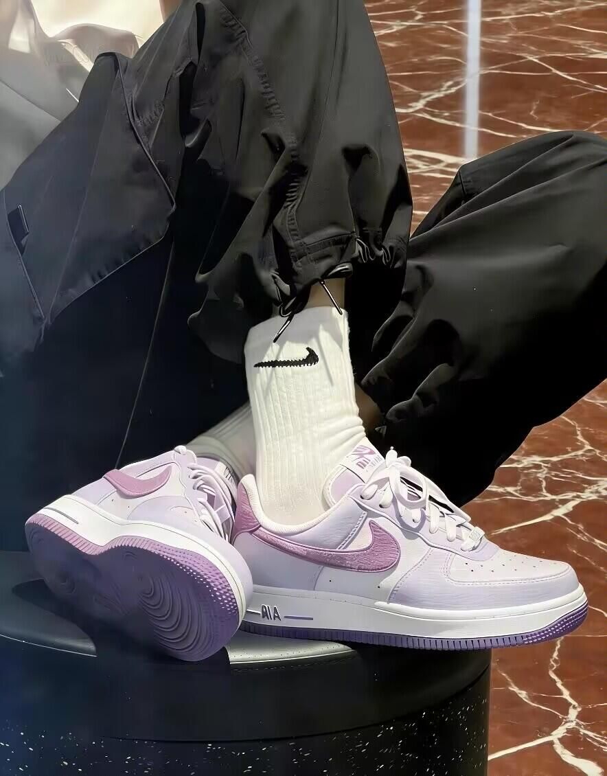 清爽又不腻的经典款实物比图片还好看!淡淡的粉紫色Swoosh配上水蓝色鞋带孔,甜但不腻。皮质是细腻的光面皮,软软的不用磨合。 脚感还是熟悉的AF1,底子扎实走久不累。后跟的紫色点缀是亮点,属于自己知道的小特别。 搭配牛仔裤、浅色运动裤都合适,夏天配白袜穿很清爽。已经能想象穿去海边散步的样子了🌊 尺码正,喜欢宽松可以选大半码。