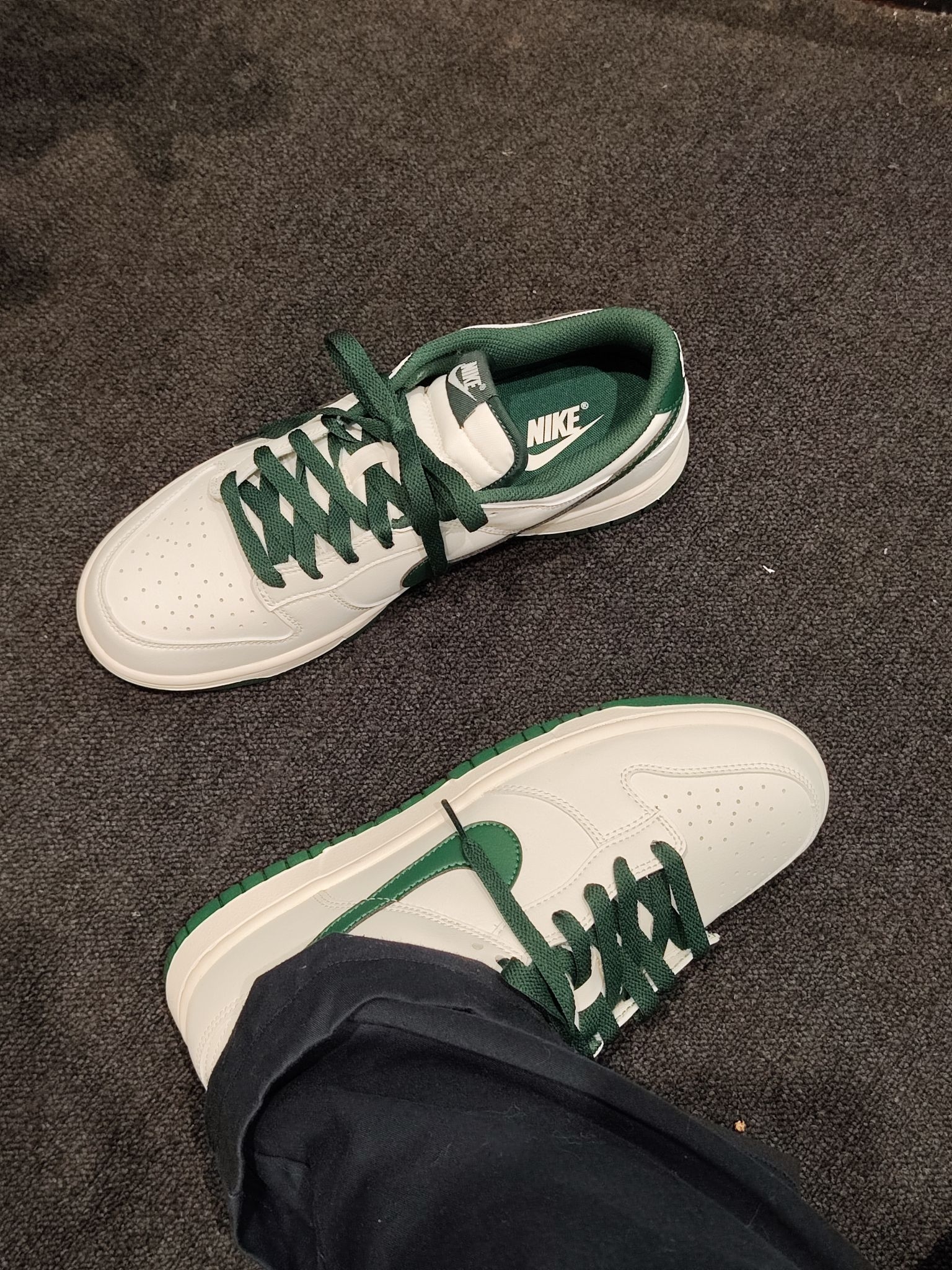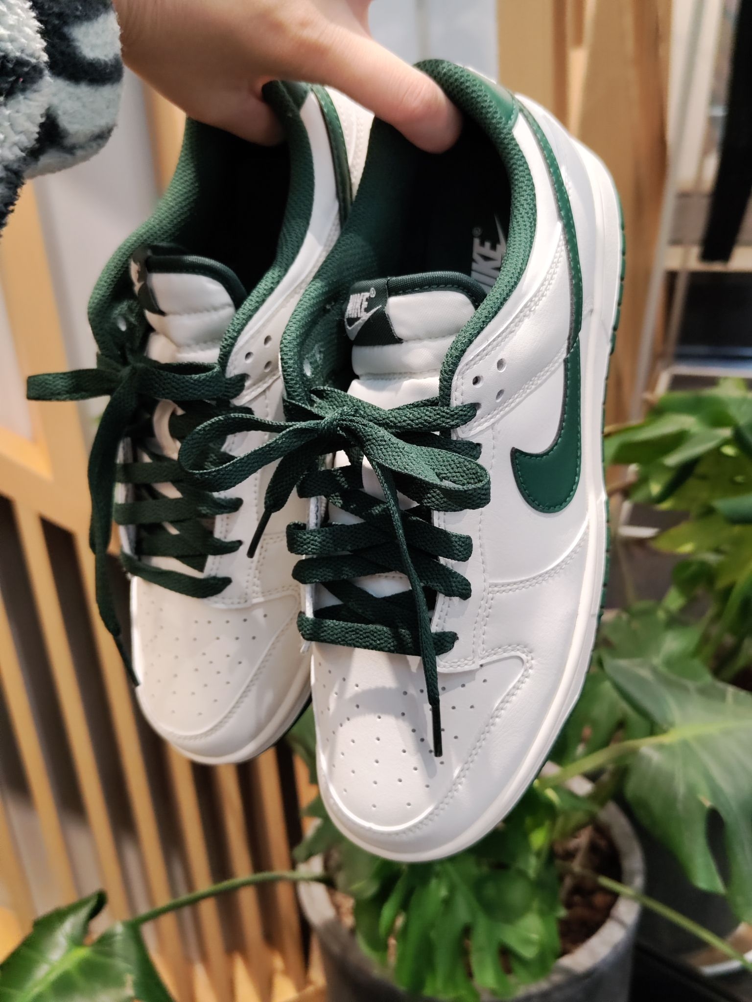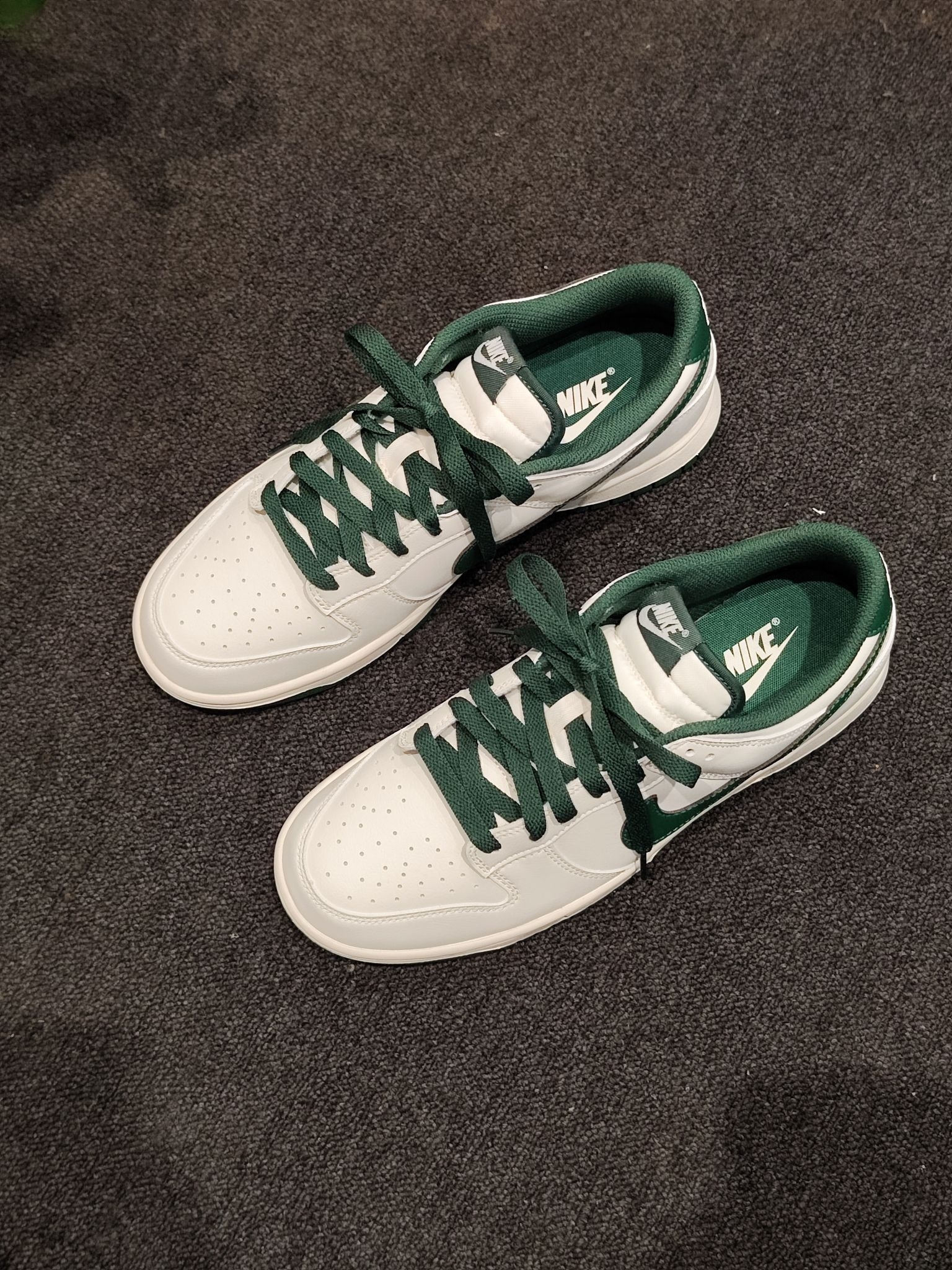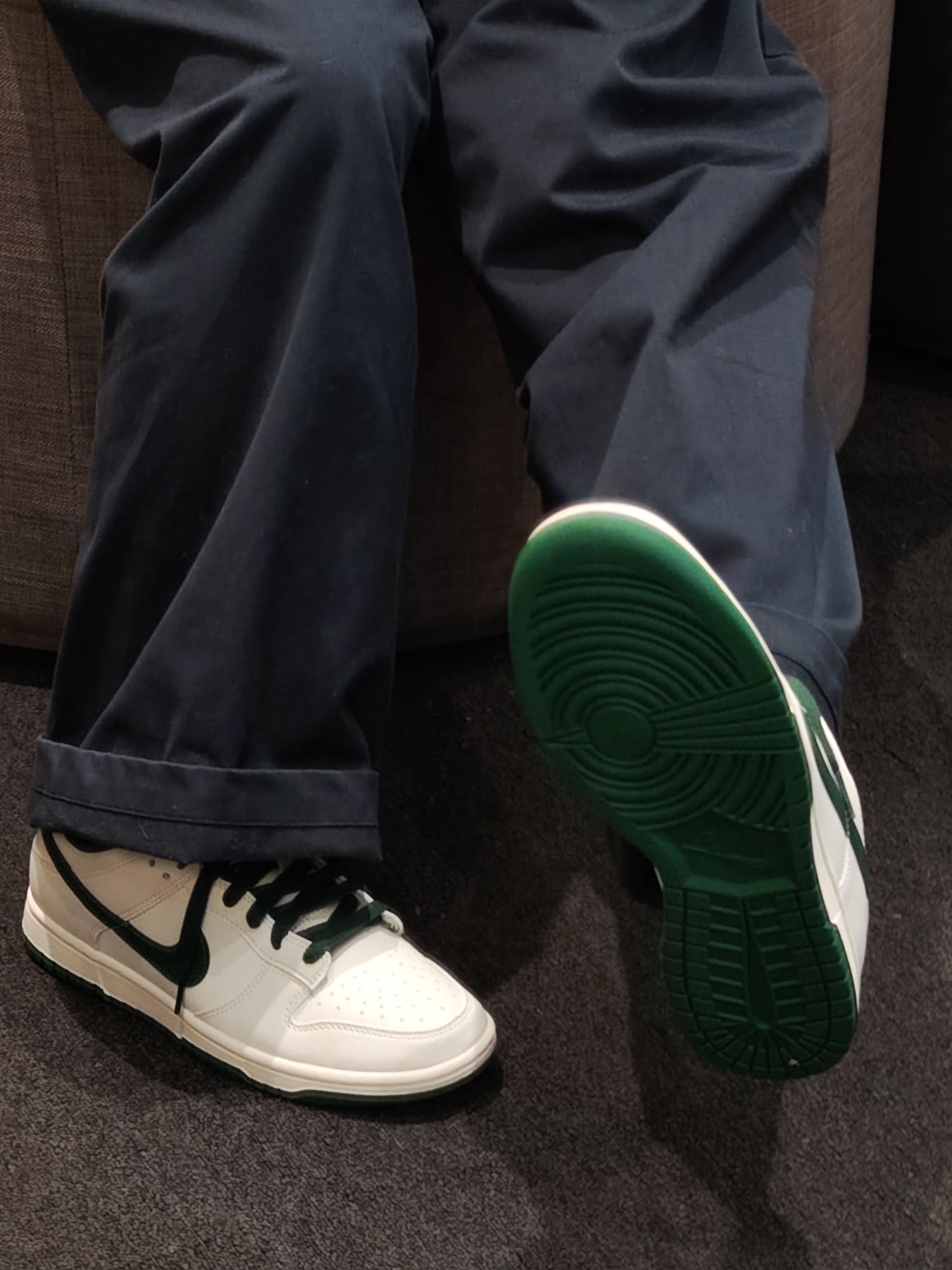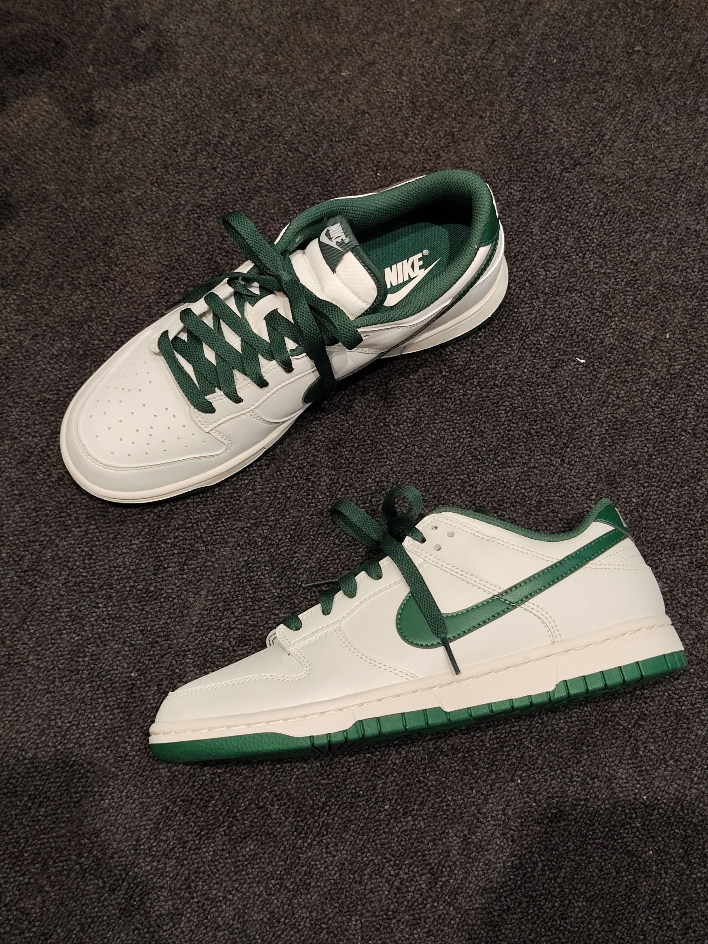 终于把心心念念的白绿Dunk拿下了!米白配墨绿的配色真的太戳我,复古又百搭,搭深色阔腿裤直接氛围感拉满~皮质摸起来很软,上脚脚感也很舒服,日常穿完全不磨脚,感觉能搭遍我衣柜里所有裤子,后悔没早点入!