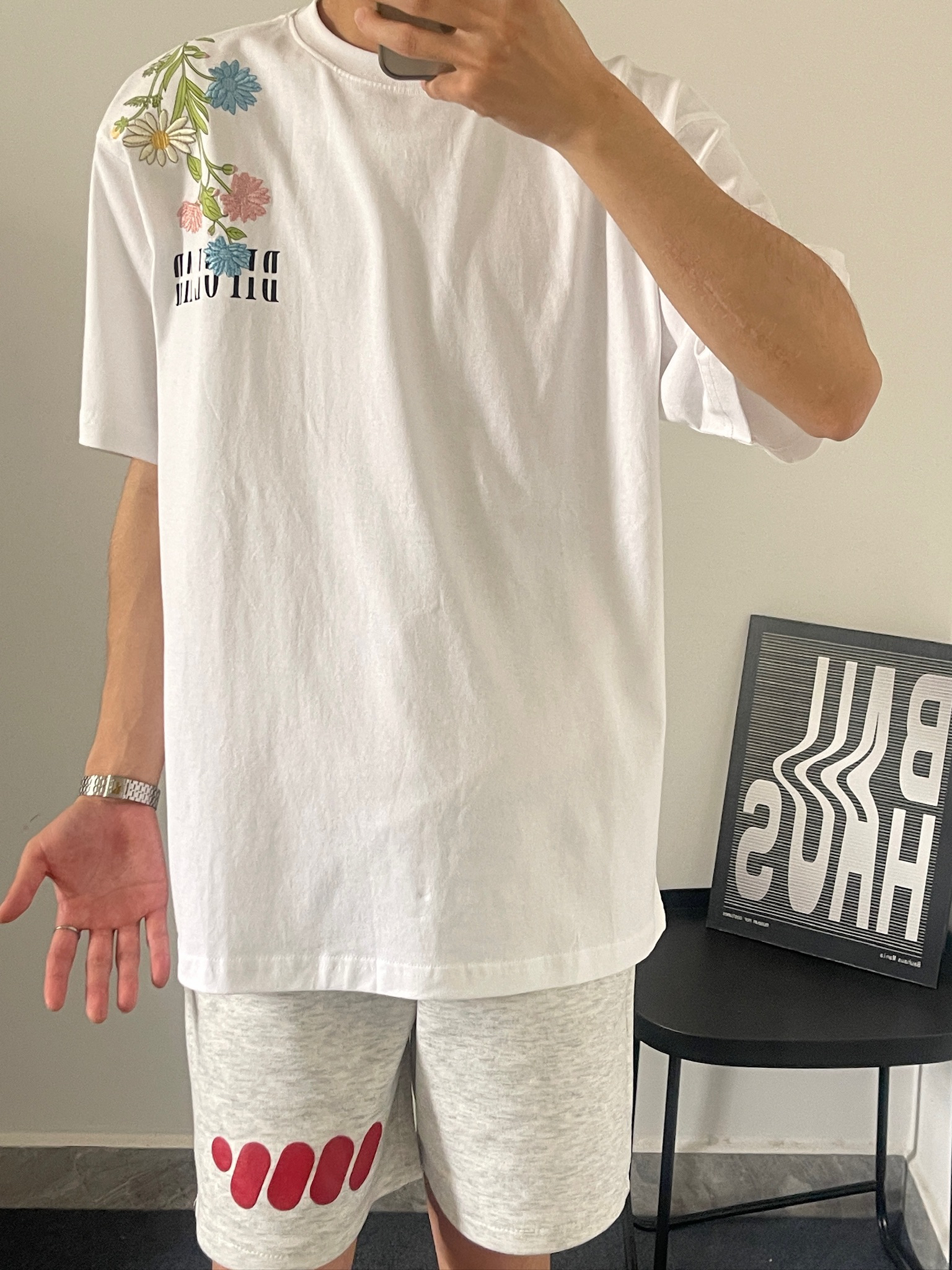 别再穿单调的纯色白T了!这件花卉印花真的太绝了。色彩很清新,不是那种很艳俗的颜色,男生穿也不会显得娘。搭配一条浅色牛仔裤,清爽又干净,夏天这样穿真的很舒服