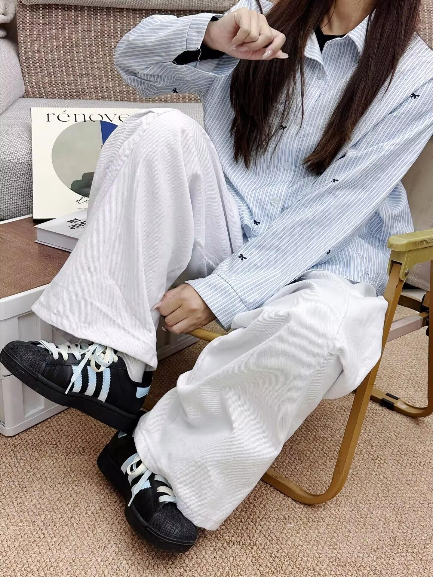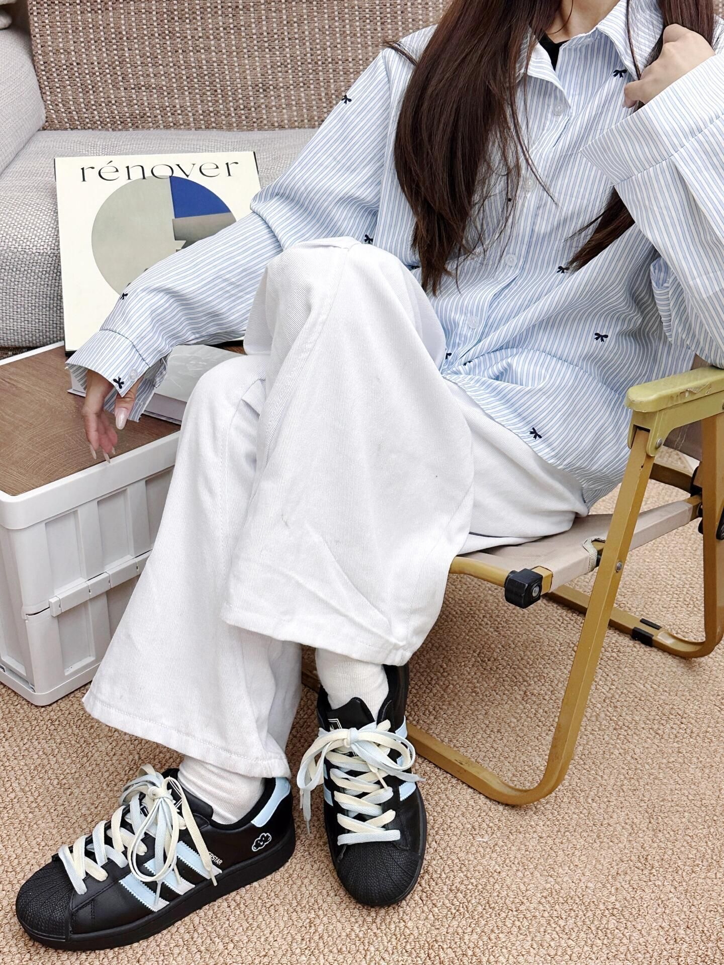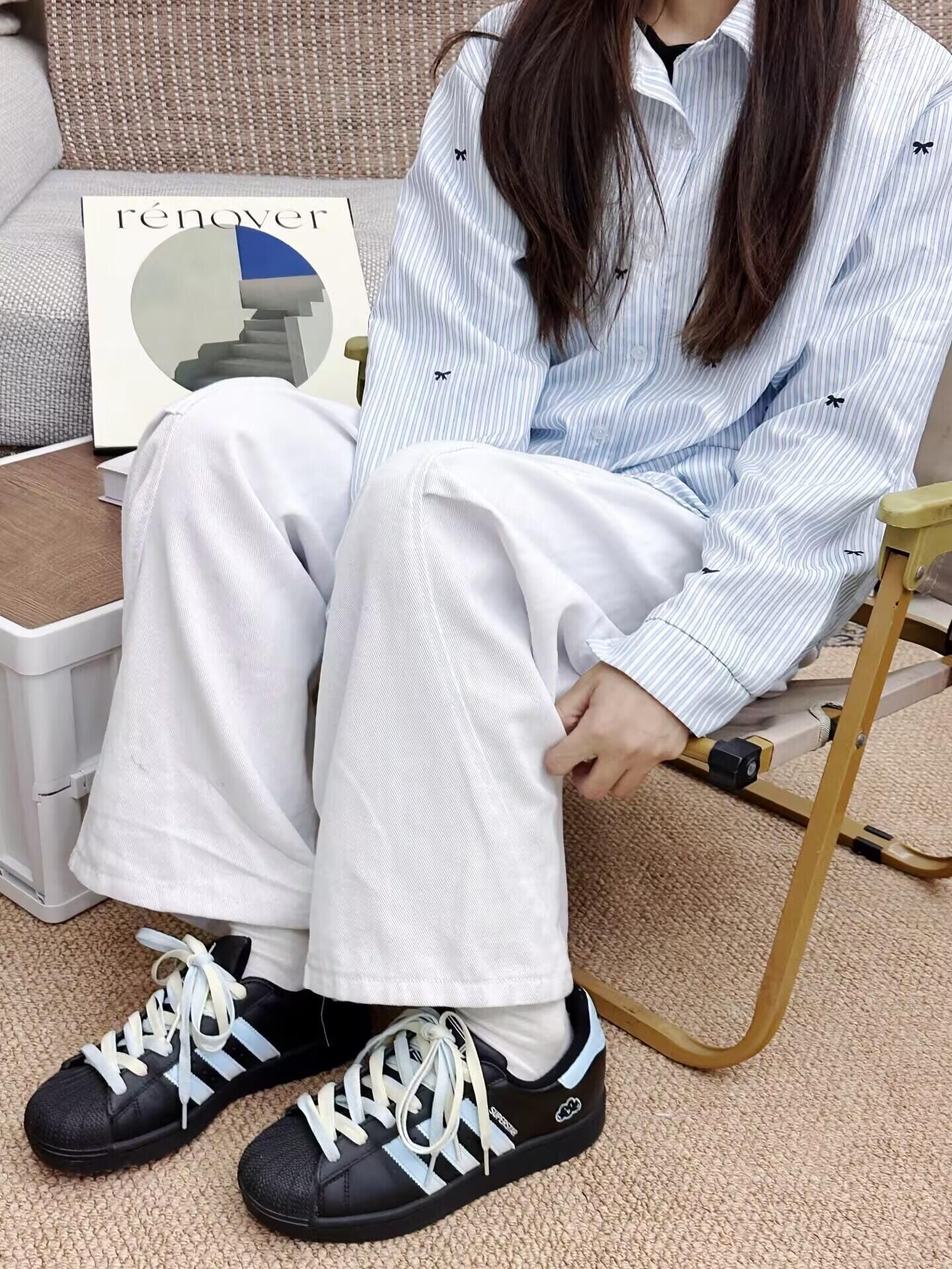 这双黑蓝撞色贝壳头真的是甜酷风本命鞋!黑底色低调百搭,浅蓝三条纹和云朵刺绣细节又带点软萌感,配牛仔裤或阔腿裤都很和谐。皮质软弹不磨脚,日常上课、逛街走一天都不累,鞋带的蓝白撞色还能解锁多种系法,已经成了我近期的穿搭刚需。
