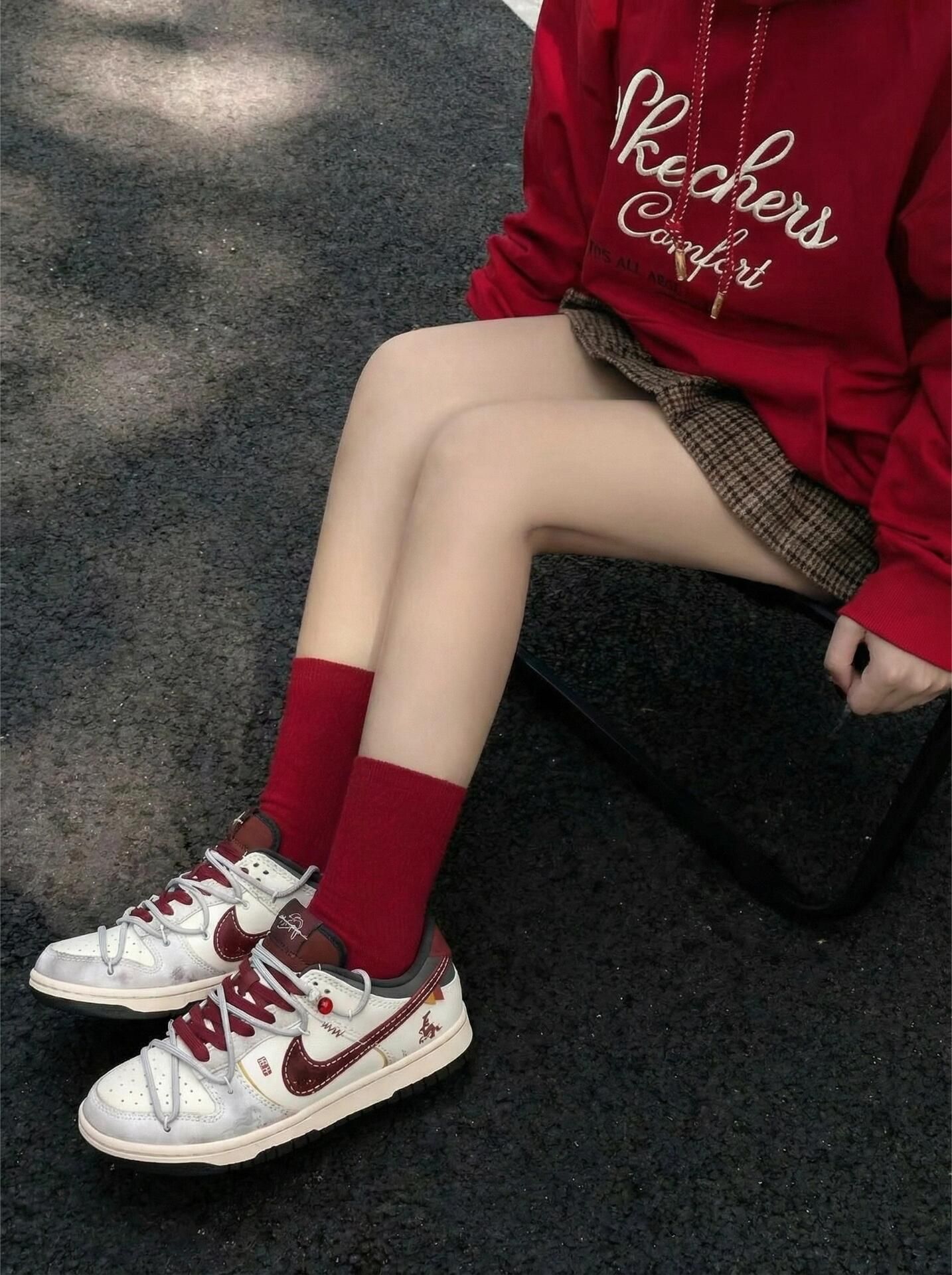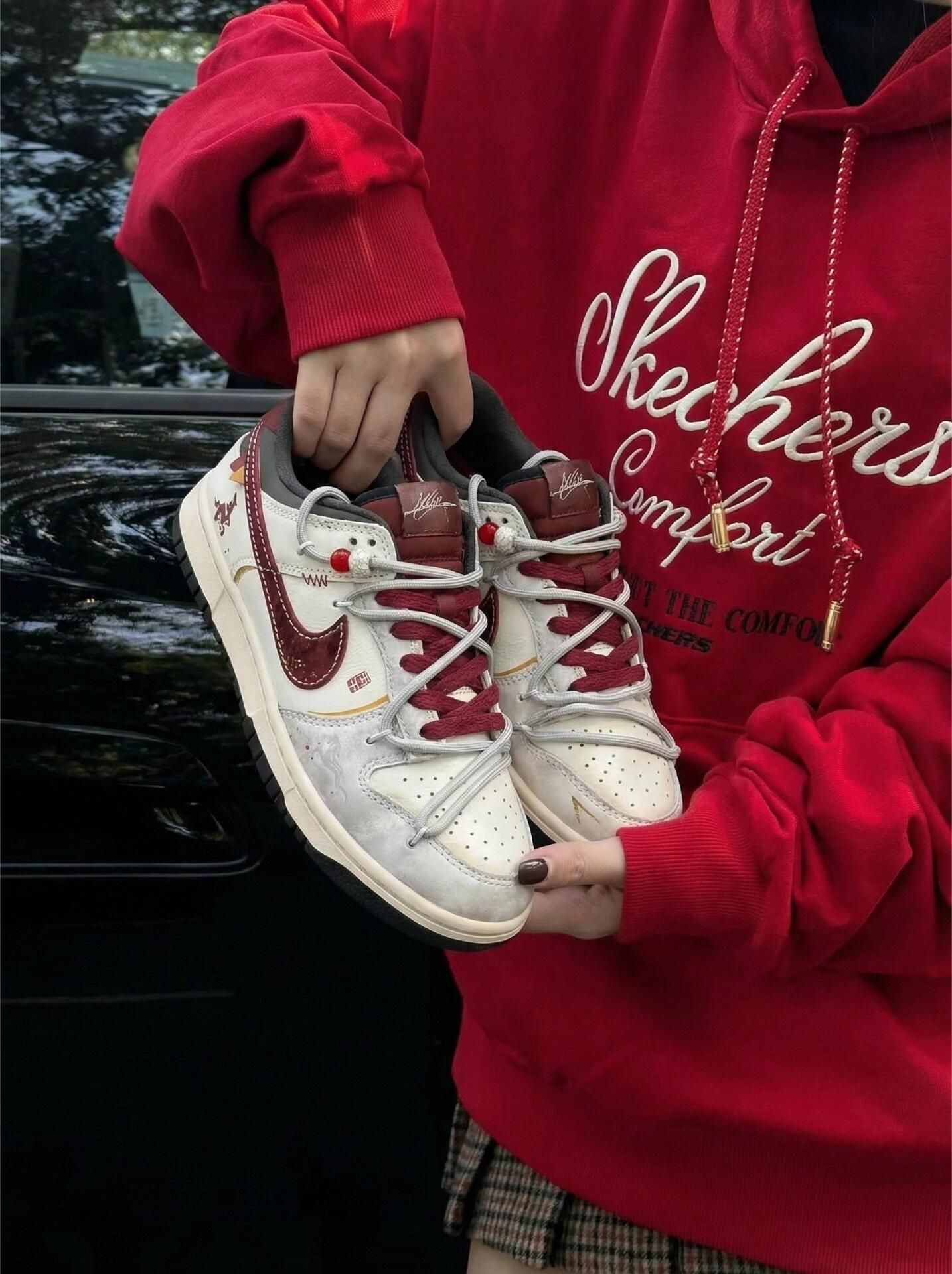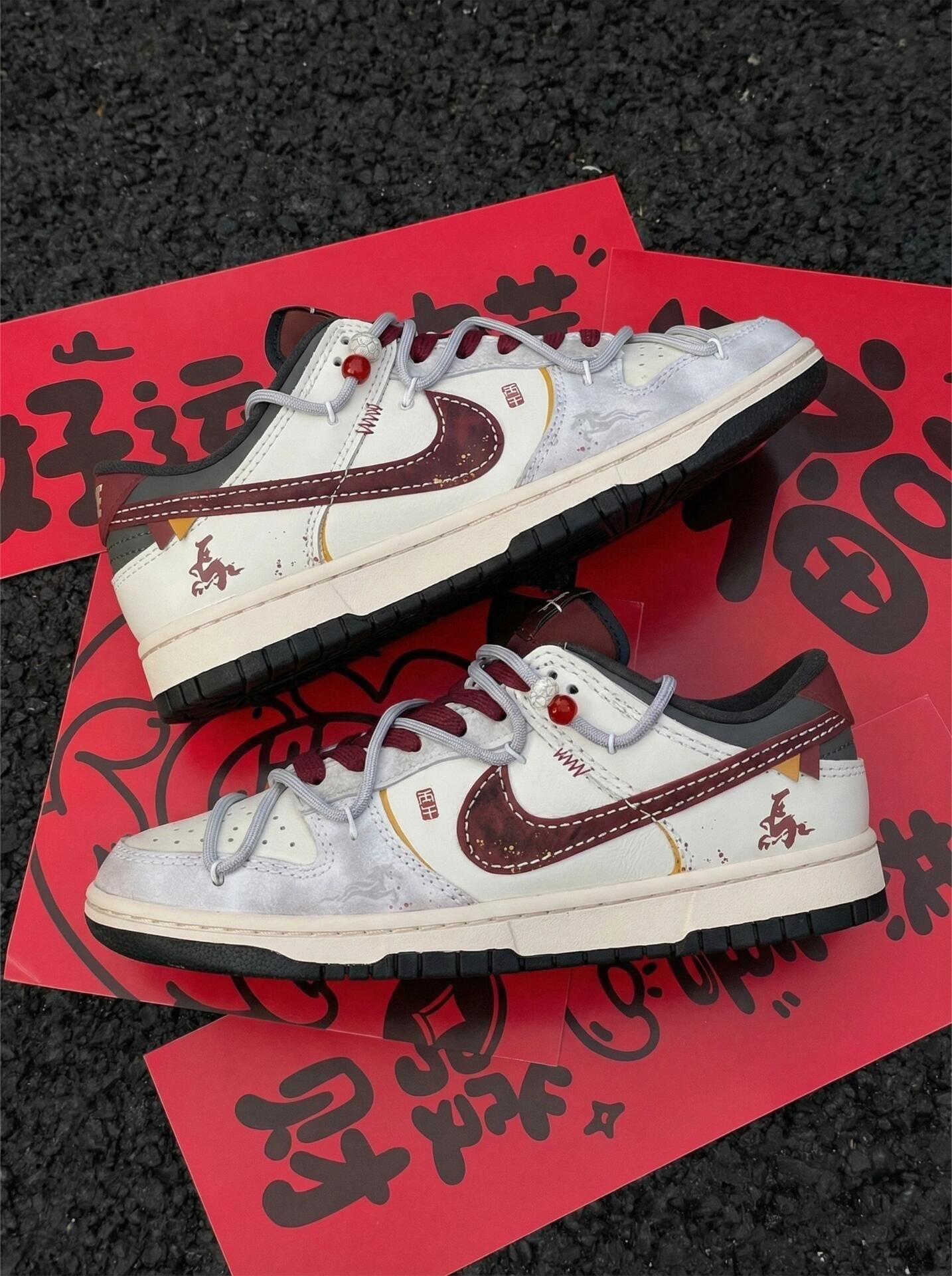 太符合新年审美了~米白+酒红的做旧设计挺有年味,配卫裤牛仔裤都不违和。 但缺点也挺明显:鞋身的麂皮部分特别容易沾灰,出门一趟就显脏,而且不好擦。 鞋底偏硬,走久了脚底板会有点酸,鞋带的红色珠子也容易勾到袜子。 日常压马路还行,暴走的话还是换双鞋吧👟