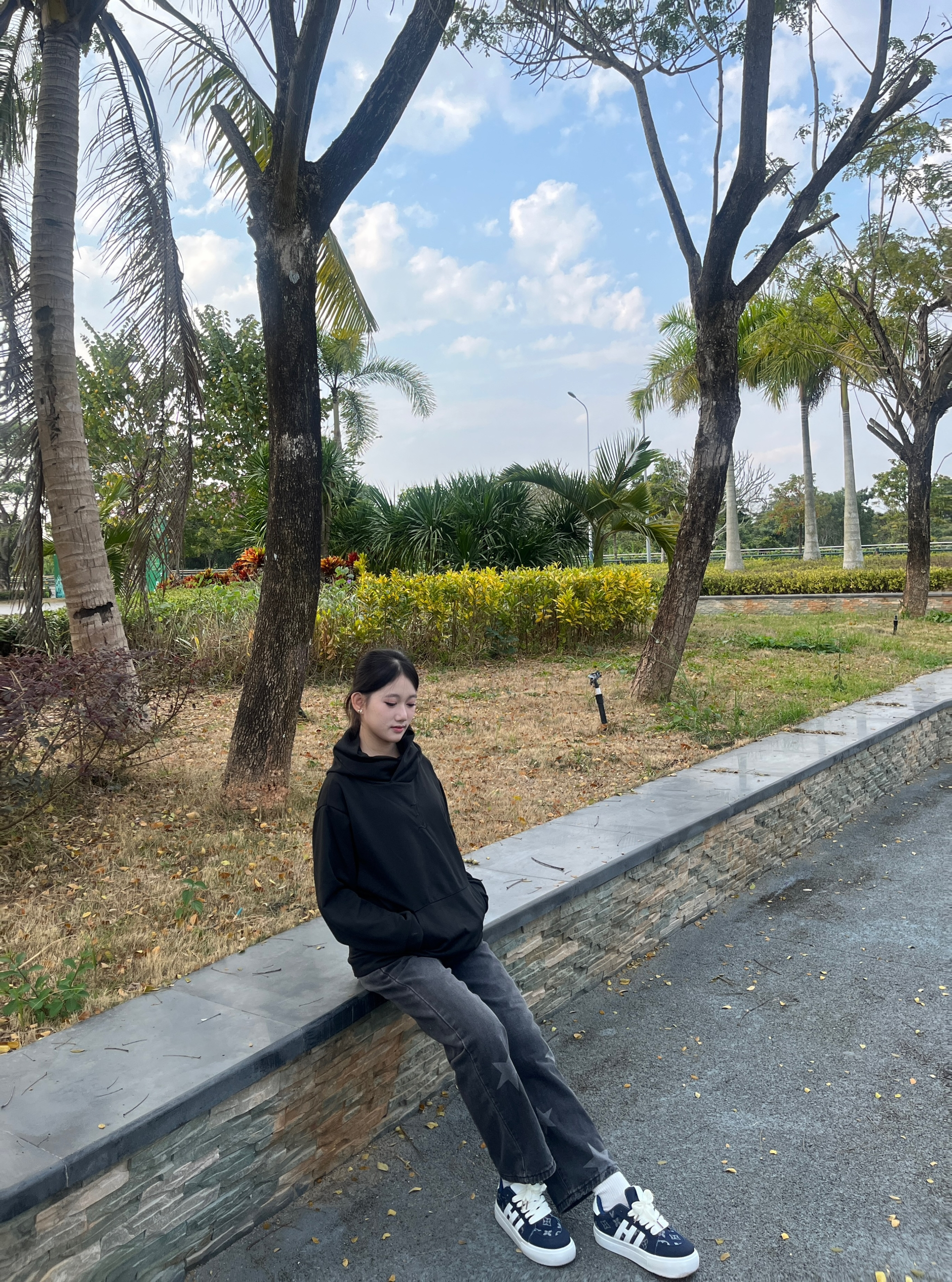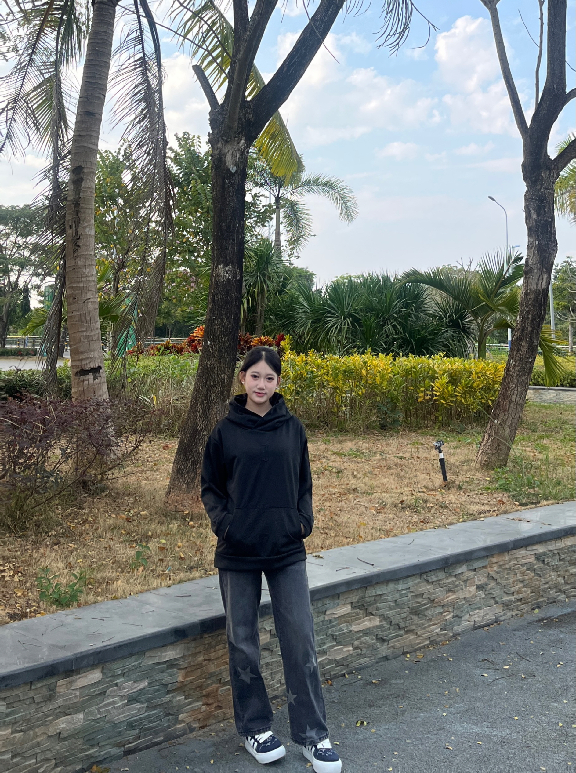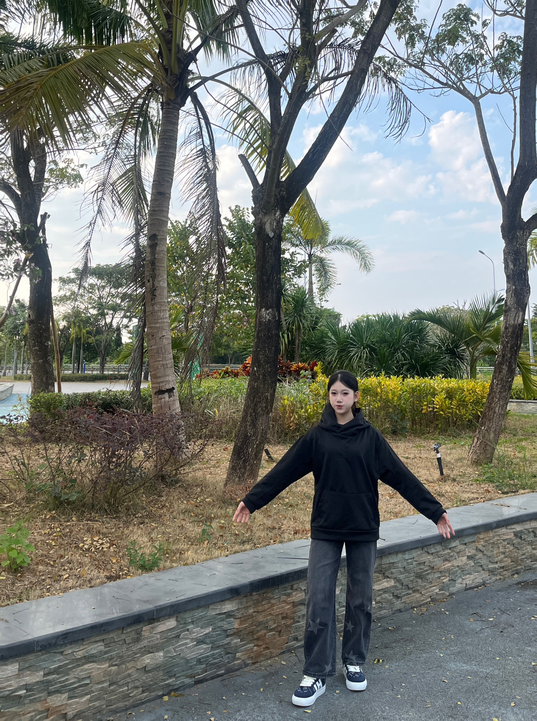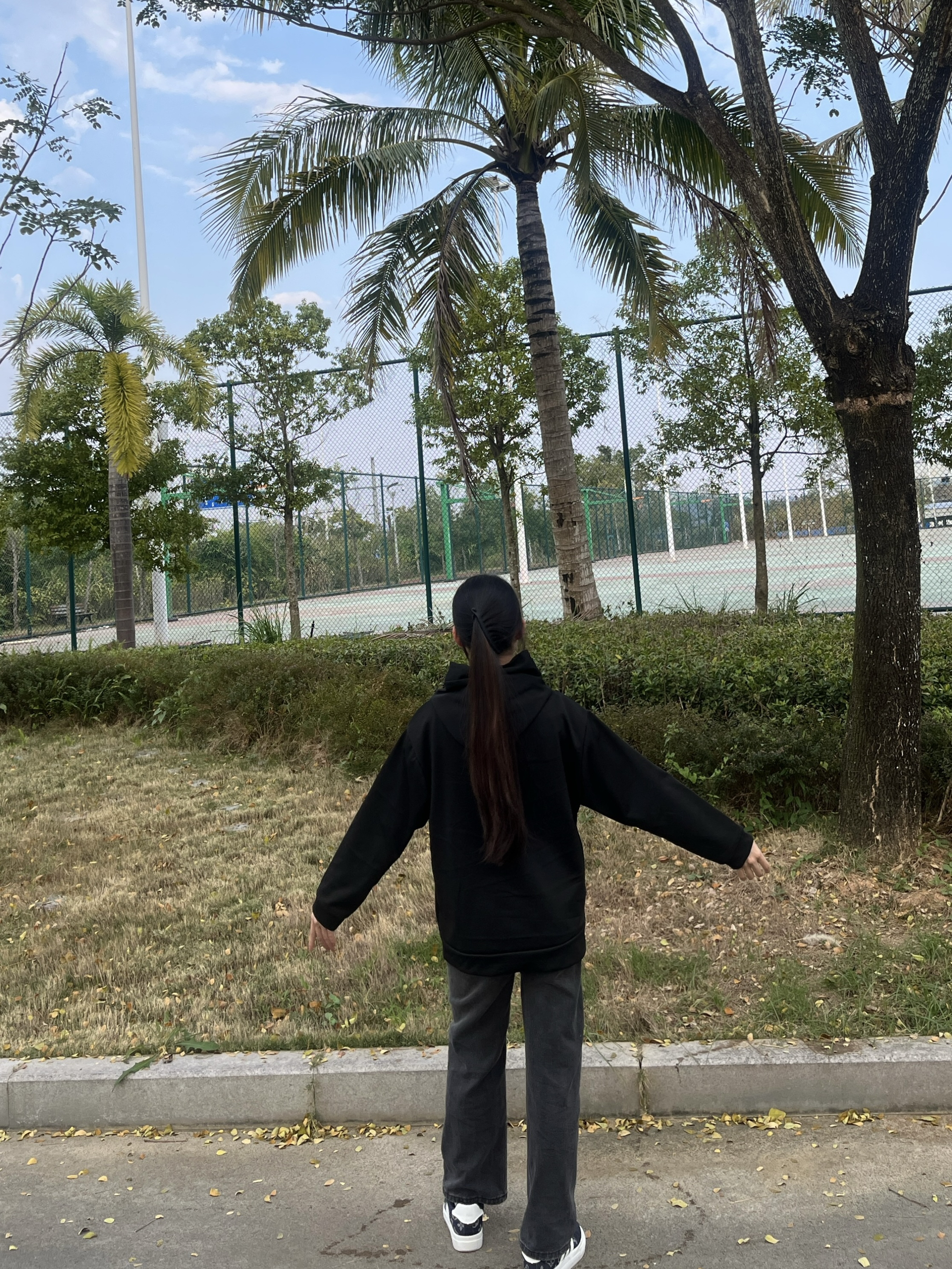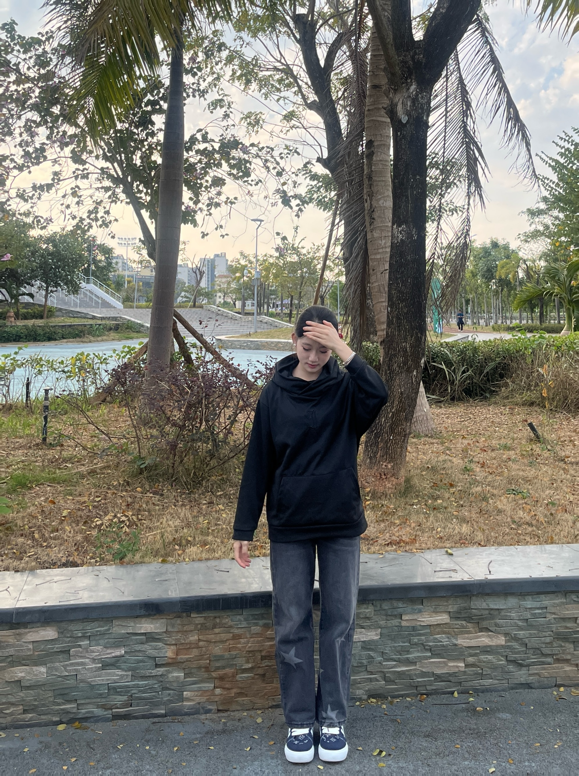 158|92斤 这件黑色连帽卫衣以极简廓形诠释松弛美学,软糯的面料兼具保暖与亲肤感。 利落的高领设计为整体增添层次感,宽松剪裁不挑身形,与牛仔裤搭配即能营造随性的都市休闲感,是秋冬衣橱里兼具质感与实穿性的隽永单品。