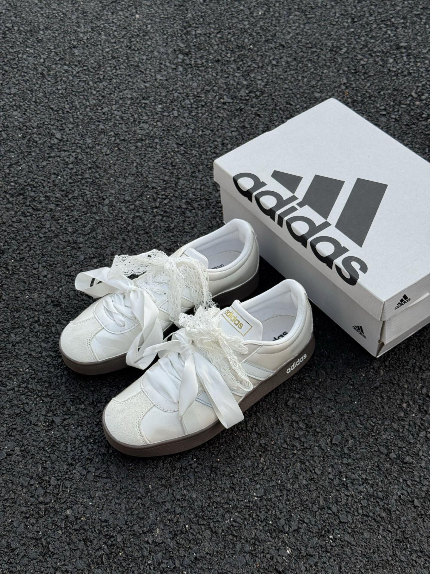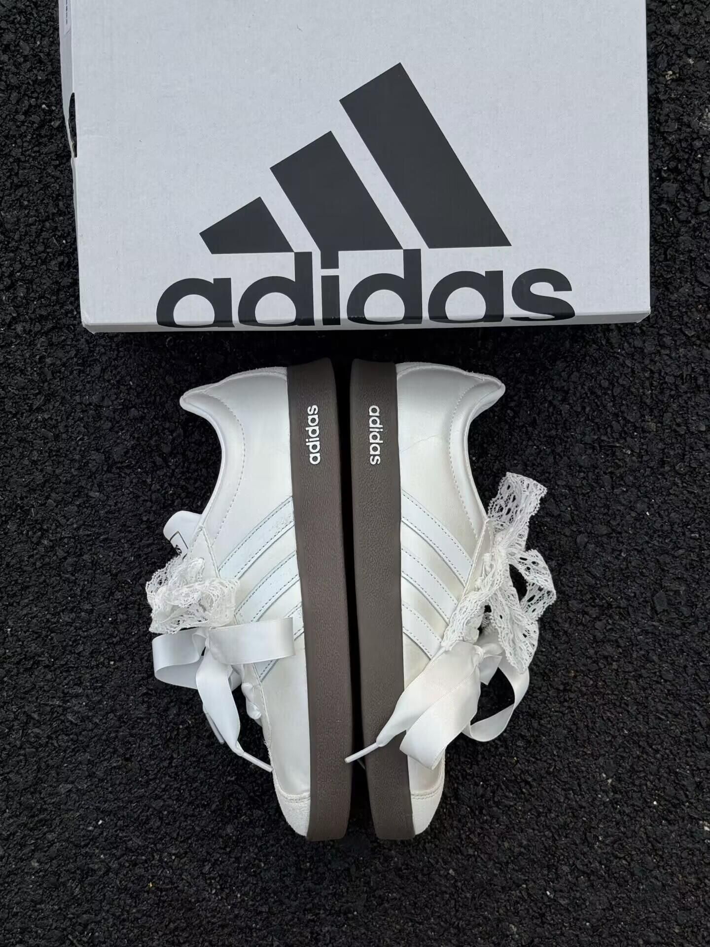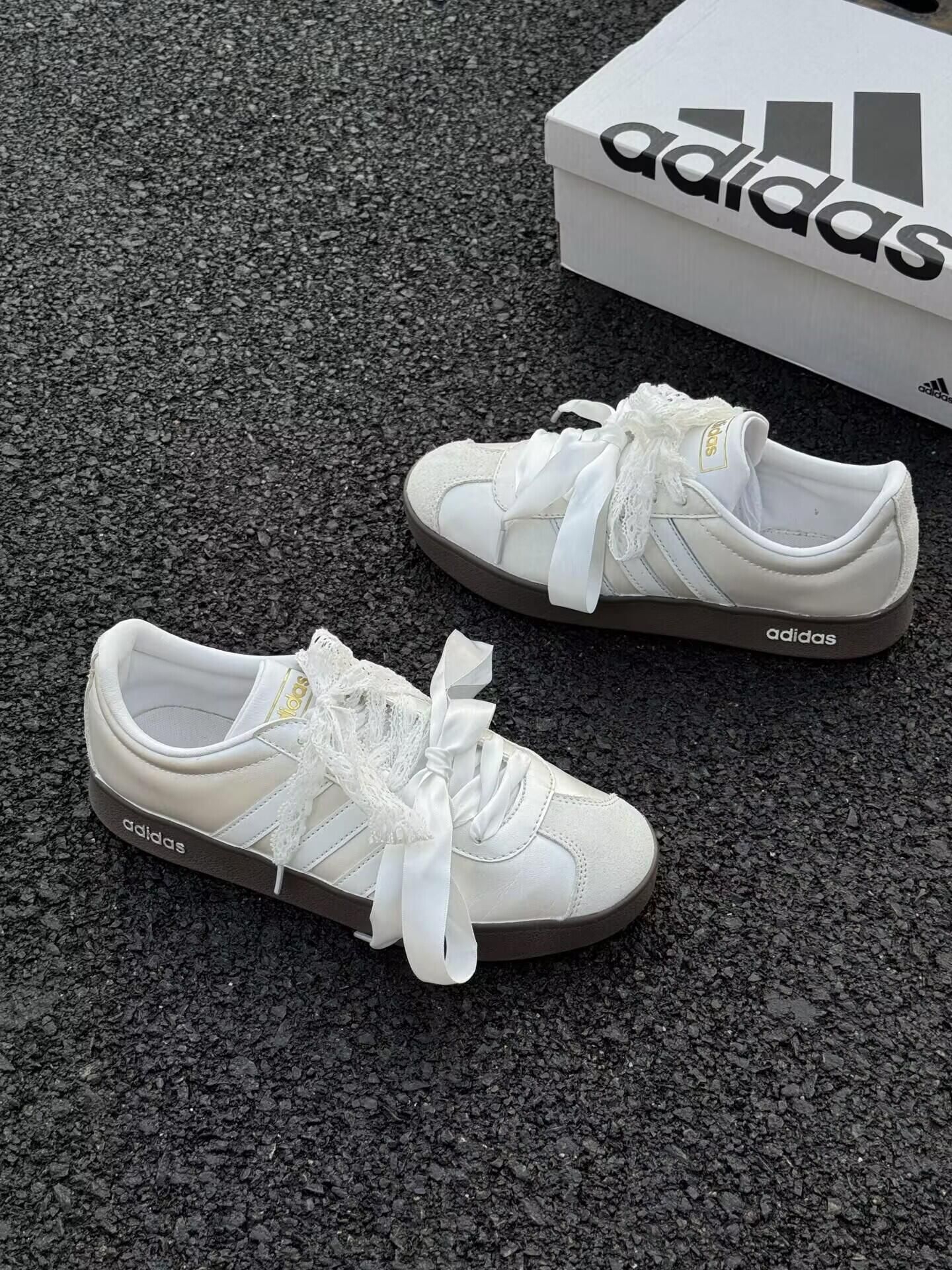 自带仙气的蕾丝蝴蝶结,把adidas经典板鞋玩出了新花样。 奶fufu的米白鞋面搭配复古生胶底,既有运动感又藏着少女心。绸缎鞋带一绑,温柔氛围感直接拉满。
