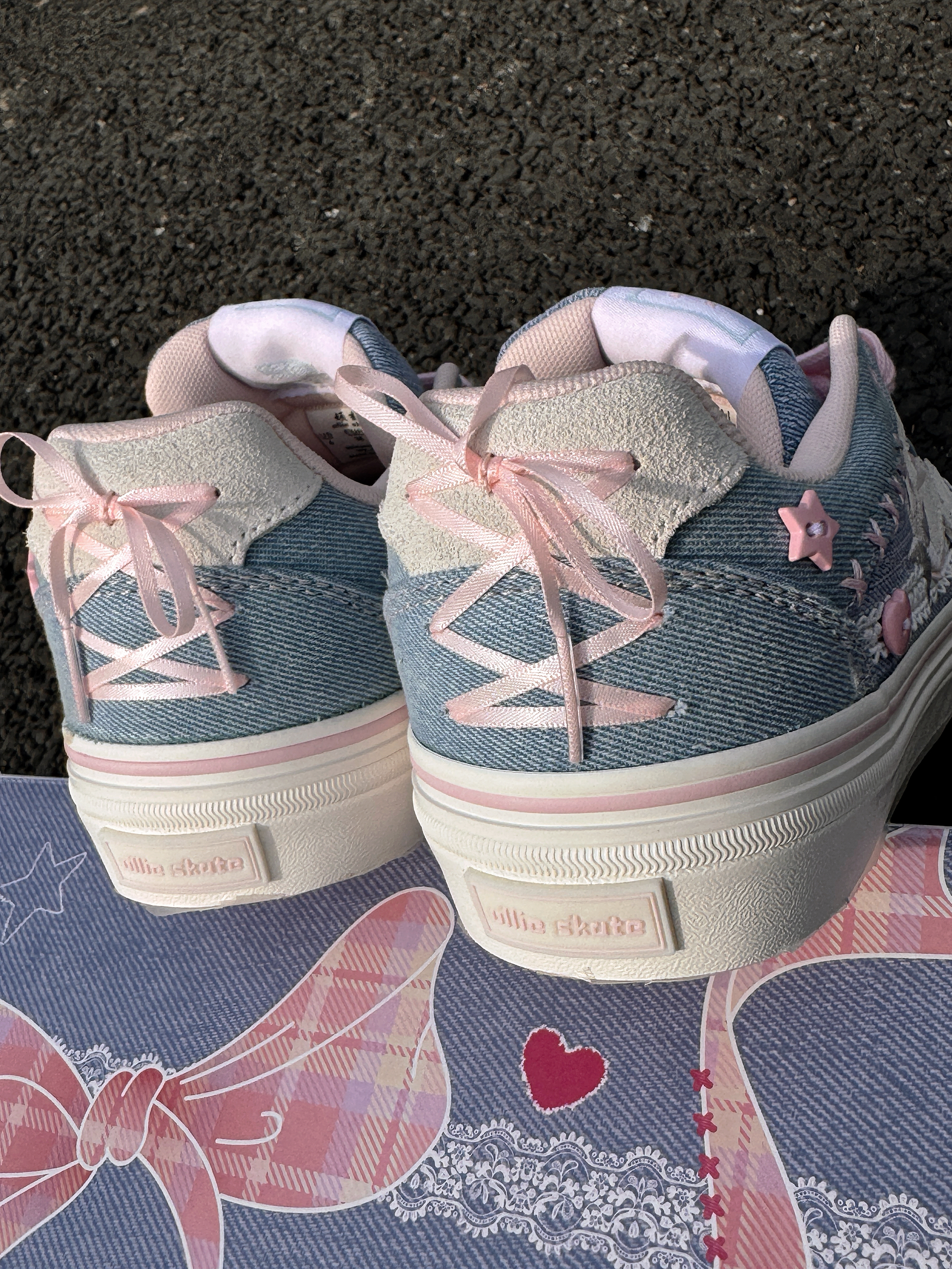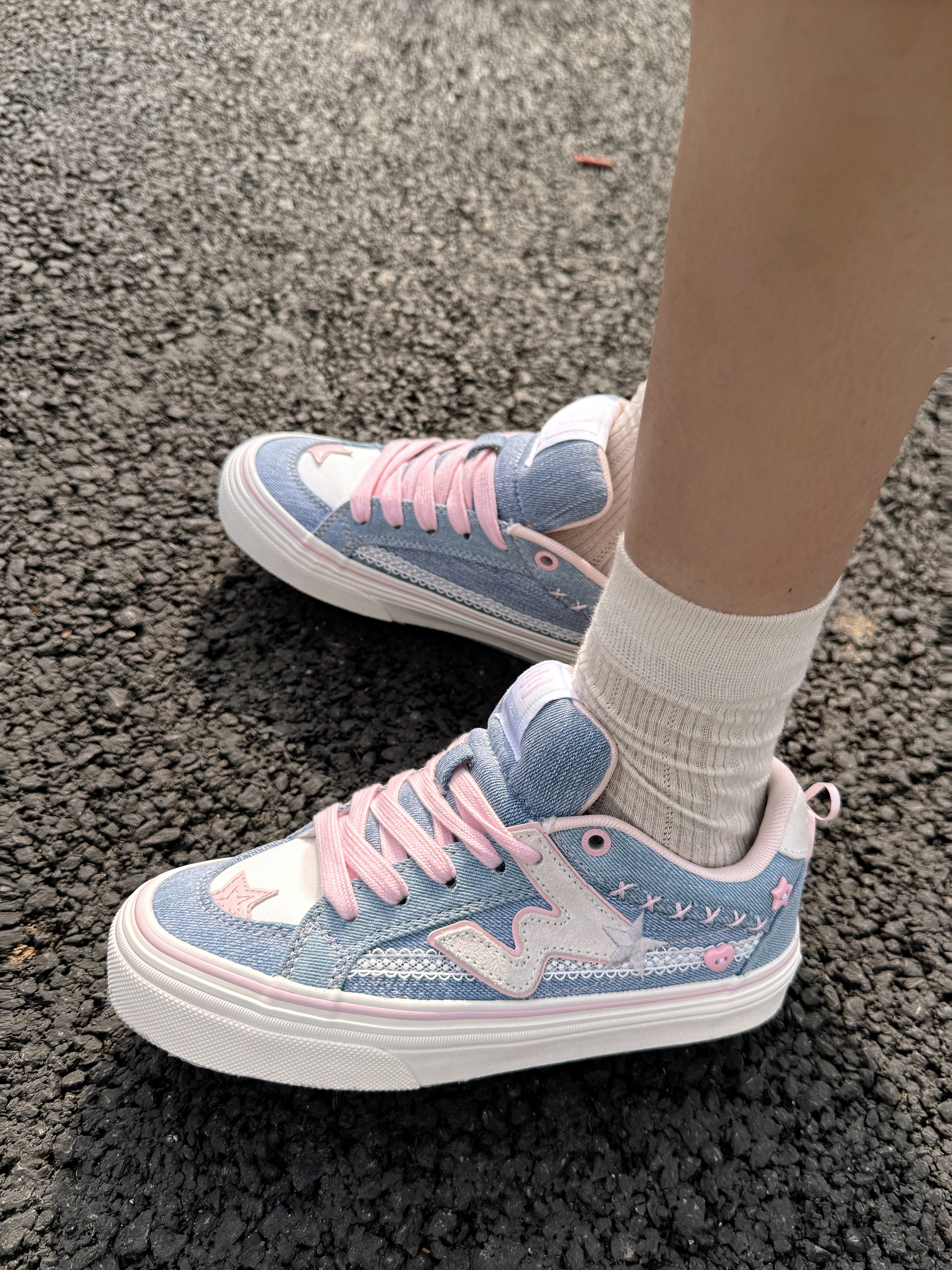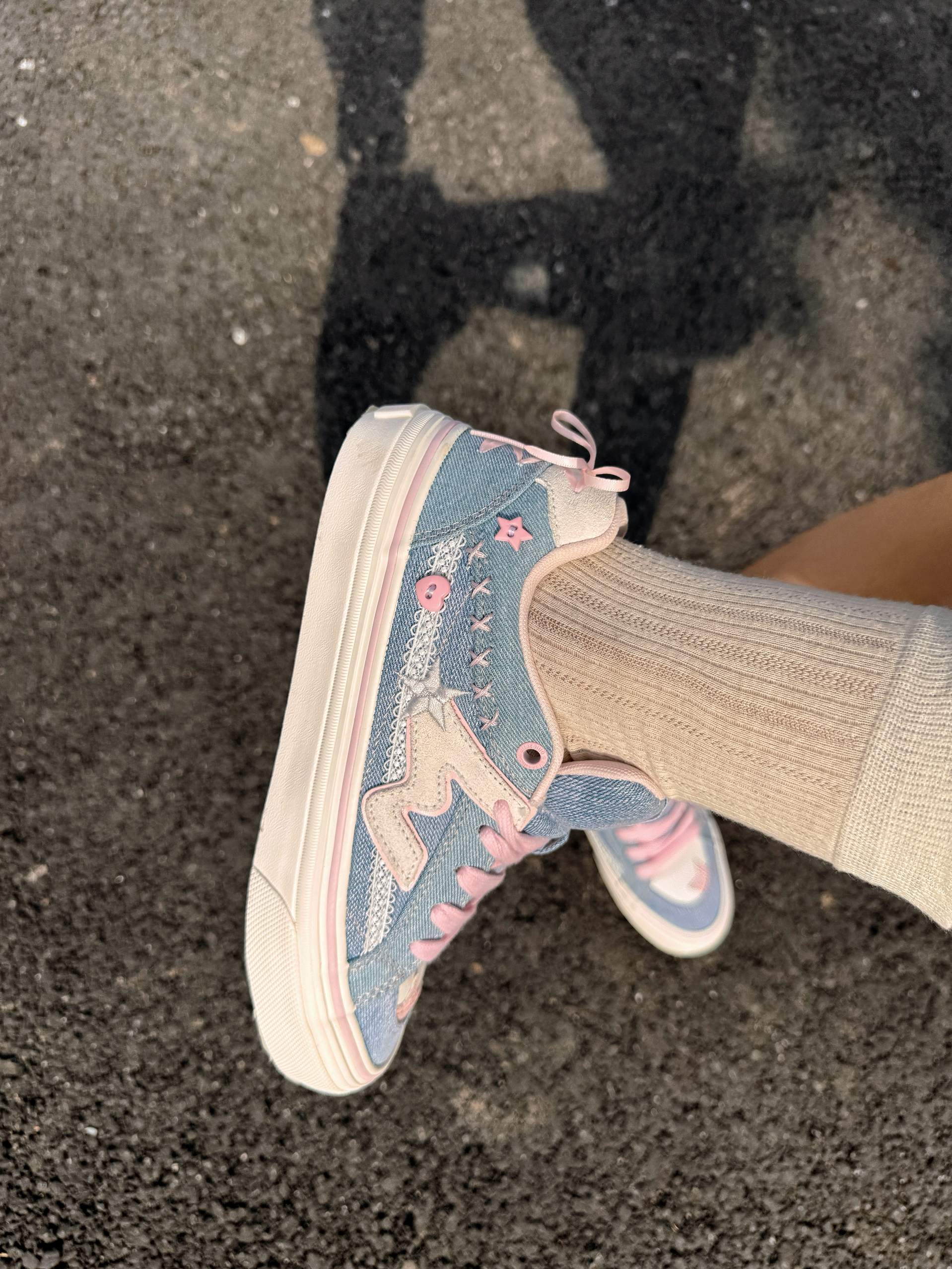 这双顽刻蝴蝶结🎀真的好乖呀! 水洗牛仔篮自带复古滤镜,而且会比白色的一些更耐脏 并且也会比黑色多了一点点活泼的感觉🤩 这双鞋最让我惊喜的点是后跟处的蝴蝶结 在走路的时候还会很灵动的飘起来 侧边的小纽扣和星星图案刺绣也是非常有小心机的设计👾👾👾 特别适合在春天的时候搭配白褶群或者牛仔裤 就是那种青春校园女高的感觉~