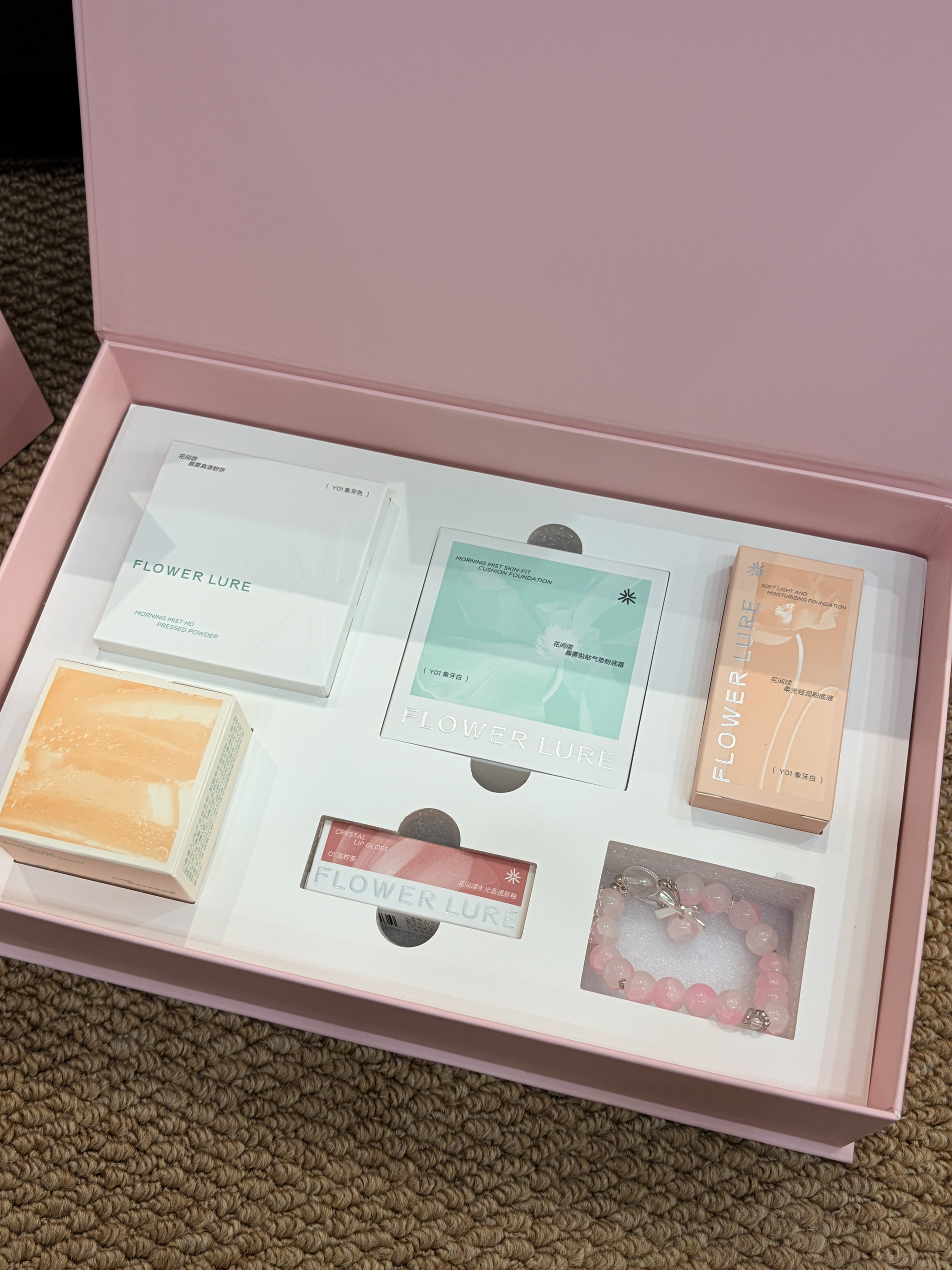 不得不说我选礼真的很有品呀 就介个花间颂的绮梦彩妆礼盒🎀 打开满满一盒的满足感谁懂哇😭 里面有粉饼➕气垫➕粉底液➕贴贴霜➕唇釉 还有招桃花的粉水晶手链诶💕 粉饼是我的无限回购自用好物了 粉质是尊嘟细腻 定完是微微缎光感的妆面 气垫里面的精华是真挺多的 很润很丝滑 上出来是清透奶油肌妆效~显得皮肤很好 粉底液也蛮滋润的 持妆力更好一些 像我干皮冬天就容易卡粉 它里面少不了的贴贴霜也是准备上啦 介一...