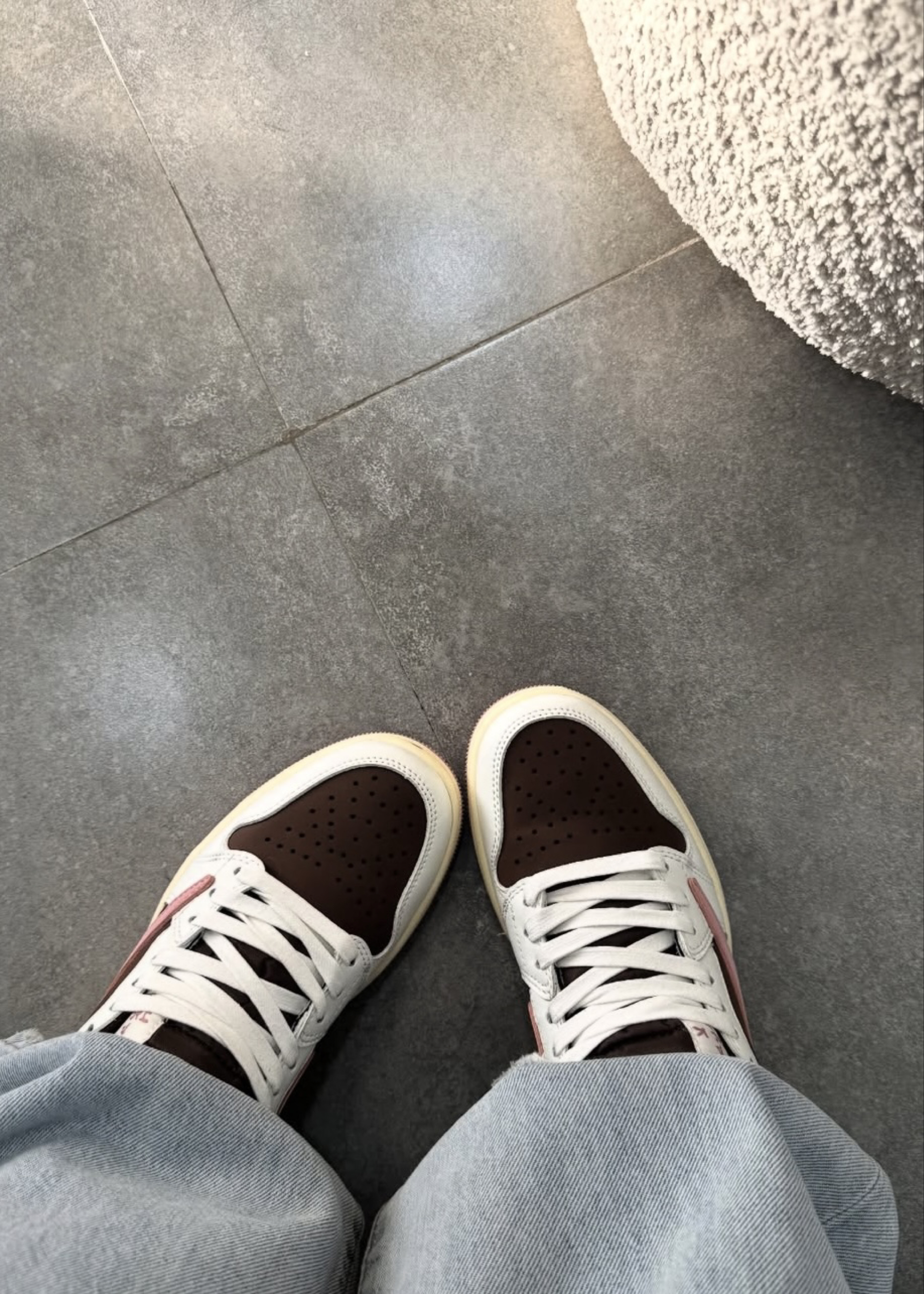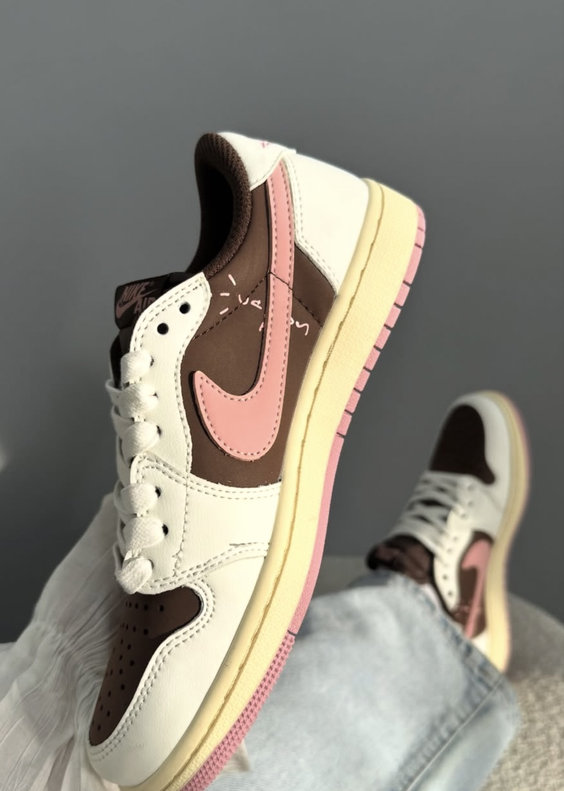 这双Travis Scott联名AJ1 Low真的太会了!深棕皮革拼接奶白鞋身,柔雾粉的反钩Swoosh直接戳中少女心,再加上做旧米黄中底和粉调外底,复古感和甜酷感直接拉满💯 • 低帮鞋型对脚宽星人超友好,上脚不挤脚,暴走一天也不累 • 穿搭公式:浅蓝阔腿牛仔+白T+咖色棒球帽,美式校园感拉满;搭黑色牛仔短裙又秒变甜酷辣妹 • 小众配色不容易撞款,颜值和质感双在线,甜妹也能穿出街头酷感