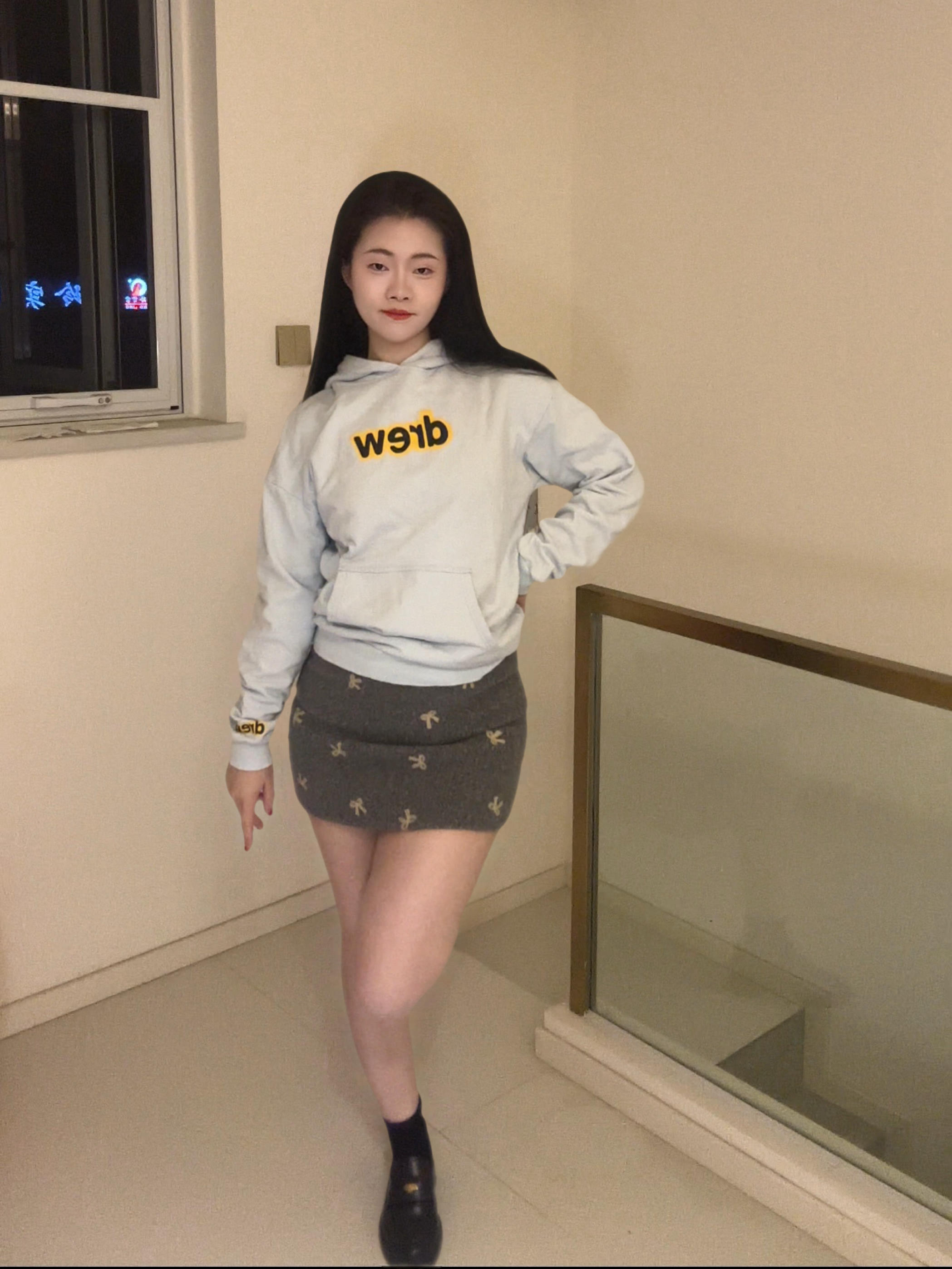 梨形身材怕穿短裙显胯宽?这套浅蓝卫衣 + 灰裙直接封神!浅蓝连帽卫衣宽松藏肉,搭配灰色蝴蝶结短裙,中和甜腻又显腿细;厚底乐福鞋 + 黑袜,秒变韩系甜妹,学生党百元内就能 get,春秋单穿、冬天内搭都合适。你们觉得这套甜妹穿搭打几分?关注我,下期出同款链接 + 显瘦技巧!