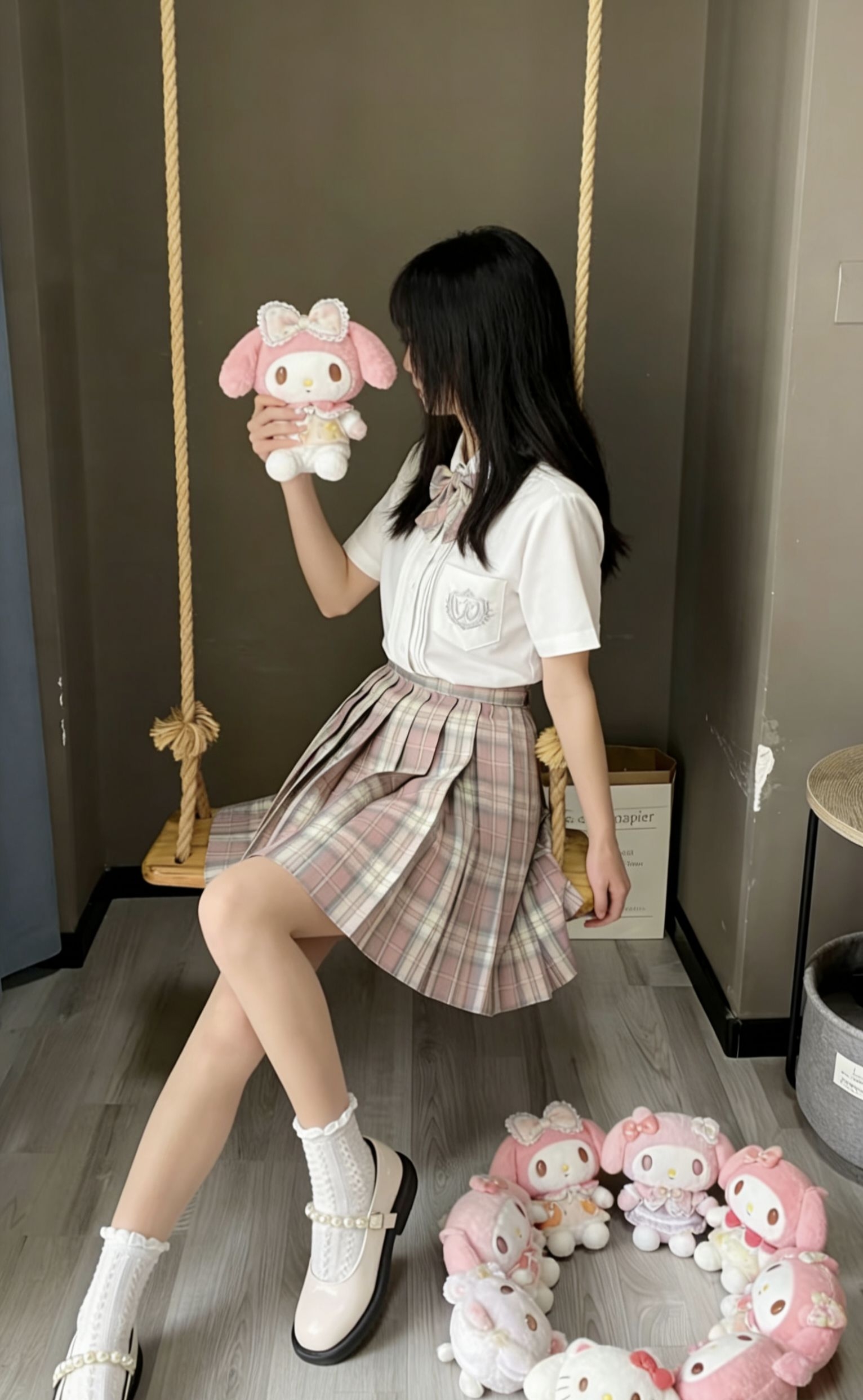“把春天穿在身上,做永远的甜妹。” ▪️ 粉格JK:永远的少女感神装 ▪️ 蕾丝白袜:氛围感加分项,精致到脚尖 ▪️ 搭配灵感:玩偶挡脸=不露脸拍照天花板 早春的第一套心动穿搭,献给这套粉色系JK。 不用刻意凹造型,坐在秋千上就很出片。 喜欢甜妹风的姐妹,这套闭眼入不亏!