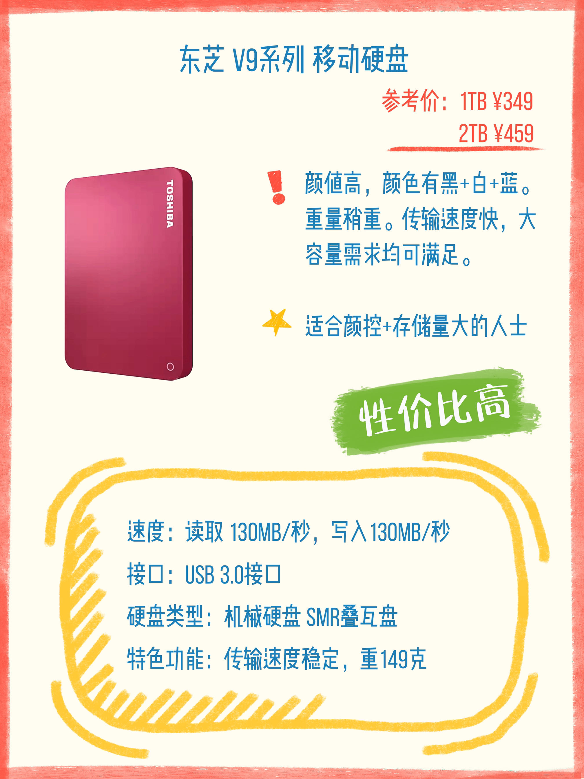 ▫️今天为大家分享6款性价比很高而且性能不错的移动硬盘,硬盘容量告急的小伙伴,赶紧关注收藏吧📝📝📝 ▫️ ▫️下面快拿小本子记下来啦👇🏻👇🏻👇🏻 ▫️ ▫️首先,要明确需求,适合自己最重要🙋🏻♂️🙋🏻♂️🙋🏻♂️ ⭐️容量要求500GB以下考虑固态硬盘,速度很快;1TB以上选择机械硬盘性价比高,但速度稍慢。👏🏻👏🏻 ▫️ ▫️东芝 V7 移动硬盘 1TB ¥349 ⭐️价格划算,颜值高。读取...