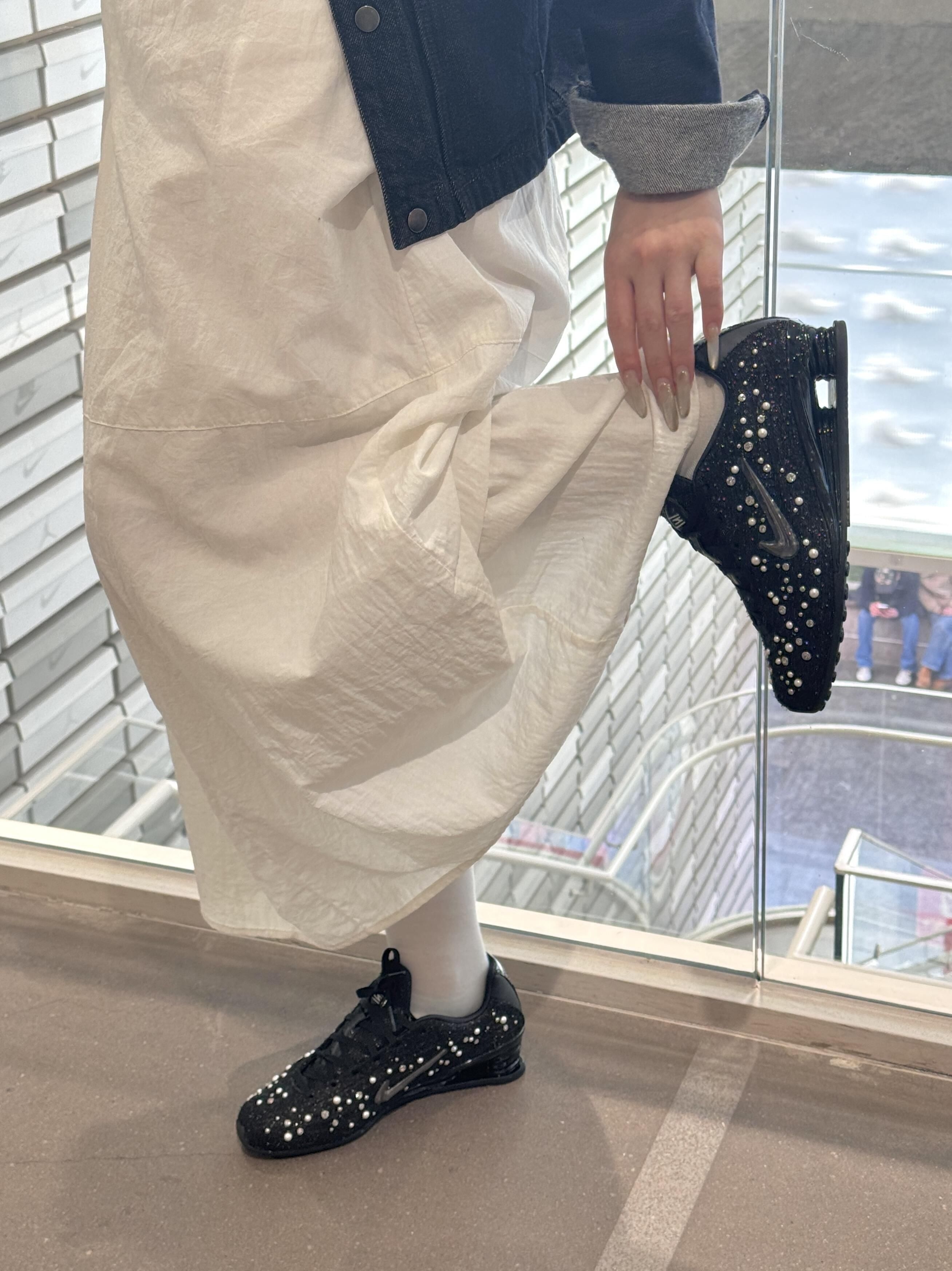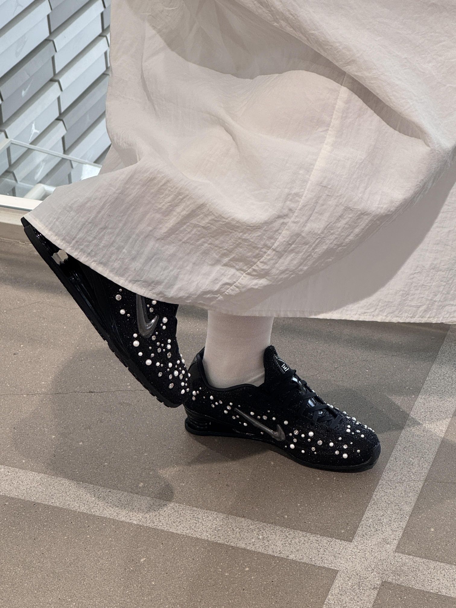 Nike Shox Z珍珠水钻款补货了‼️ 全黑鞋身嵌满切割水钻与温润珍珠,灯光下每步都像踩碎星光,暗夜里行走的星河本河🌌 ▪️ 闪度封神:透明水钻+手工珍珠,黑白撞出高级甜酷感 ▪️ 脚感黑科技:Shox气柱缓震稳如踩云,低帮流线巨显脚踝细 ▪️ 穿搭王炸: ▫️ 配黑色皮衣+短裙=甜酷穿搭轻松拿捏🫴 ▫️ 搭复古牛仔+白T=极简街头风 ▫️ 韩系推荐:外搭浅色牛仔外套 + 内配白色长裙,清新休...
