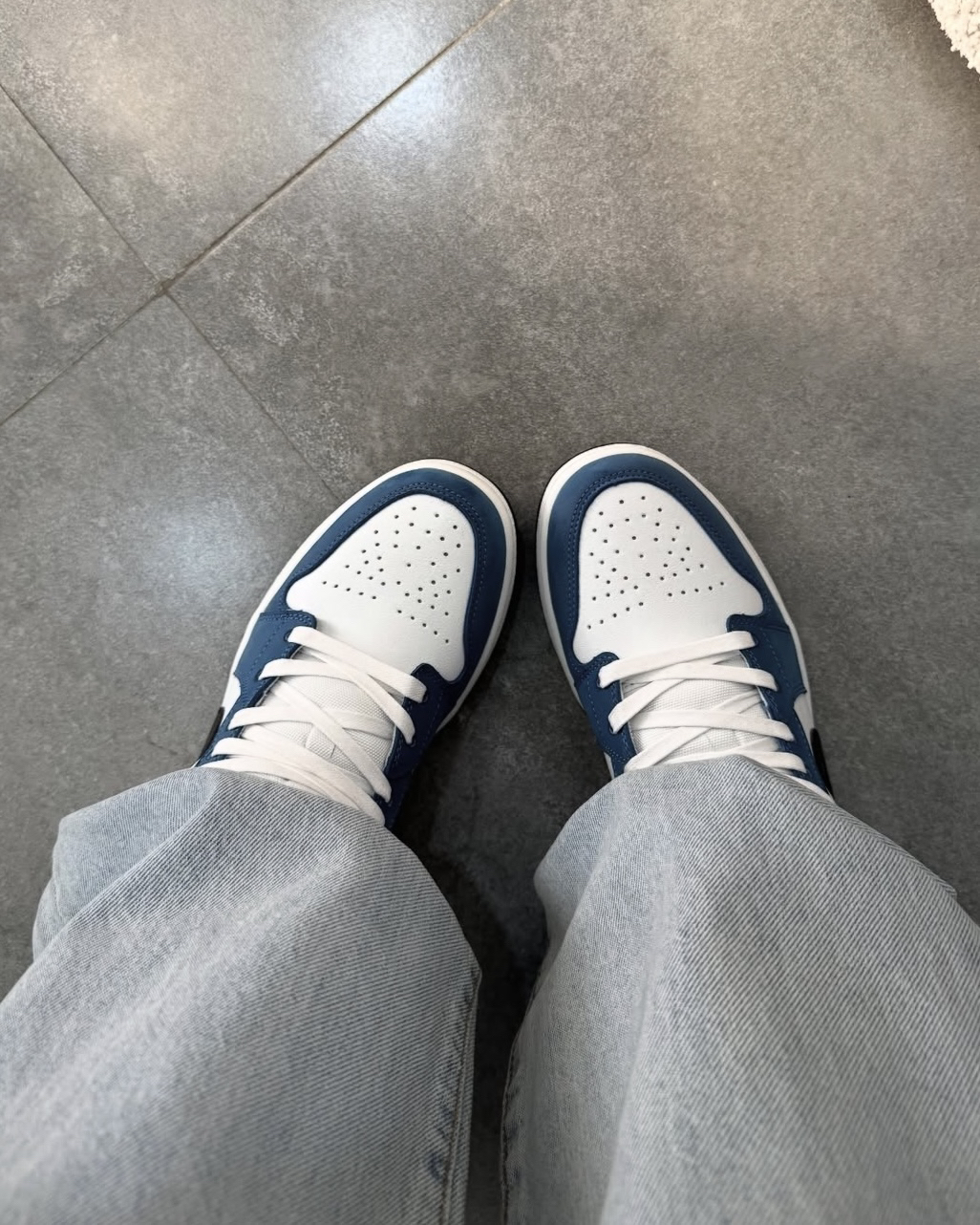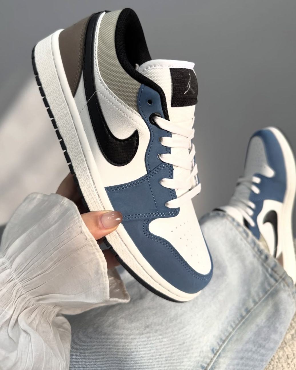 谁懂啊!这双AJ1 Low真的长在我的审美点上✨ • 白蓝撞色+浅棕点缀,像把春日的晴空揉进鞋里,清新又治愈 • 磨砂皮革+防撕裂细节,质感拉满,摸起来软糯不僵硬 • 低帮设计对宽脚星人超友好,不压脚背还显腿长 • 搭浅蓝牛仔裤=美式校园风,配工装裤秒变复古潮人 春天的氛围感,这一双就够了!👟💨