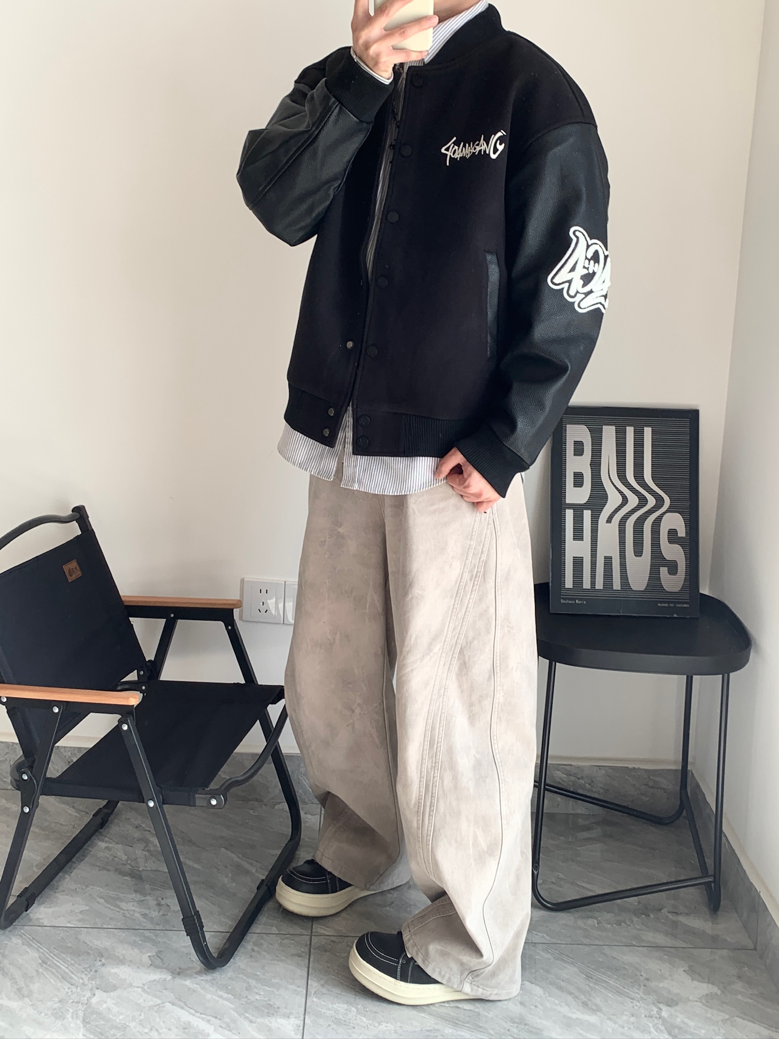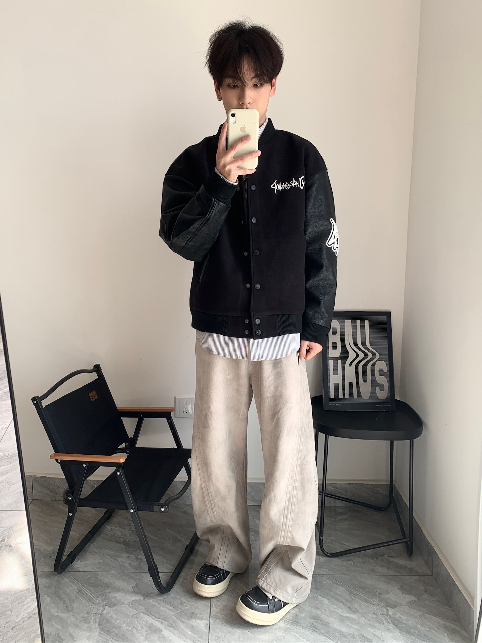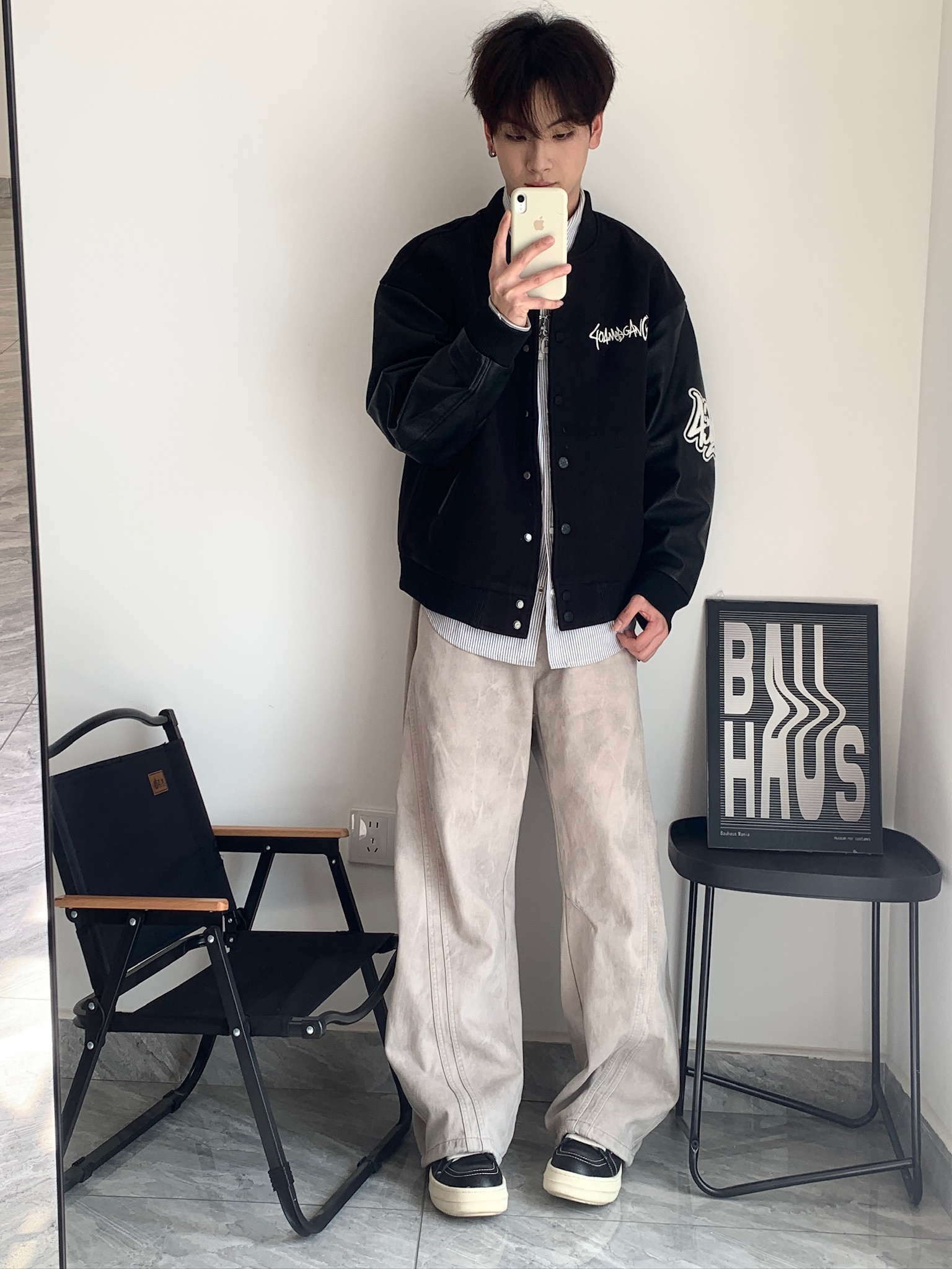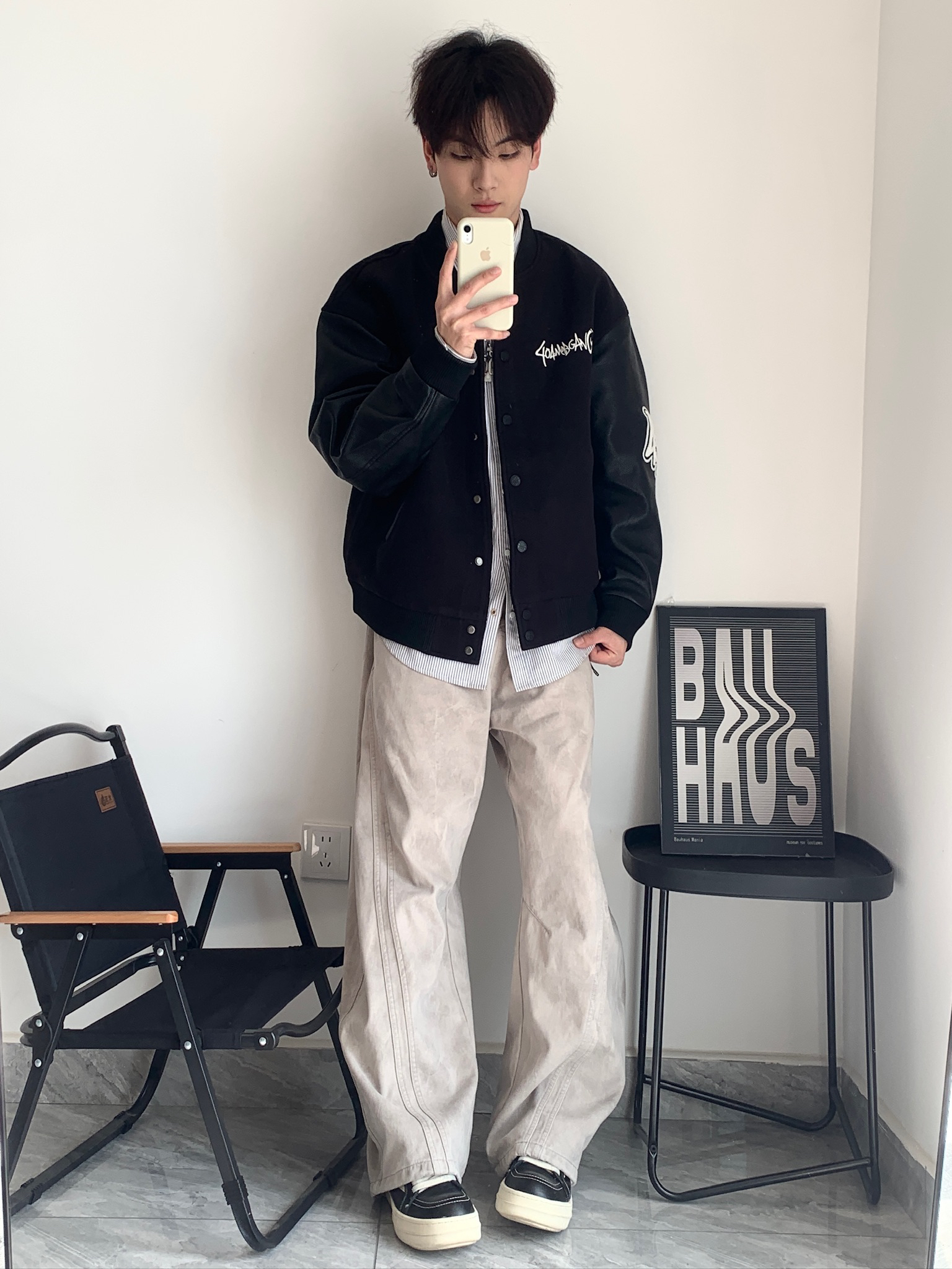 早春穿这件404棒球服真的太舒服了😌!毛呢面料很厚实,皮袖又很有质感,里面搭件条纹衬衫,层次感一下就出来了。下身配浅灰阔腿裤,宽松又显腿长,走路带风的感觉谁懂啊!随便搭双板鞋,出门回头率超高,简单又干净,男生这么穿真的很难不爱~
