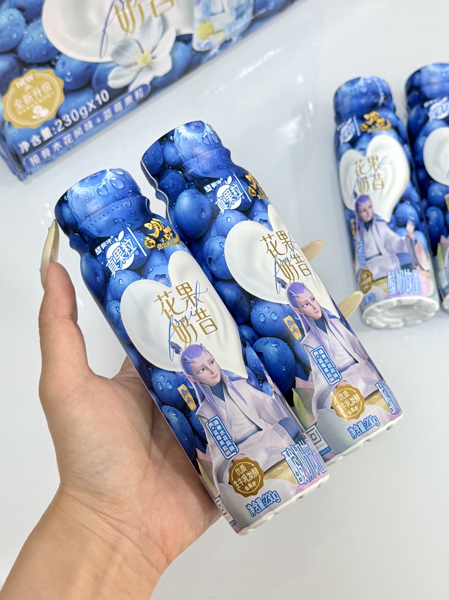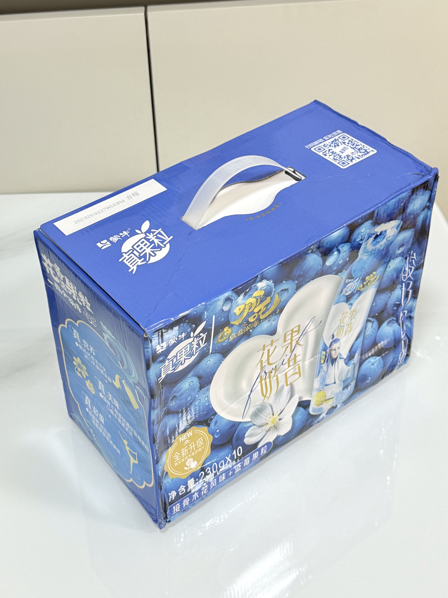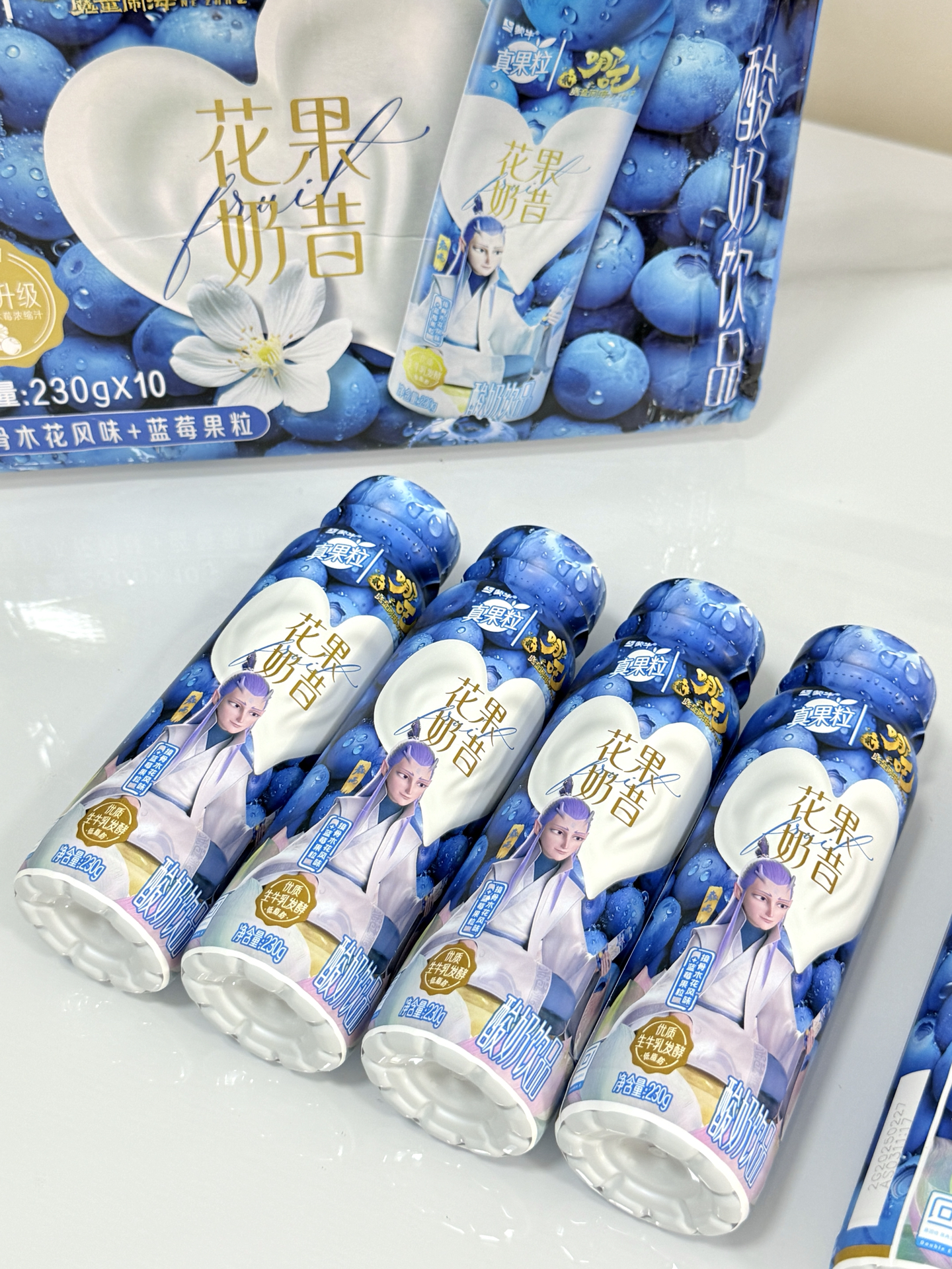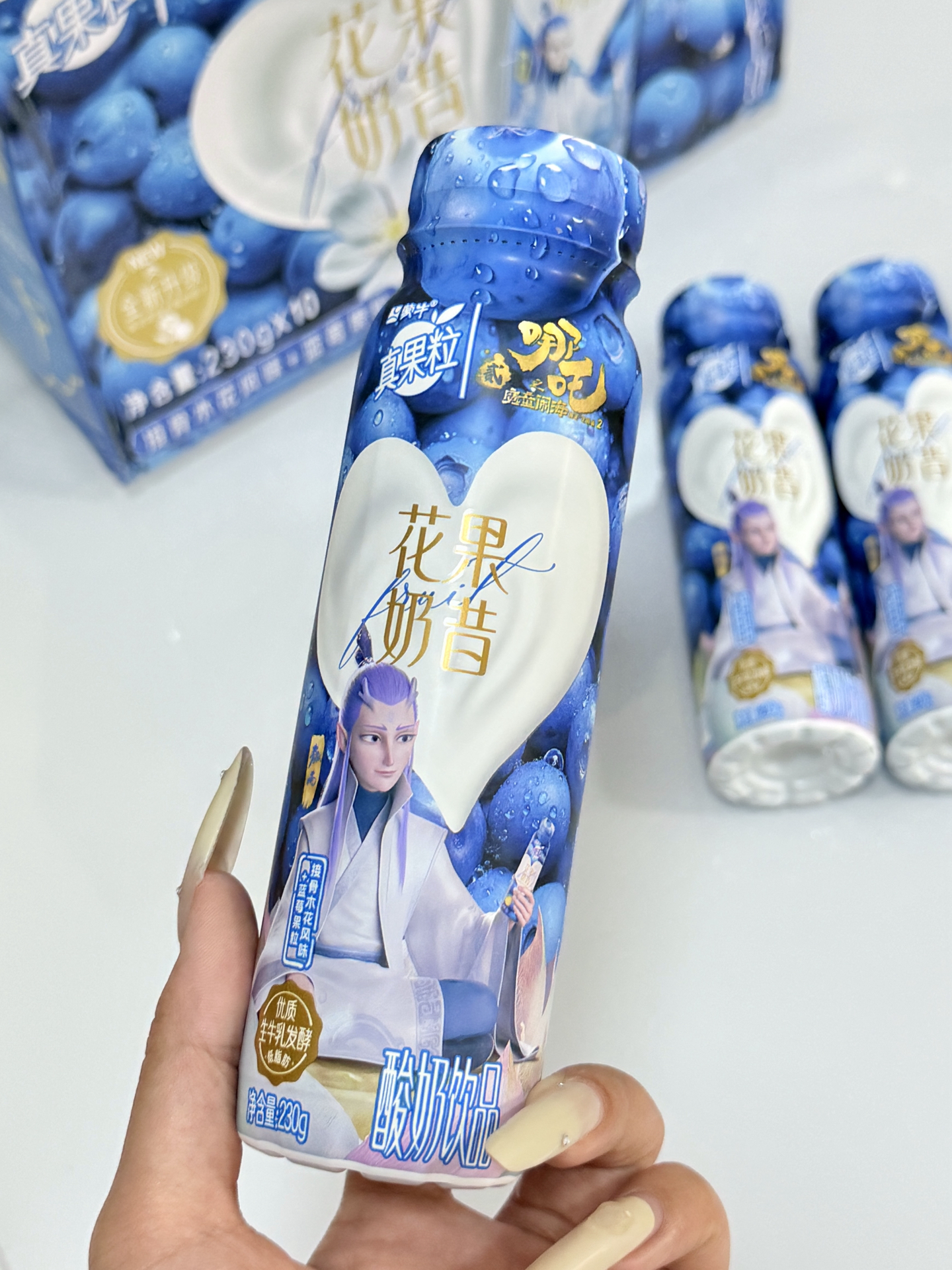 我发现蒙牛和敖丙联名的花果奶昔,包装是敖丙造型,拿在手里好喜欢~ 接骨木花蓝莓味,口感比平常真果粒浓点,就是含糖怕胖😭。 吃饭或和朋友出游我常带,10瓶一箱够喝阵儿~
