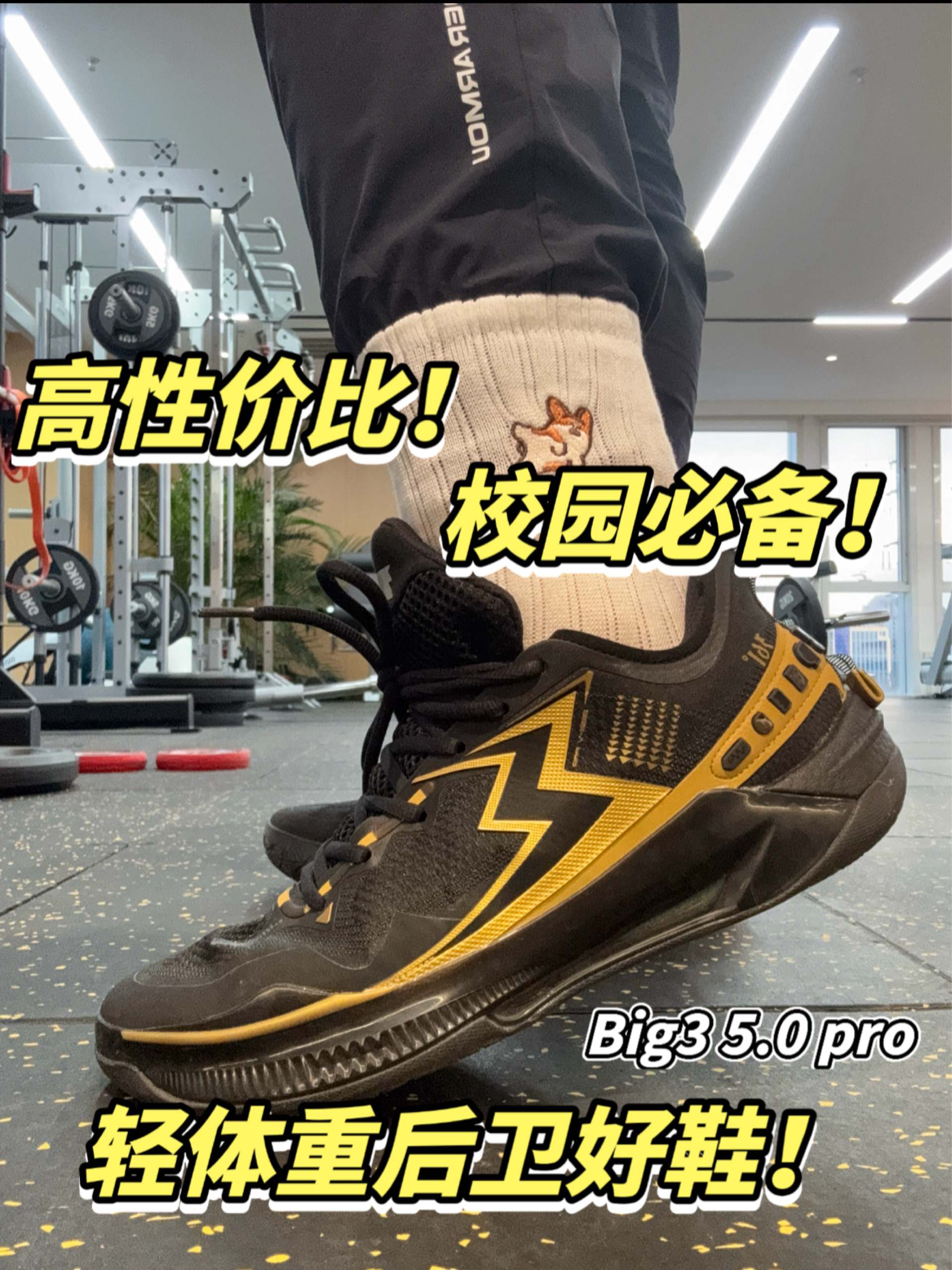 👟球鞋名称:BiG3 5.0普通版 📌尺码:不偏码,平常穿着43-44,购买码数43,留了一点空间,上篮给脚趾留了一段距离缓冲到鞋头,十分合适 包裹:包裹很爽,但初上脚的时候会顶小拇指,3-4场后有所缓解,实战很多场都没有出现过掉跟现象 缓震:轻体重够用,缓震上限不高。 抓地:采用密集的三角形纹路,实战都在外场,在室外油漆地很少出现滑倒现象 耐磨:耐磨算是一般,但还是值得推荐的球鞋 稳定:合格,...