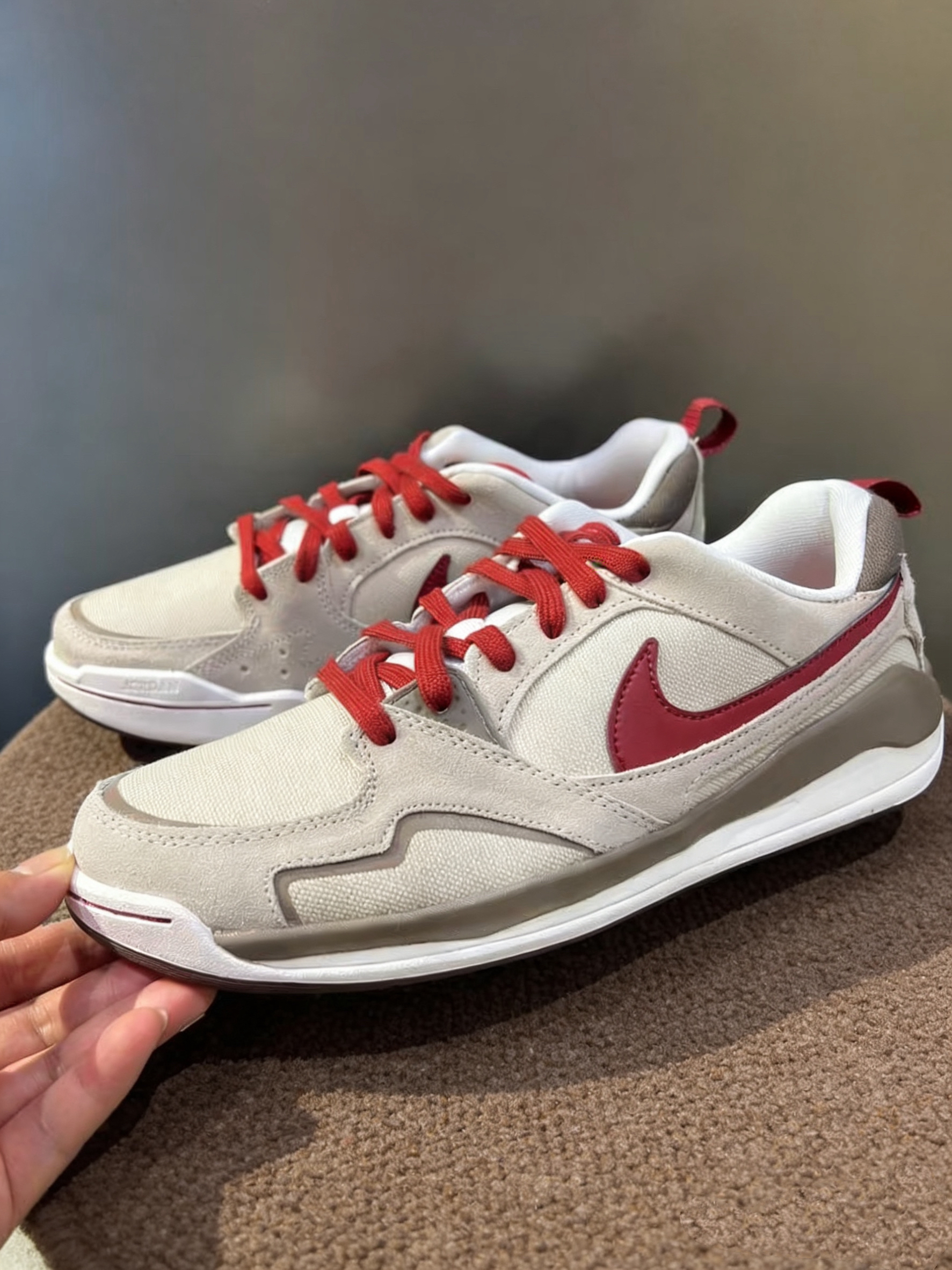 奶杏+酒红🍷配色新年氛围感🈵🈵 麂皮+帆布拼接,质感细腻又透气,金色飞人logo和祥云☁刺绣好精致! CMFT泡棉中底,脚感软弹,长时间穿也很舒服,宽楦设计对亚洲脚型友好,后跟提拉带穿脱方便~ 款式复古百搭,牛仔裤、运动裤都能轻松驾驭,节日or日常出街都不错~