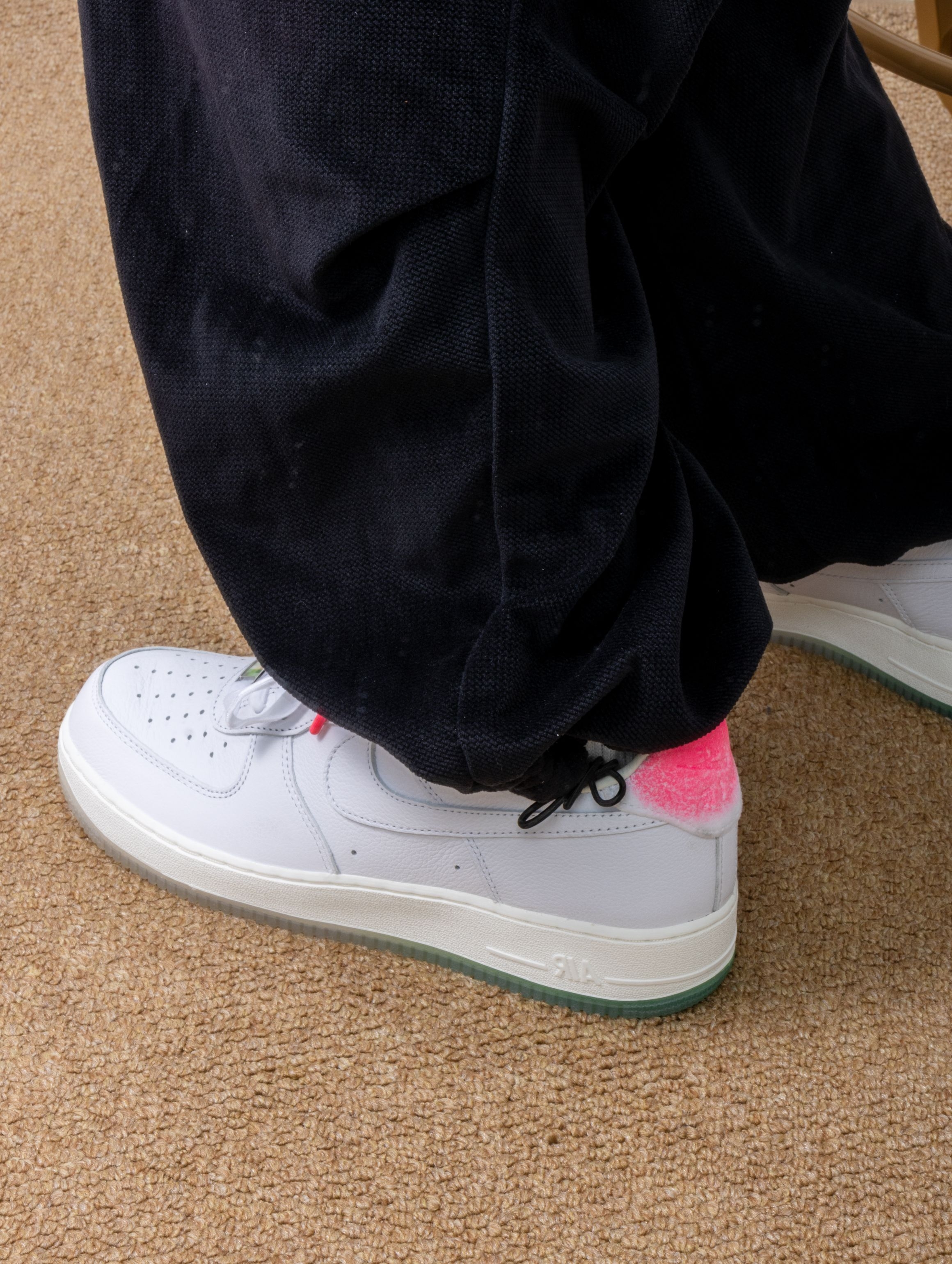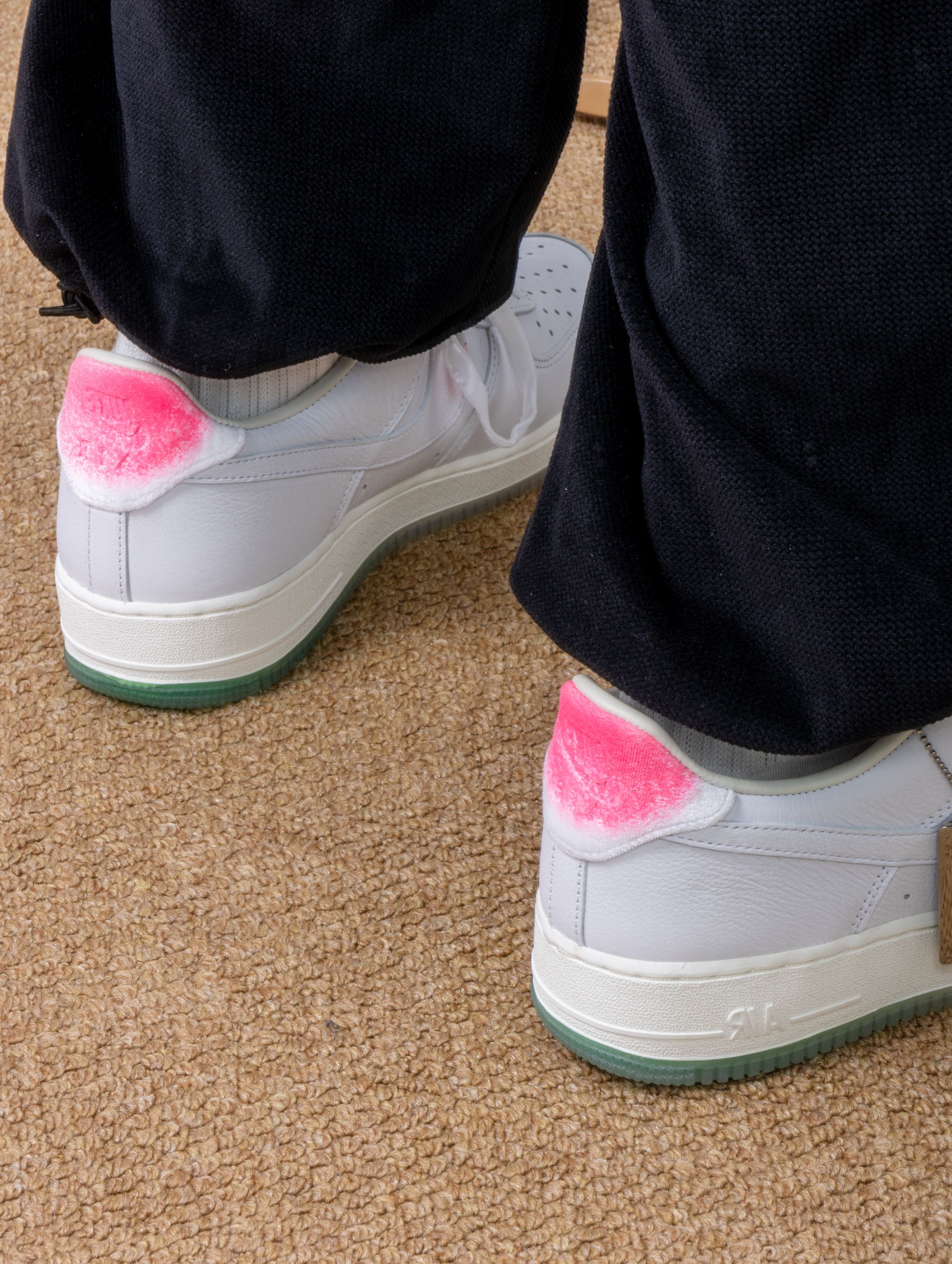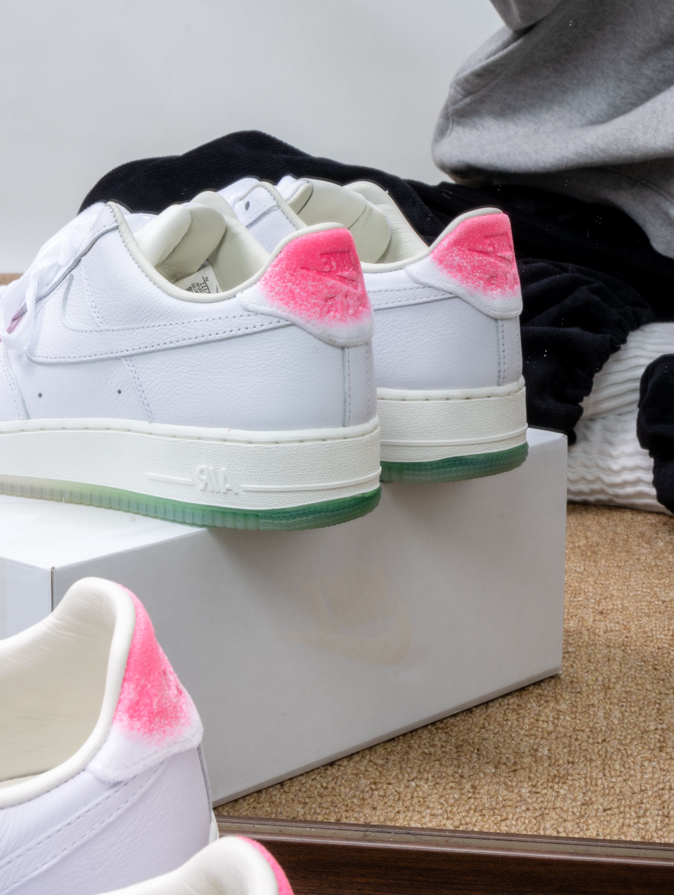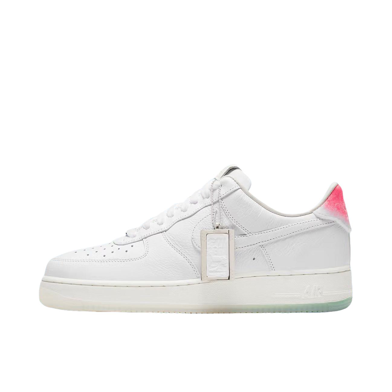 Nike这双寿桃AF1实物比图片还要可爱!纯白皮革鞋身干干净净,后跟那块粉红渐变真的绝了——像水蜜桃尖儿上那一抹红晕,毛茸茸的丝绒质感摸起来很妙。浅绿色果冻底透亮得能看见鞋垫印花,整体配色又甜又清爽。 上脚还是熟悉的AF1脚感,鞋垫软弹适中,走半天也不累。鞋舌内侧藏着小小的"GOT‘EM"刺绣,后跟还有寿桃轮廓压印。 一双能把好运和百搭焊得这么死的鞋,要的就是这种甜甜的仪式感。