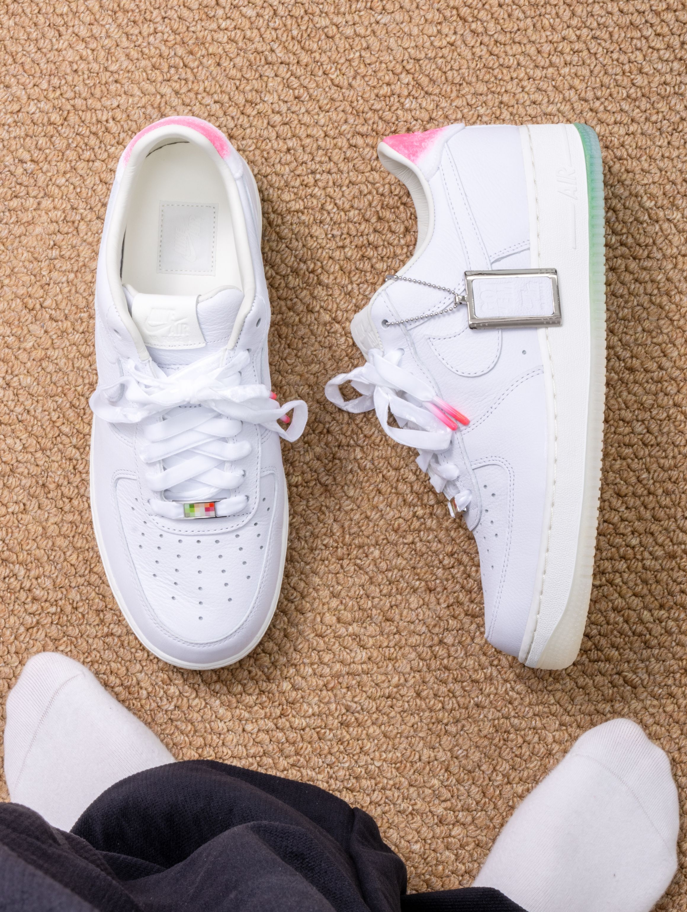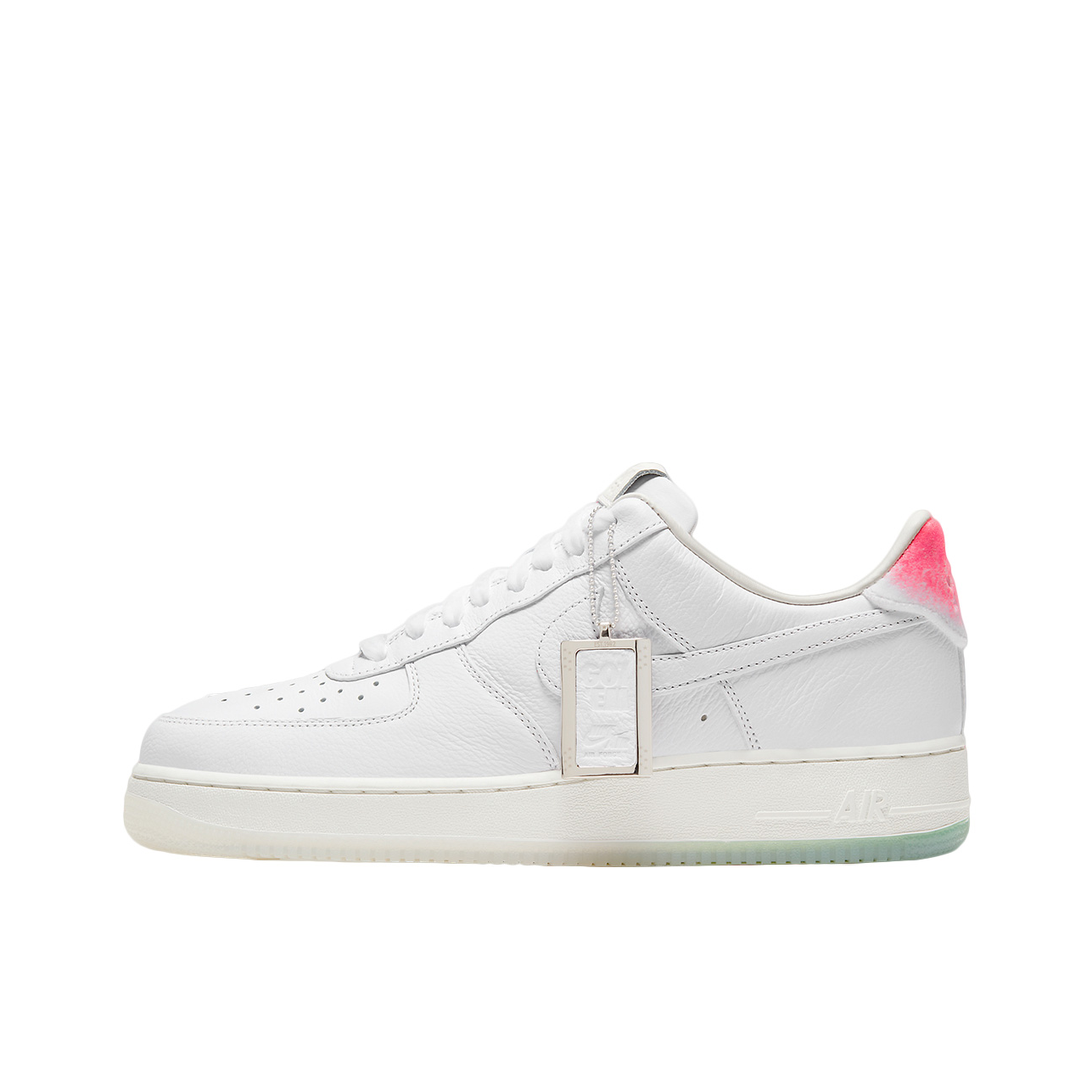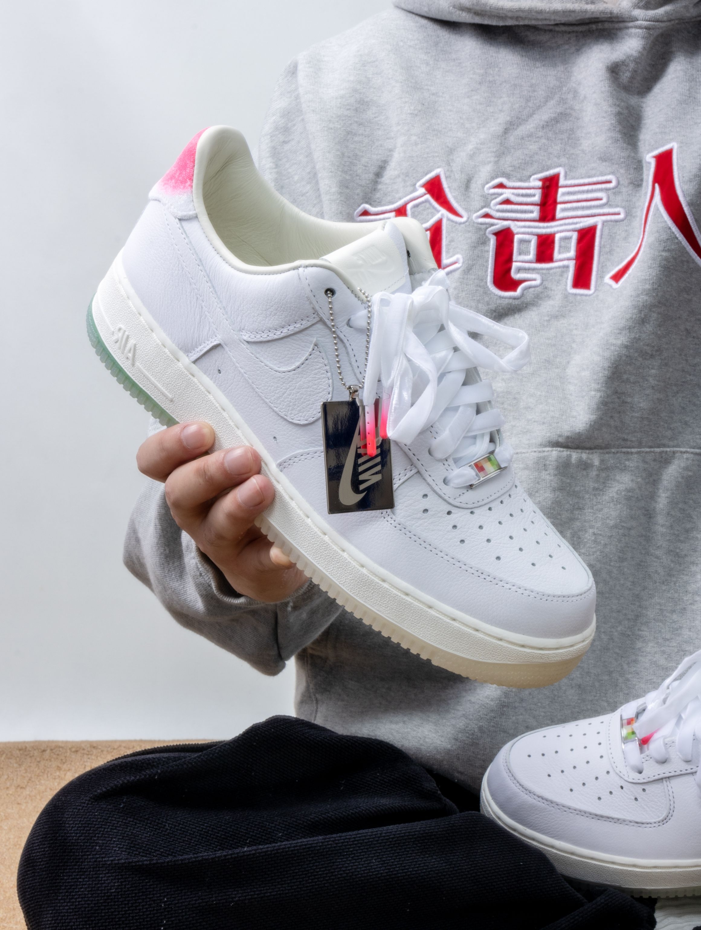 Nike这双寿桃AF1实物比图片还要可爱!纯白皮革鞋身干干净净,后跟那块粉红渐变真的绝了——像水蜜桃尖儿上那一抹红晕,毛茸茸的丝绒质感摸起来很妙。浅绿色果冻底透亮得能看见鞋垫印花,整体配色又甜又清爽。 上脚还是熟悉的AF1脚感,鞋垫软弹适中,走半天也不累。鞋舌内侧藏着小小的"GOT‘EM"刺绣,后跟还有寿桃轮廓压印。 一双能把好运和百搭焊得这么死的鞋,要的就是这种甜甜的仪式感。