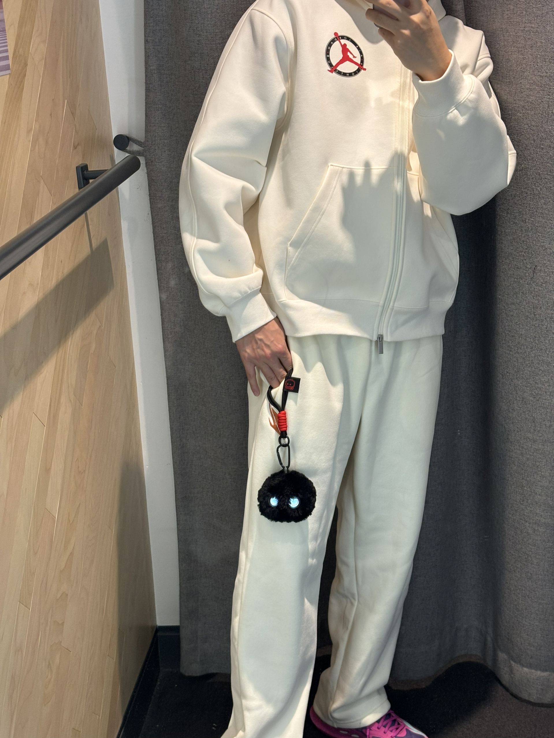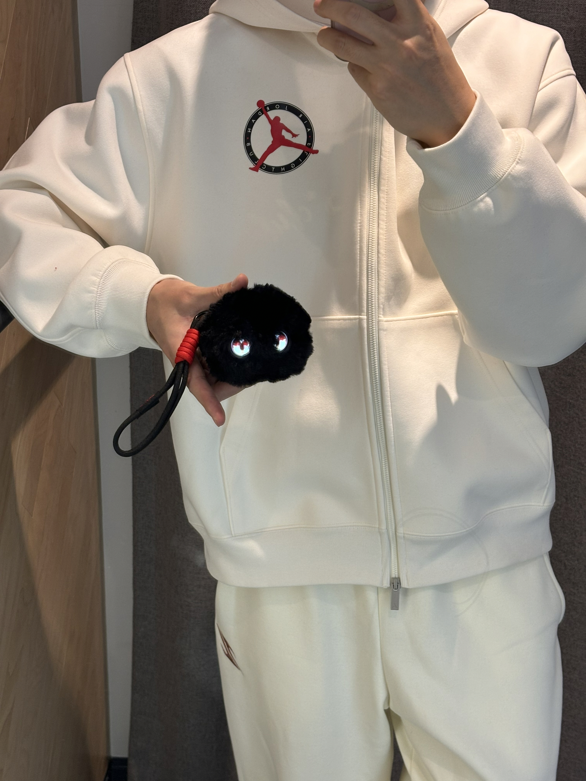 这个小黑毛球没想到这么好玩还可爱 它叫芙崽来自外星星球 毛茸茸的还有自己的语言 还可以和它聊天 就像是宠物有了自己的想法和人类的语言 这就很智能大大的眼睛👀真的水灵 挂在包包上斜挎包也可以 也很好搭配黑色小毛球也很有质感 挂在口袋上也可以哦 马年就这么穿搭了白色一身搭配小黑子 👔jordan卫衣 👖uzis斗志 🐈⬛芙崽 水属性