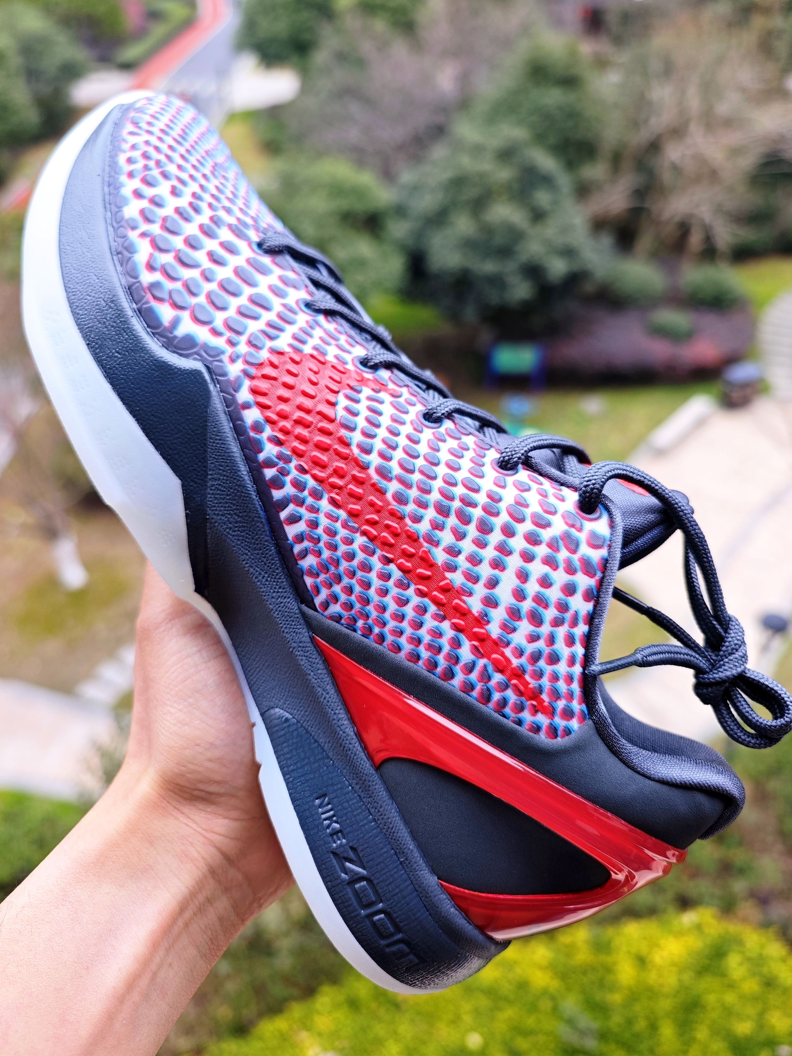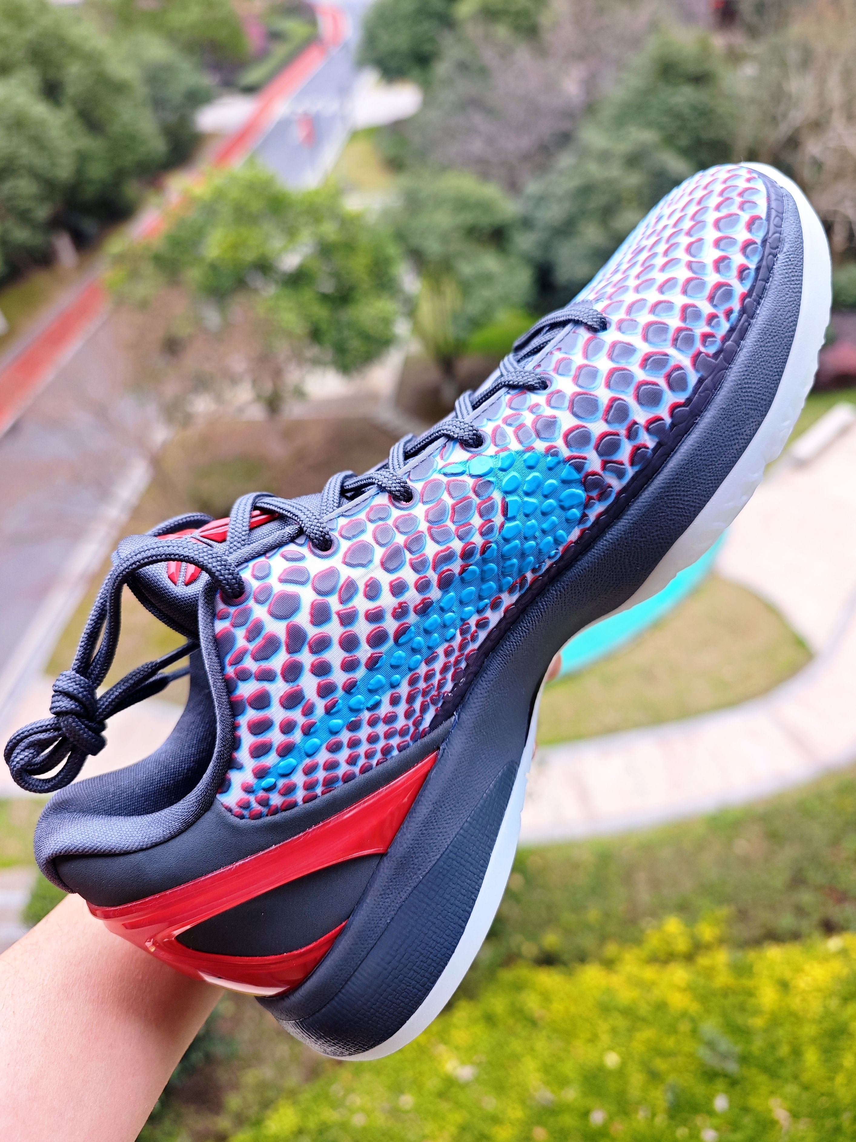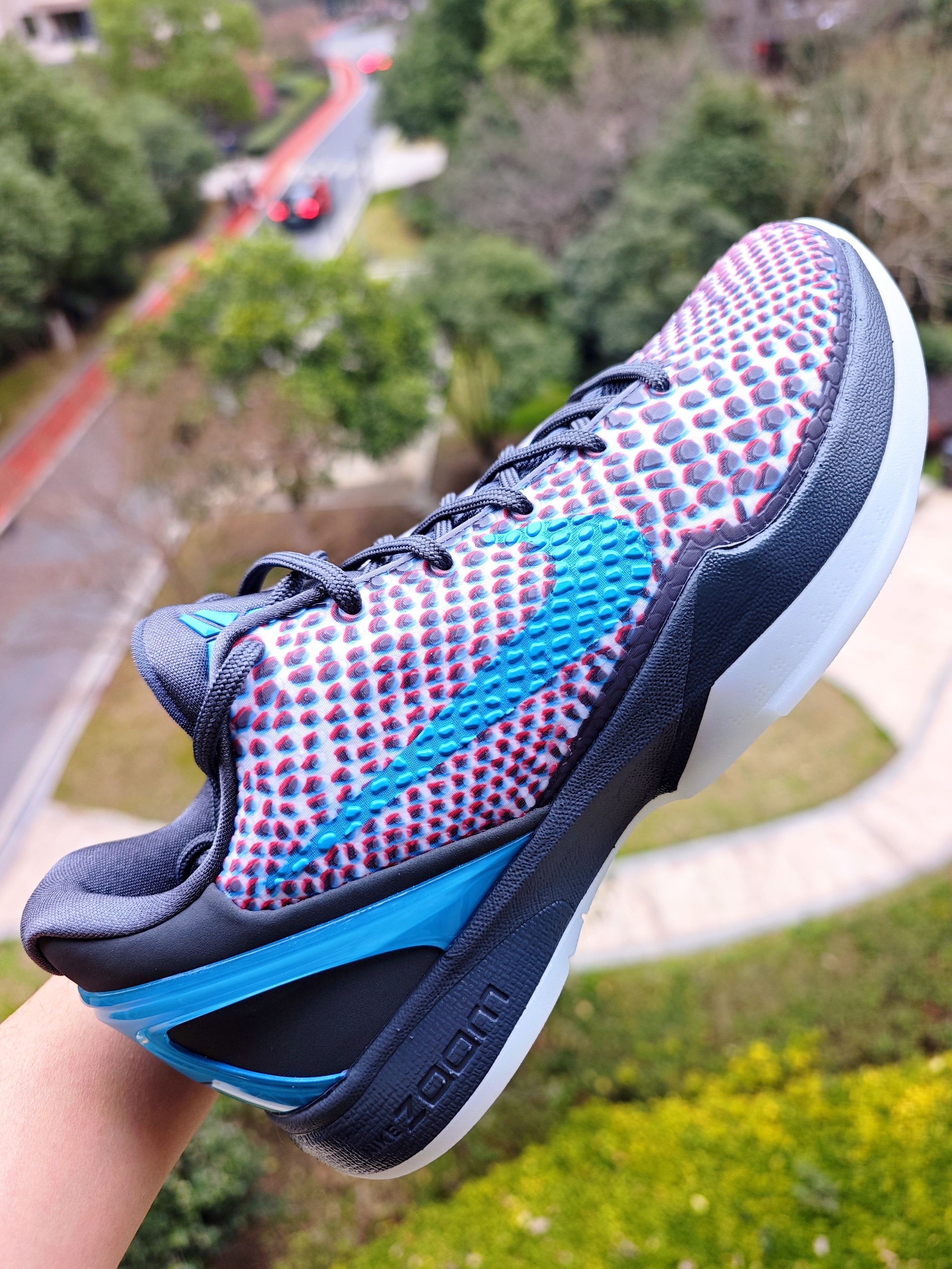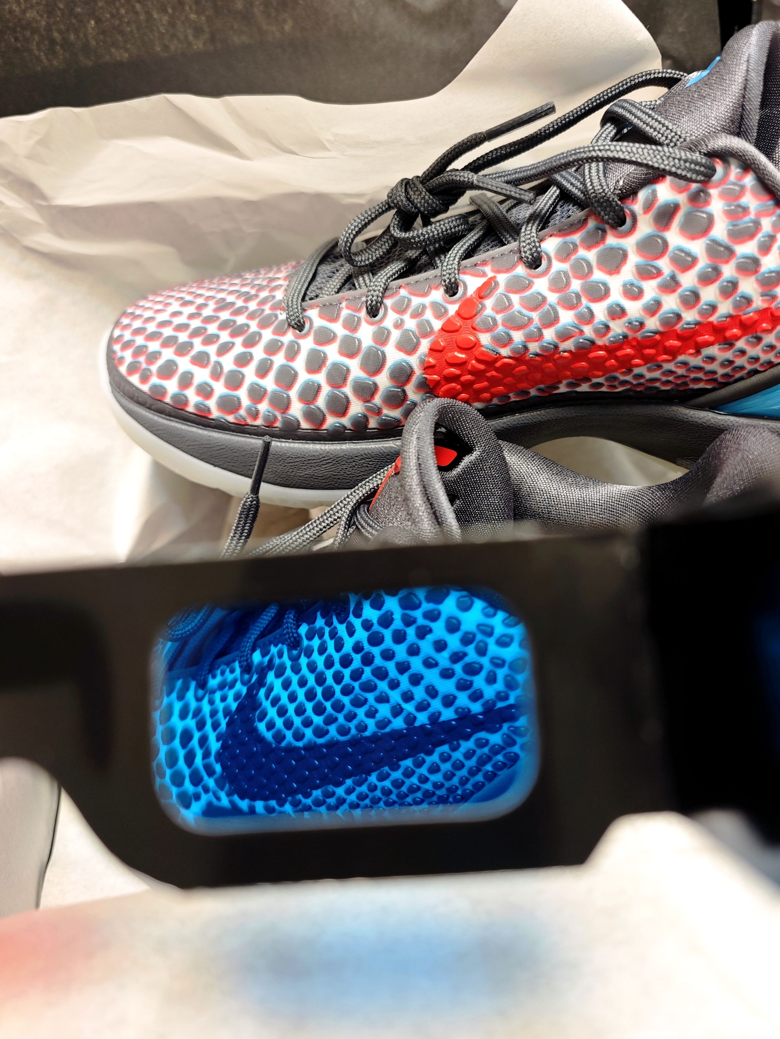 👀年前线下原价中的科比6,老婆大人中的,辛苦帮忙中午去提的鞋子🌹 这是一双复刻的科比6,首次发售是2011年,那时候3D电影当红,这个设计可谓是非常的契合当时的时尚 如今3D电影已经习以为常,戴上附赠的红蓝眼镜,我确实是看到了鞋身蛇鳞片处变成了3D效果,确实是3D设计,这个是名副其实的 我喜欢这双主要还是鸳鸯配色,鸳鸯配色的科比6就这么一款,科比6没有what the...