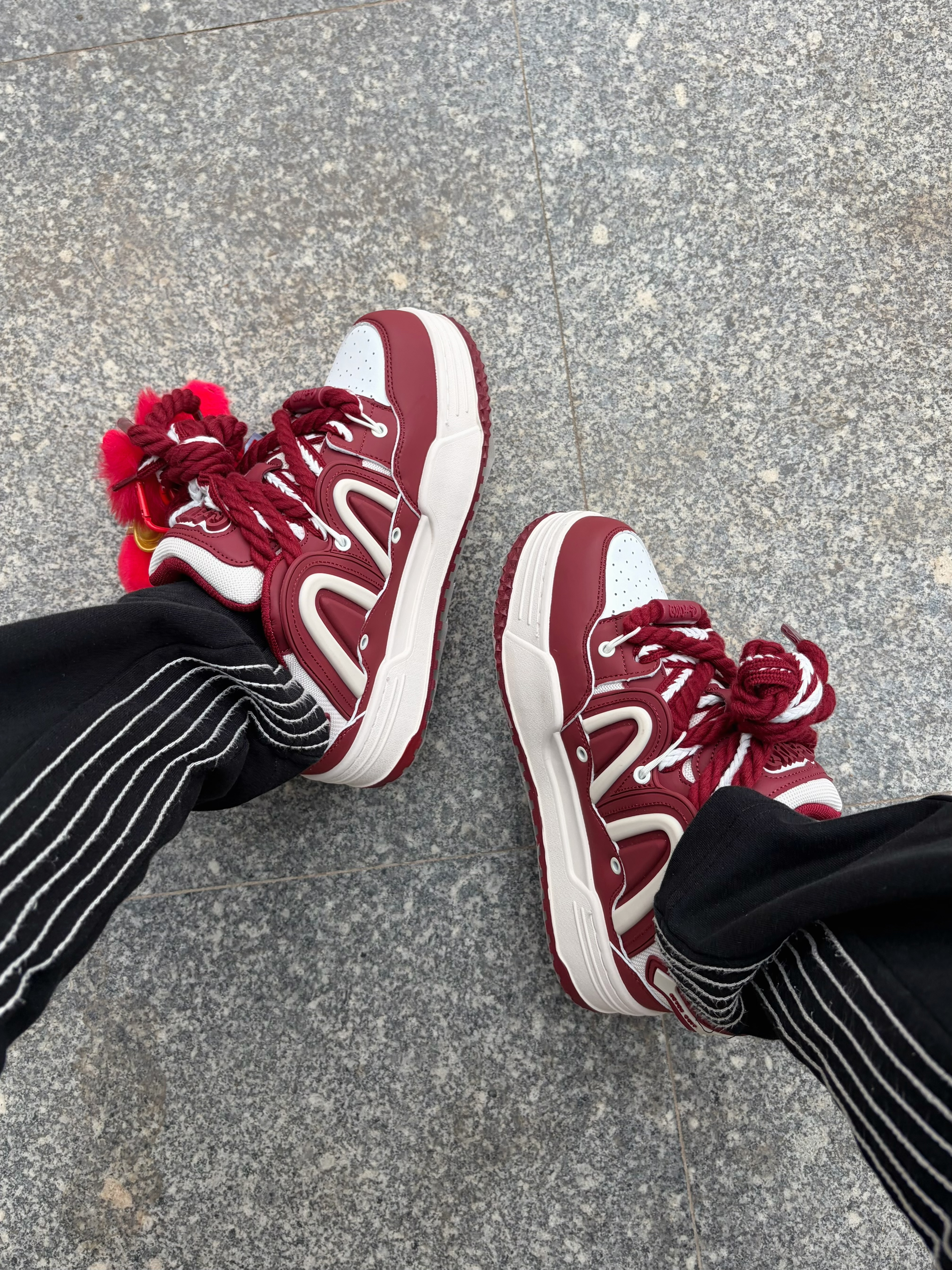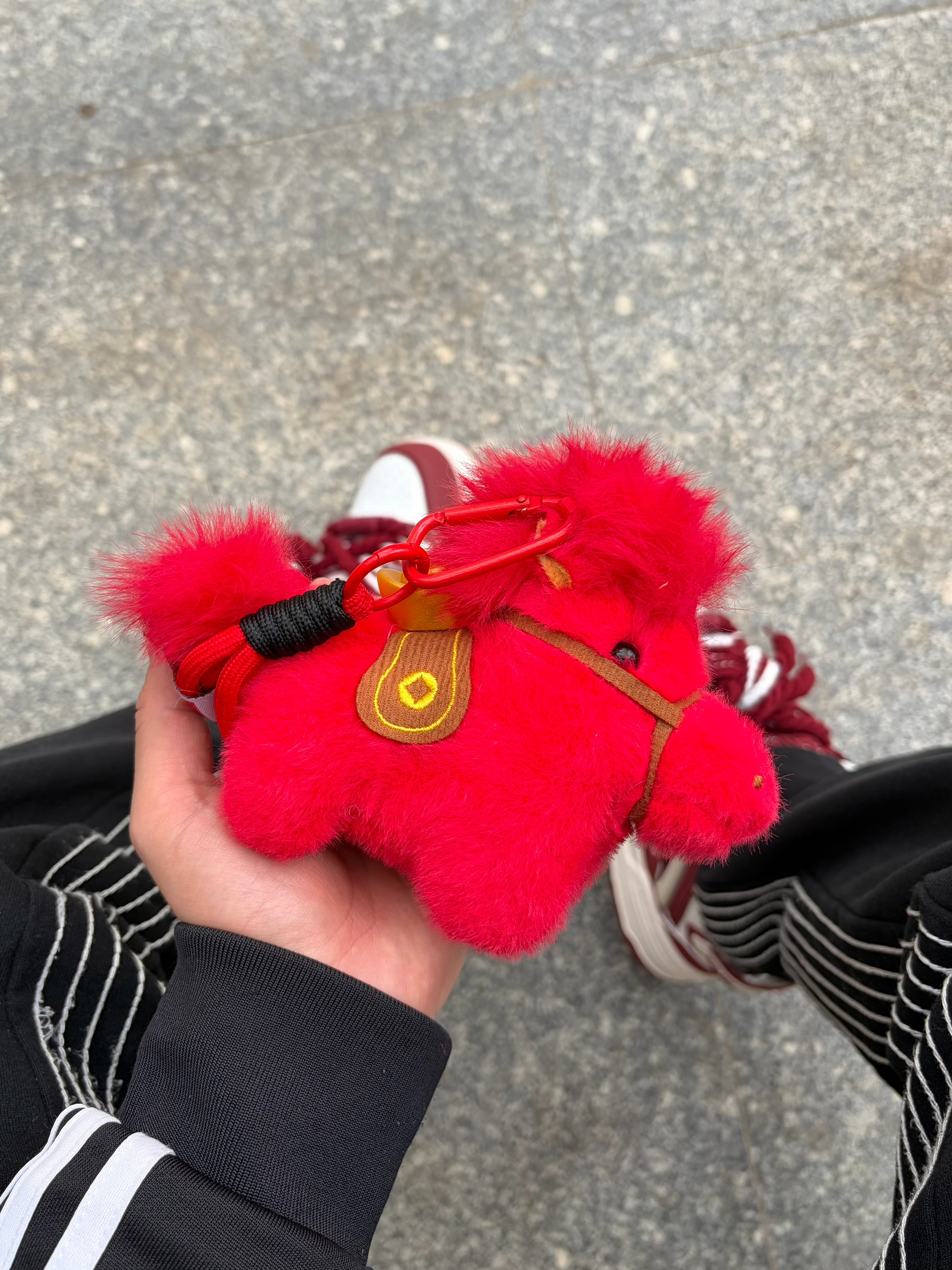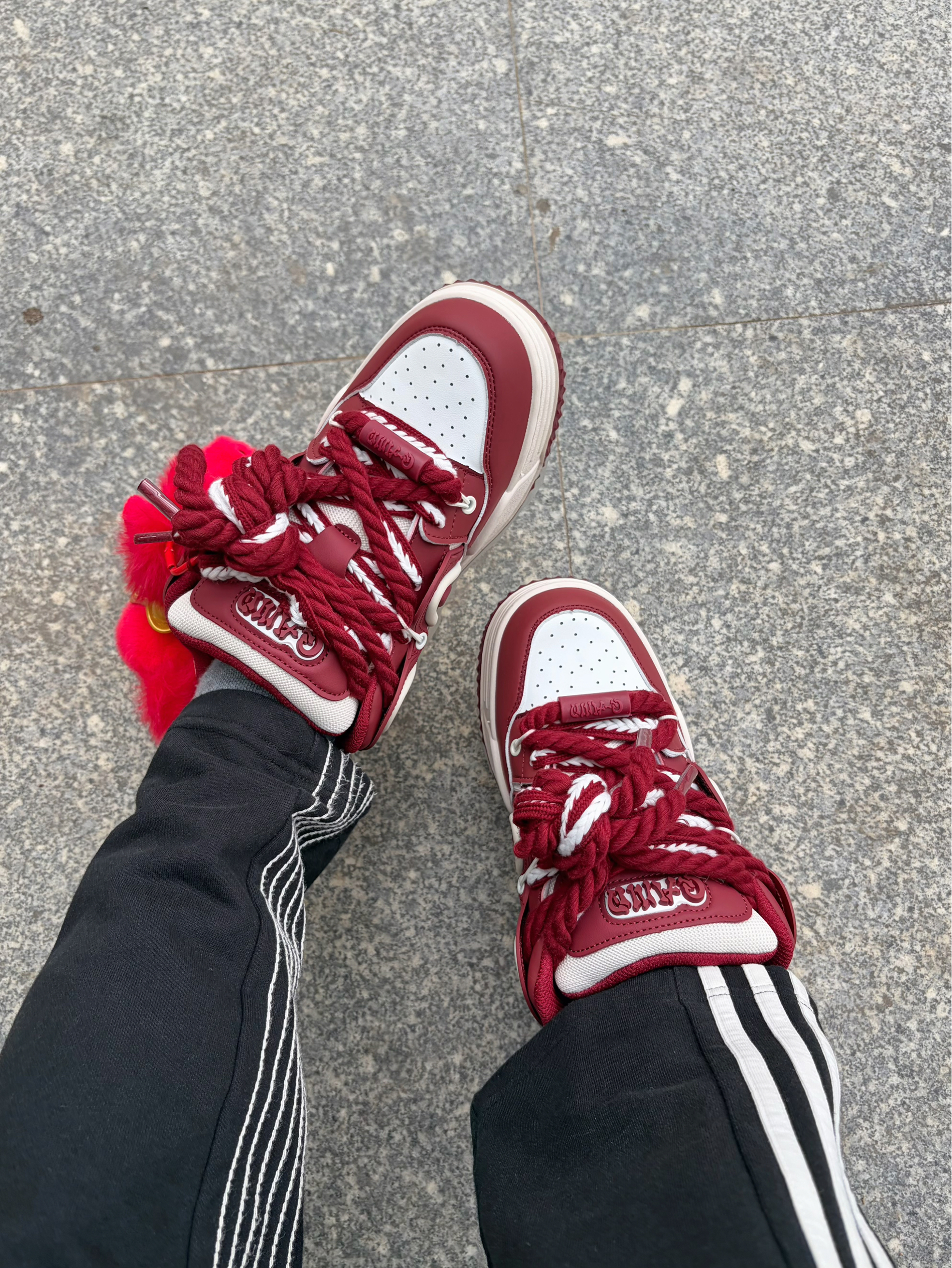 新年出门总想要点氛围感🧨 Q-AND 这双酒红白拼色板鞋👟 自带复古运动感 配色映衬新年 脚边的小马挂饰点缀刚好呼应鞋子配色♥️ 毛茸茸的红绒质感很讨喜🔥 驮着金元宝寓意也够好✅ 一身经典的黑白运动套装👔👖做基底 整体造型简约不单调 新春出街或走亲访友都合适🚶