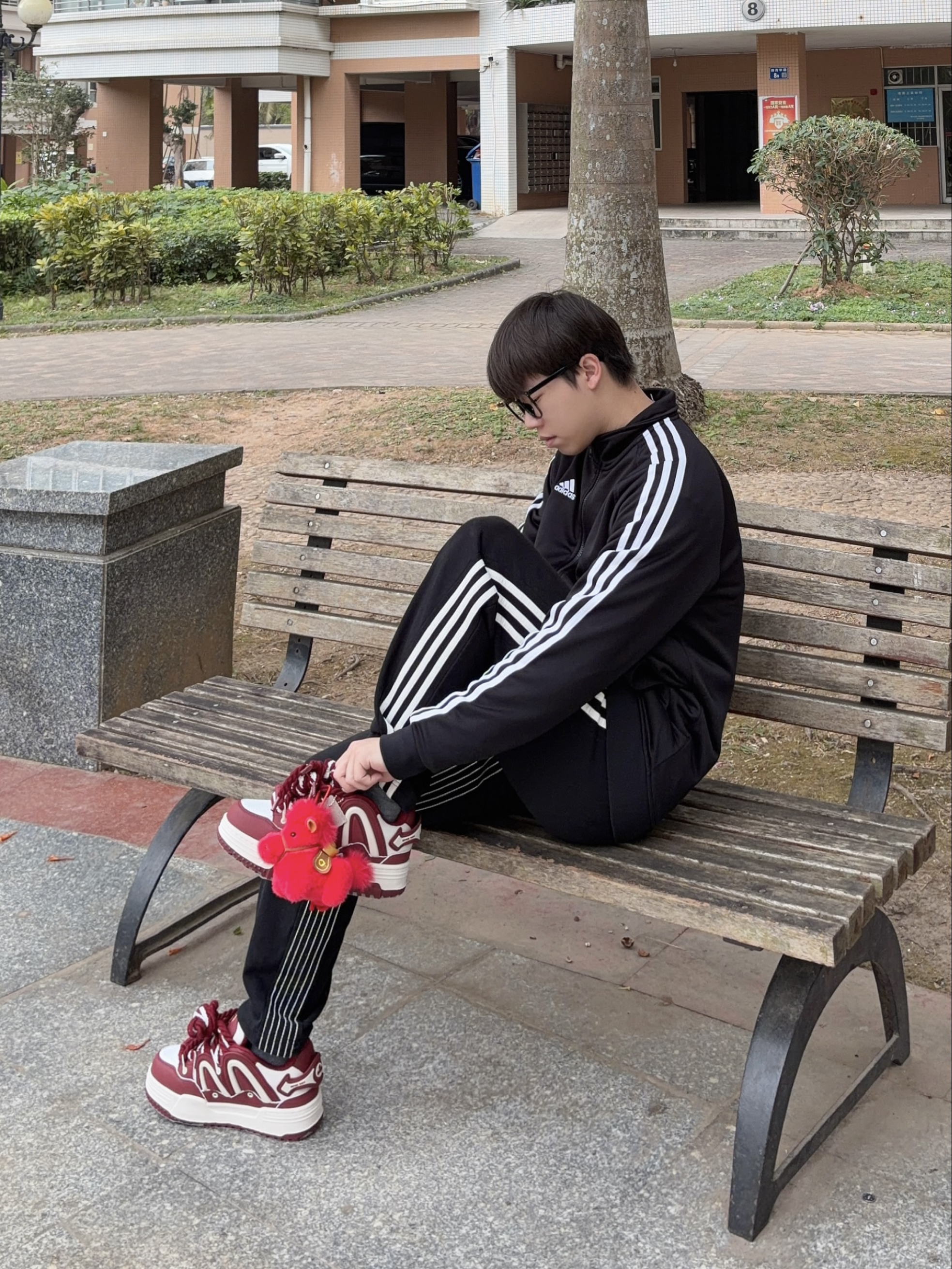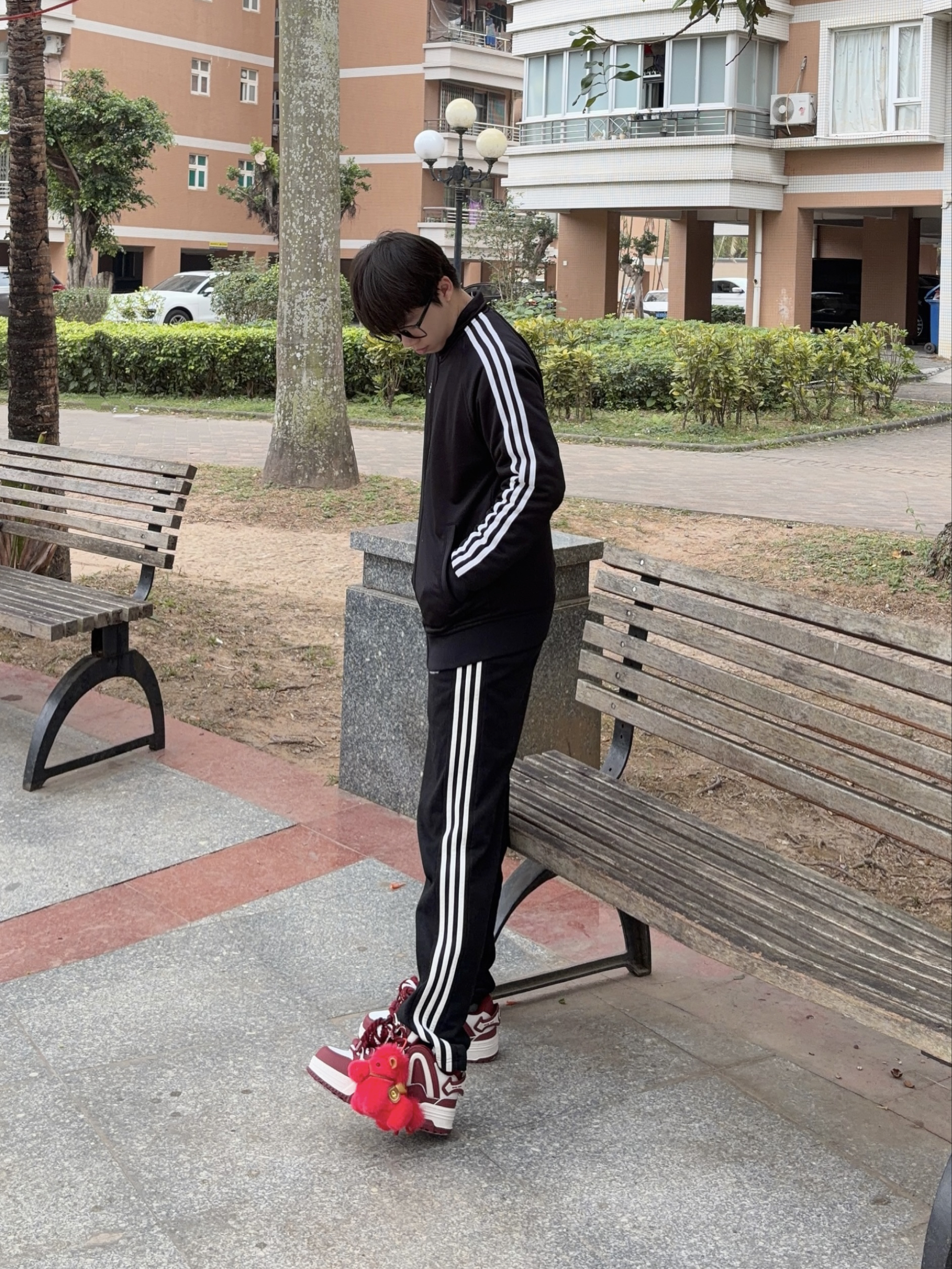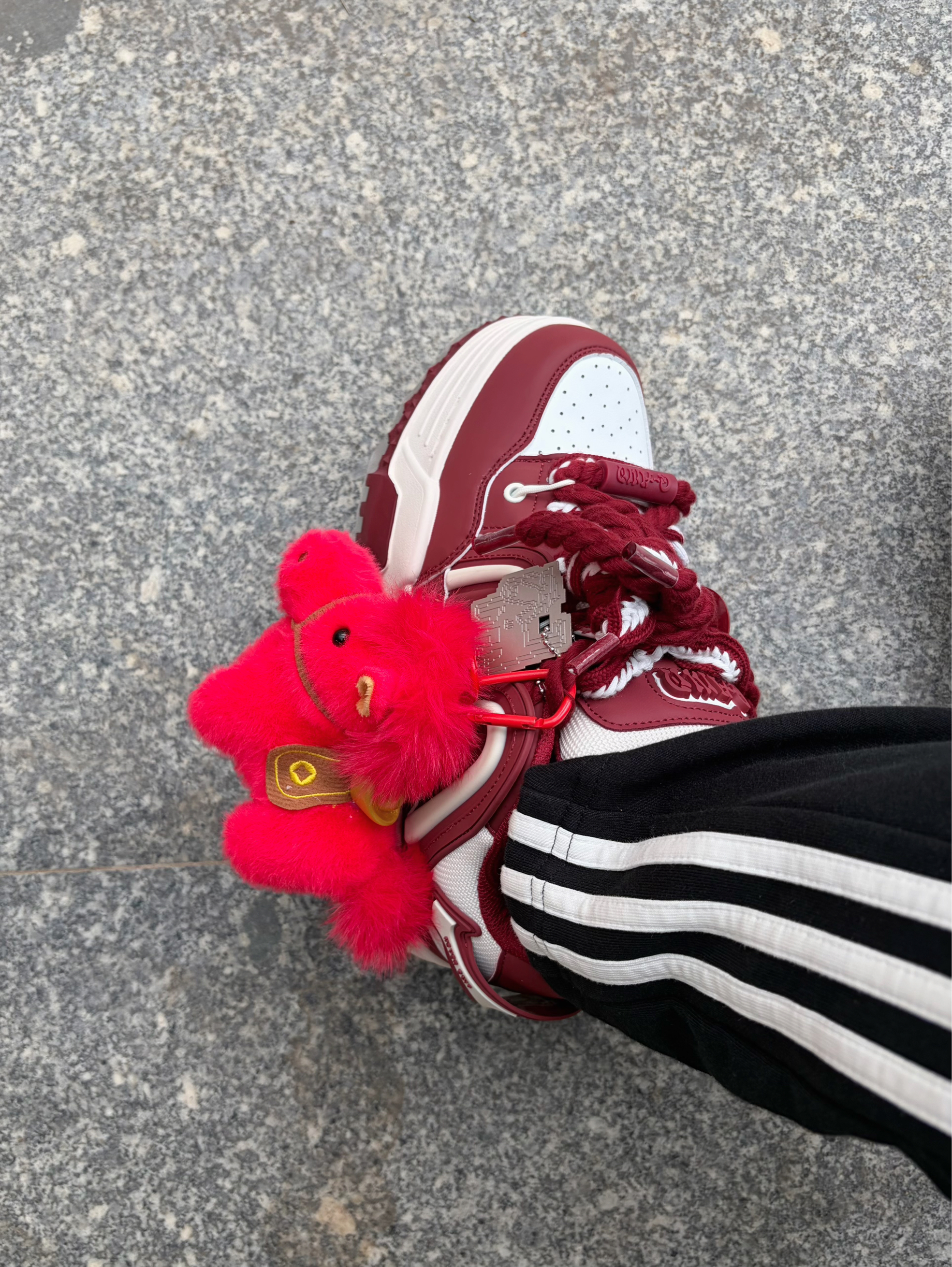 新年出门总想要点氛围感🧨 Q-AND 这双酒红白拼色板鞋👟 自带复古运动感 配色映衬新年 脚边的小马挂饰点缀刚好呼应鞋子配色♥️ 毛茸茸的红绒质感很讨喜🔥 驮着金元宝寓意也够好✅ 一身经典的黑白运动套装👔👖做基底 整体造型简约不单调 新春出街或走亲访友都合适🚶