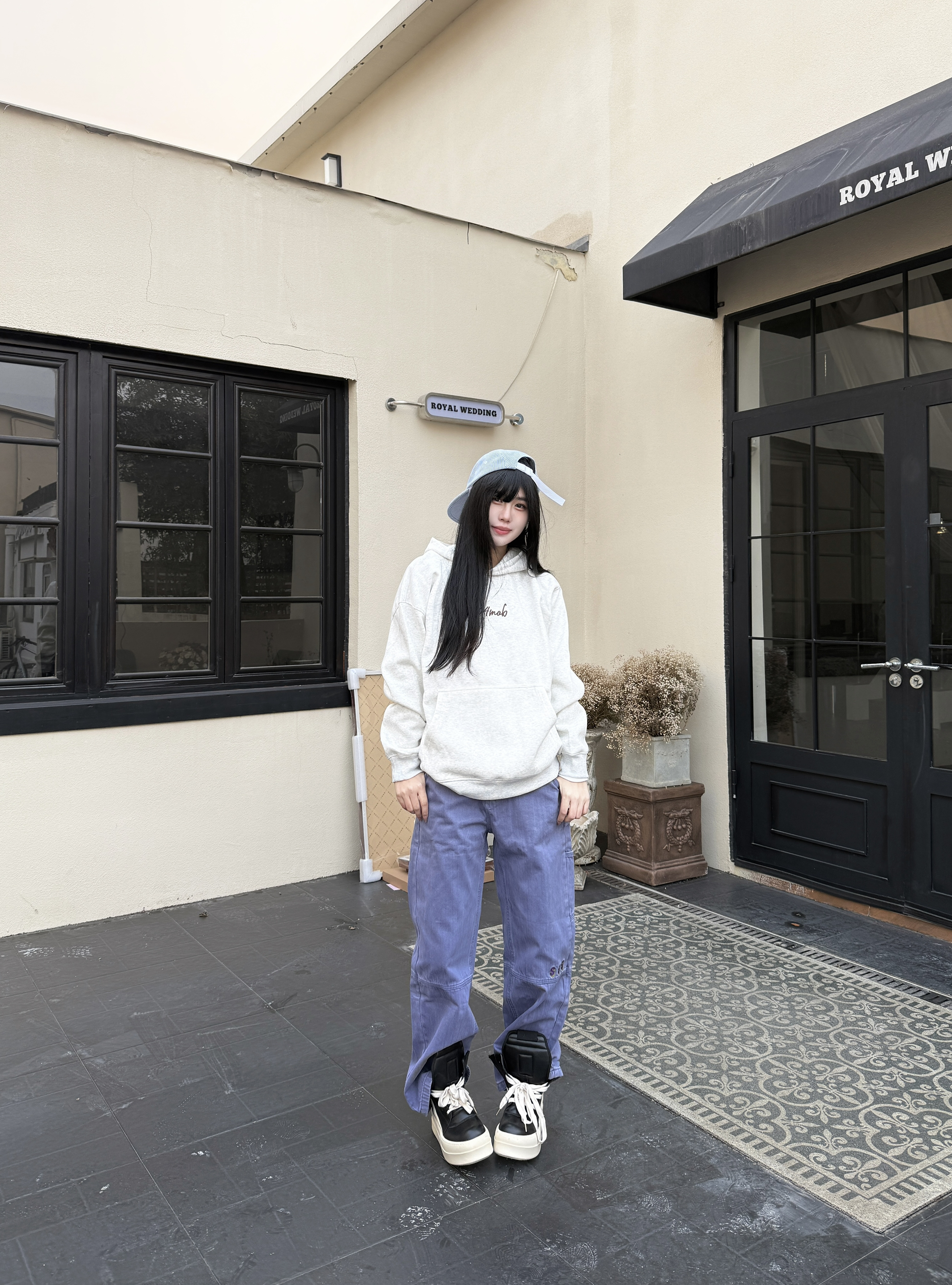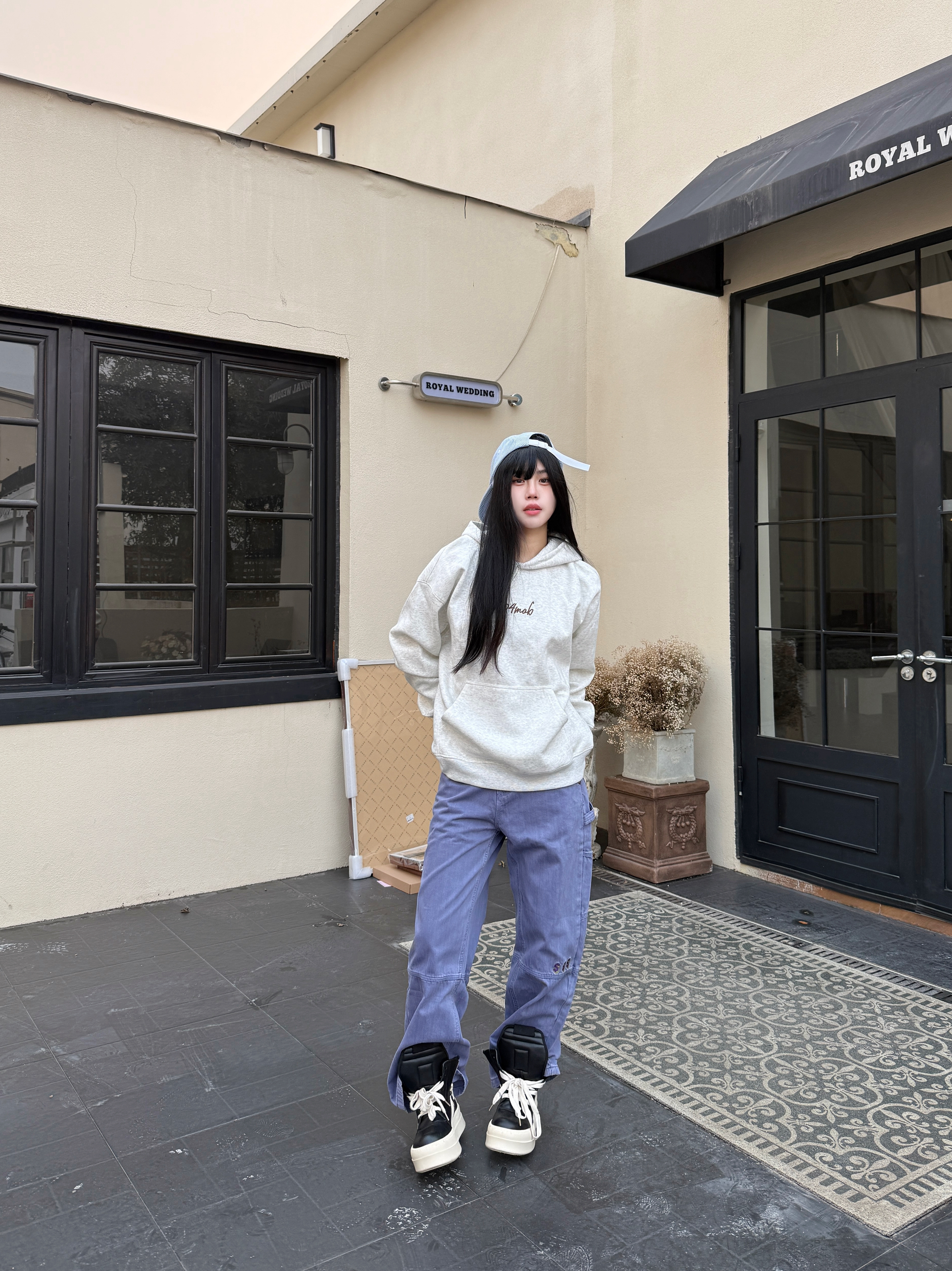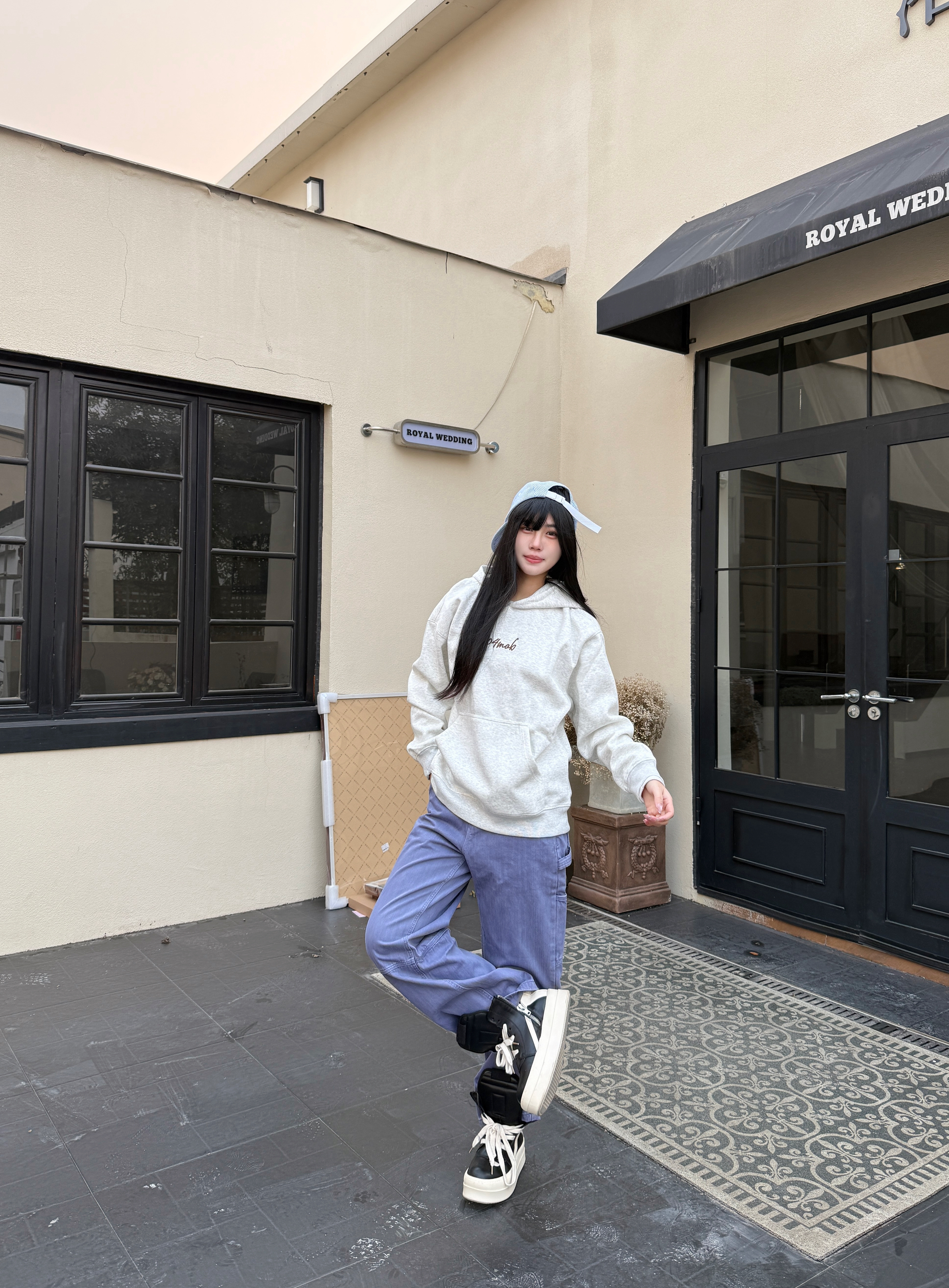 今天预热我的街头风穿搭 上身穿了一个灰色的重磅卫衣 这个卫衣的帽子设计很细节 字母logo刺绣做的就很有质感 搭配了一条藏蓝色工装裤就很帅 最后戴一个帽子增加时尚感 新年这么穿你学会了吗