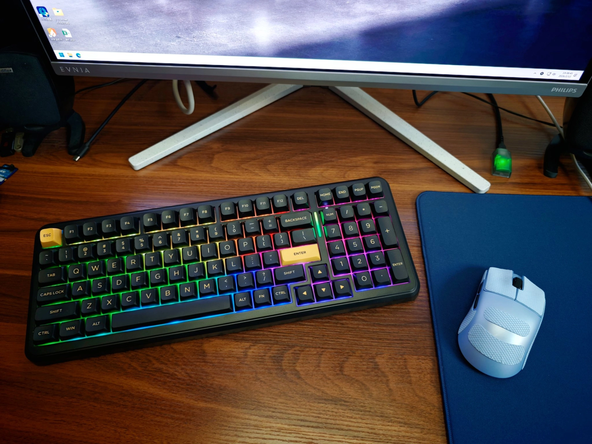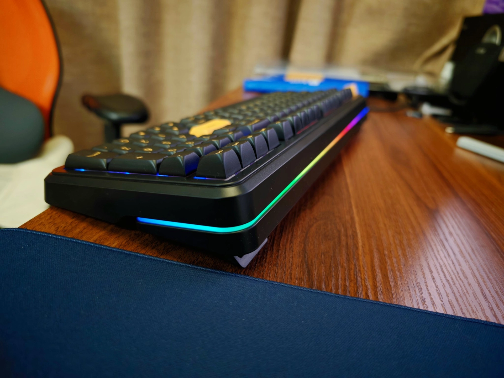 我发现这款键盘在98配列里性价比还不错~ 现在好多68配列的键盘,它保留数字键,游戏办公切换着用很方便👏 星斗方案、原生双8K这些参数我不太懂,但用着很流畅~ 10000毫安电池,关灯续航能到2500小时,开灯的话就少很多,估计100小时不到🤔 RGB灯效超好看,三十多种选起来很有意思,侧面还有环绕流水灯,和桌面搭起来氛围感直接拉满!要是手托能选装就更好啦~