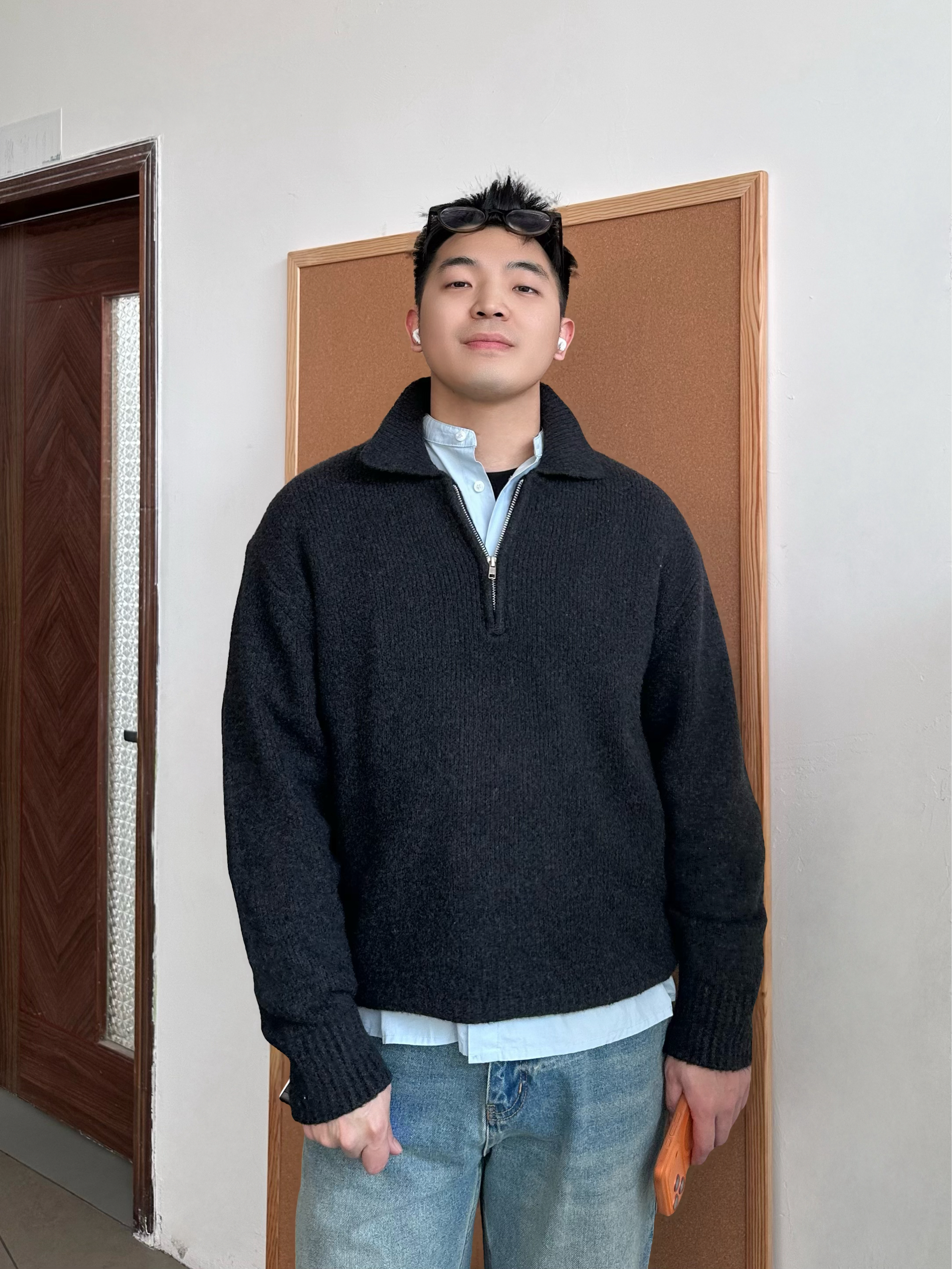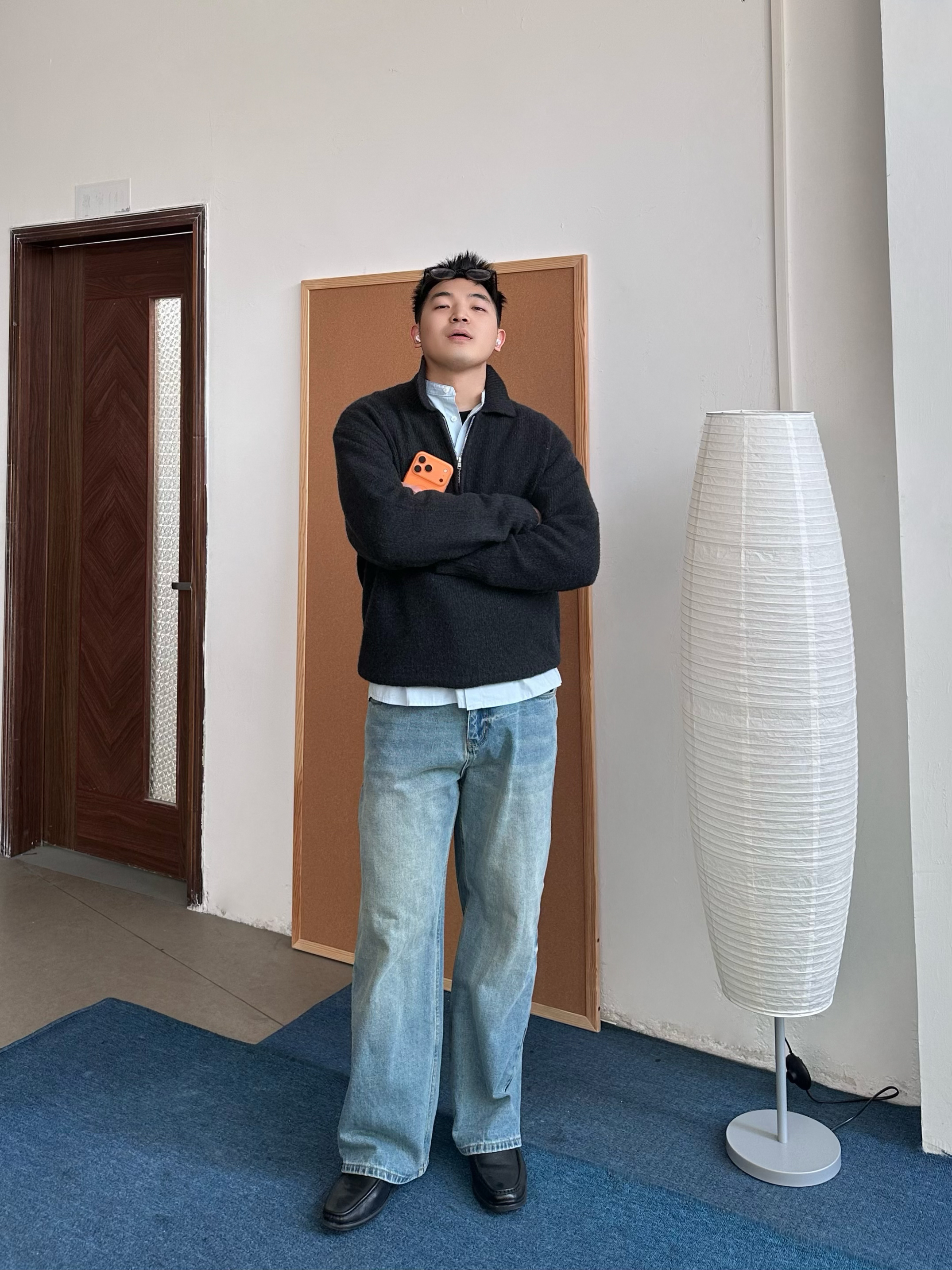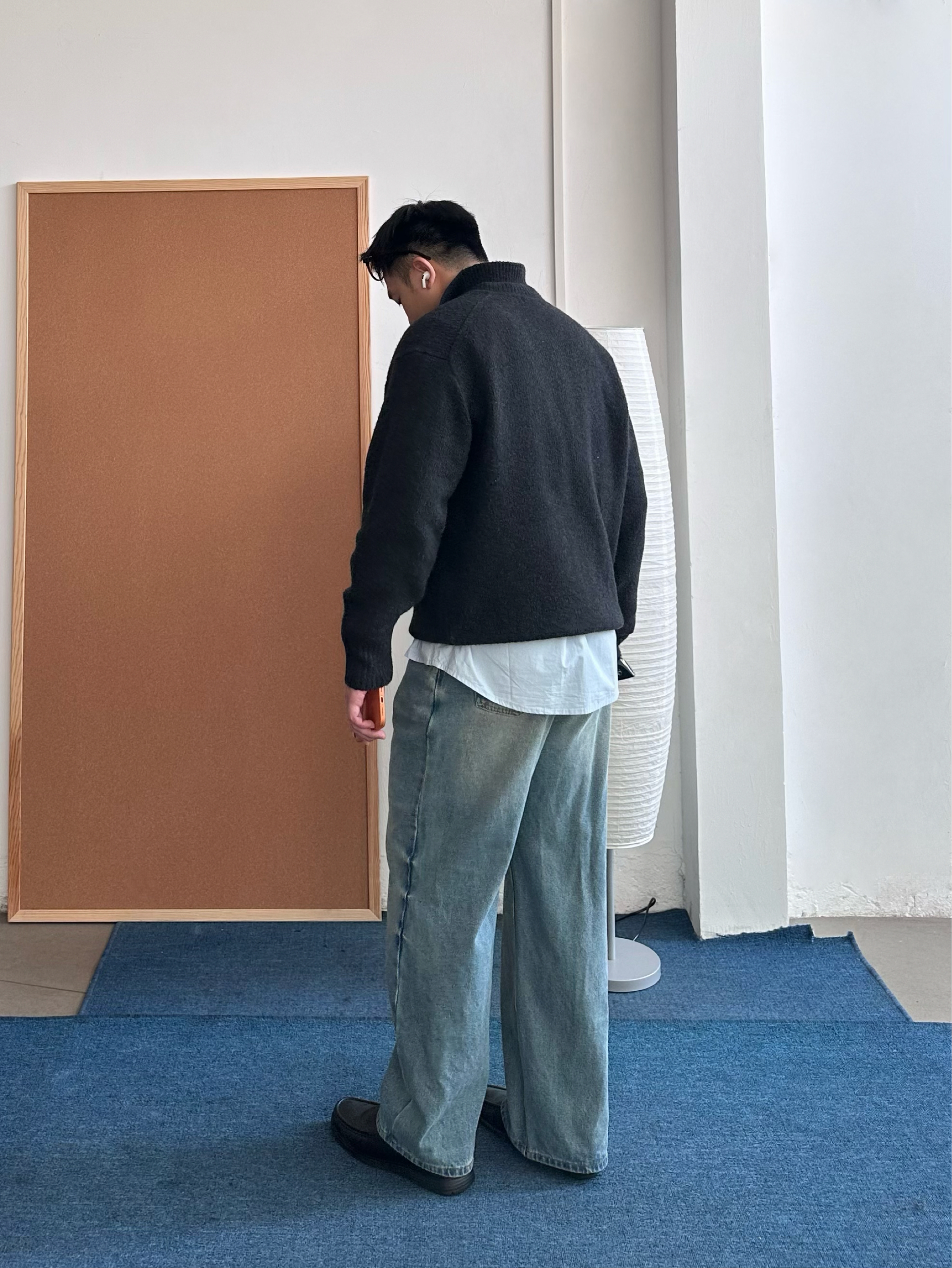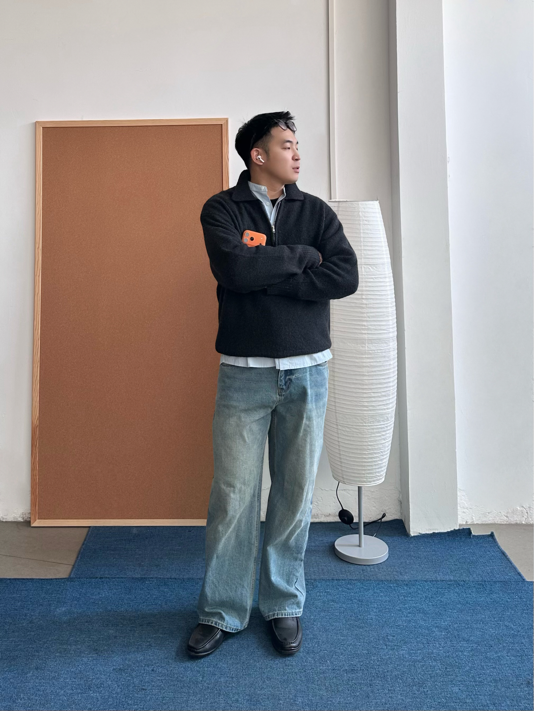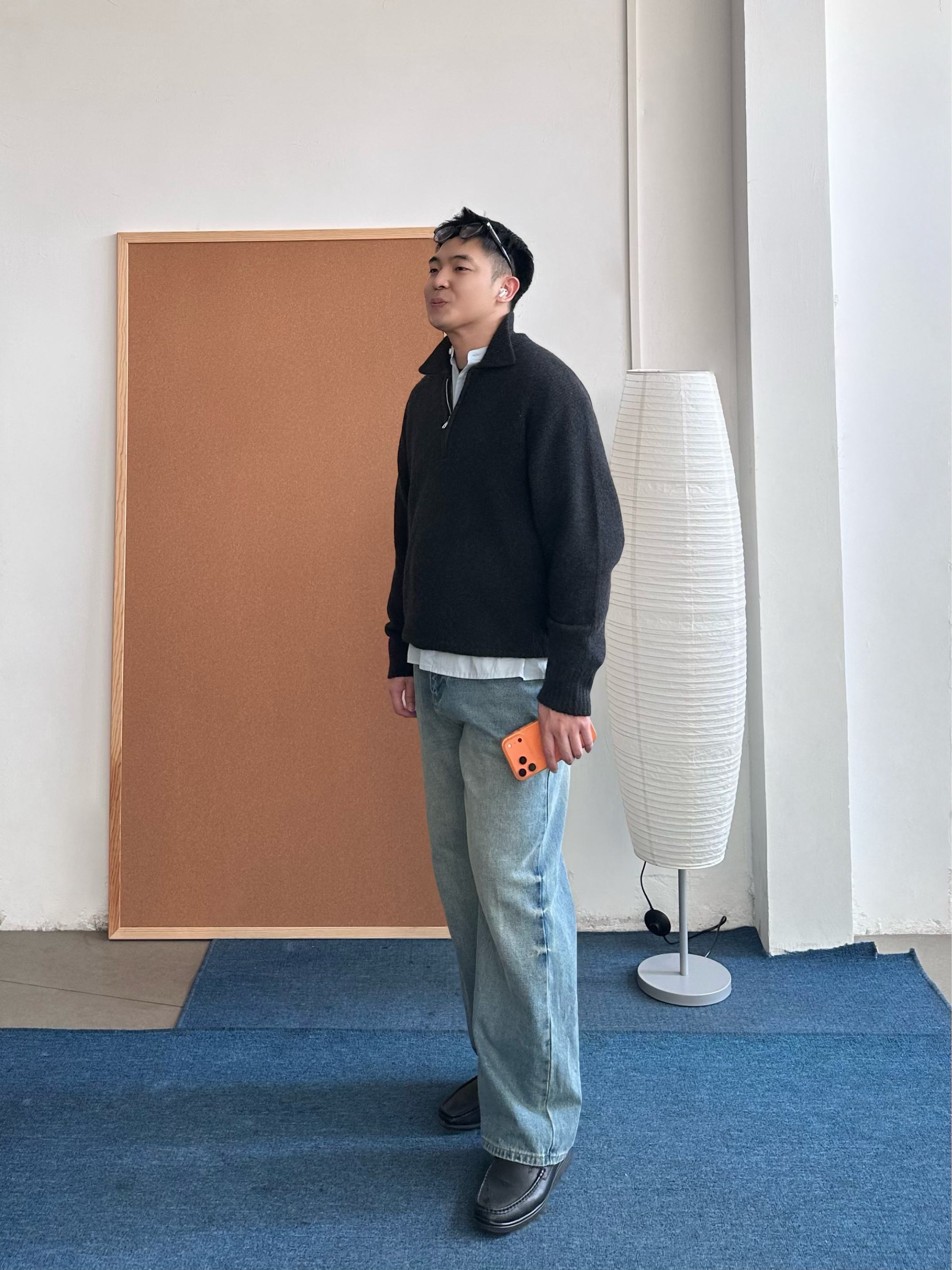 👔 内搭:我先穿了一件浅蓝色法式立领衬衫,领口干净利落,比普通翻领更轻盈,露出一点边就很加分。 🧶 外搭:外面套深灰色半拉链针织毛衣,拉链开一点,层次马上出来。灰+蓝的配色也很清爽,早春穿刚刚好。 👖 下装:浅蓝色洗水牛仔裤呼应上身颜色,整体更统一。 👞 鞋子:黑色乐福鞋收尾,把休闲感往通勤方向拉一拉。 毛衣真的别再单穿了,叠一件衬衫,质感和氛围感都提升一个level 👌