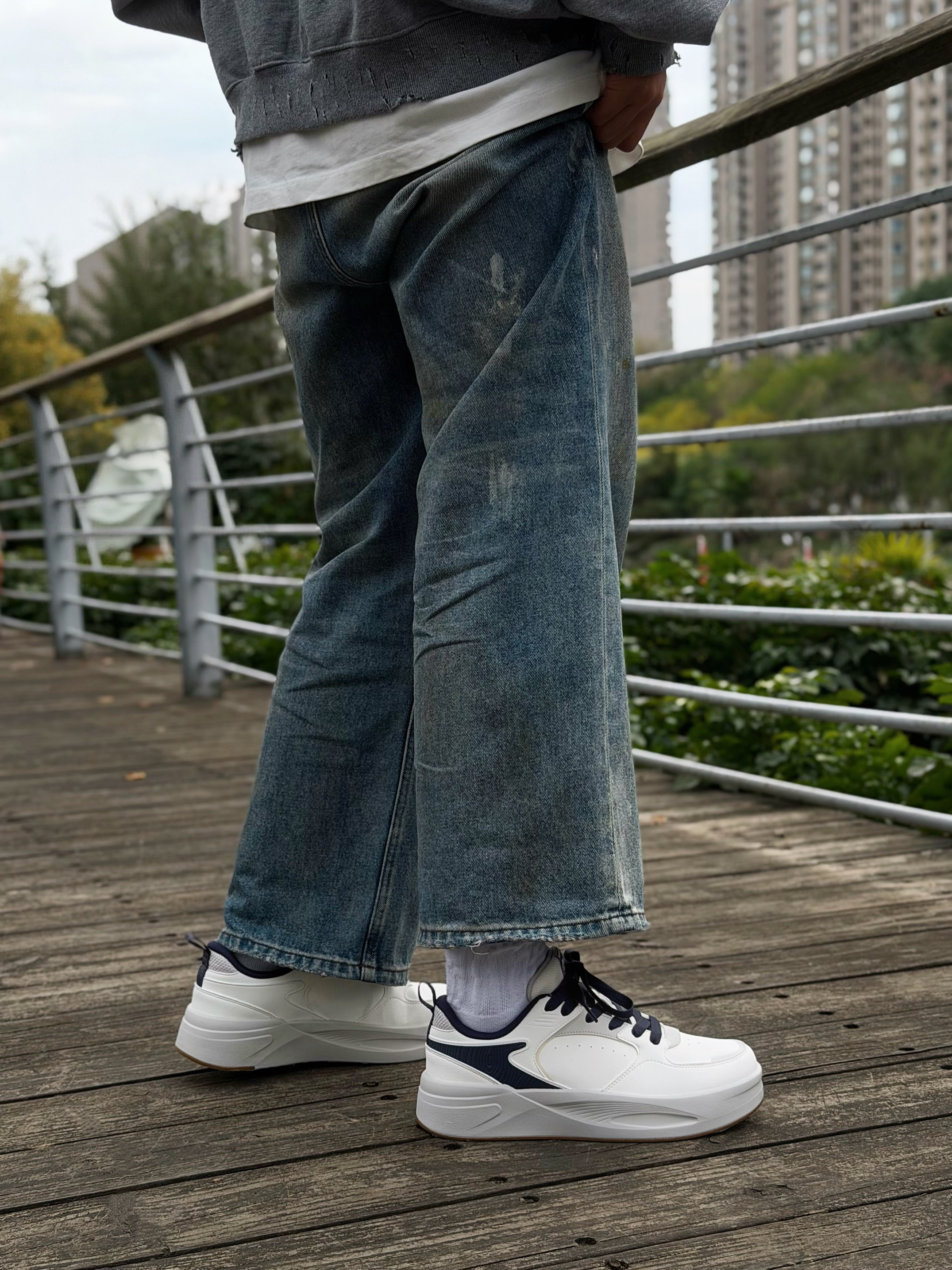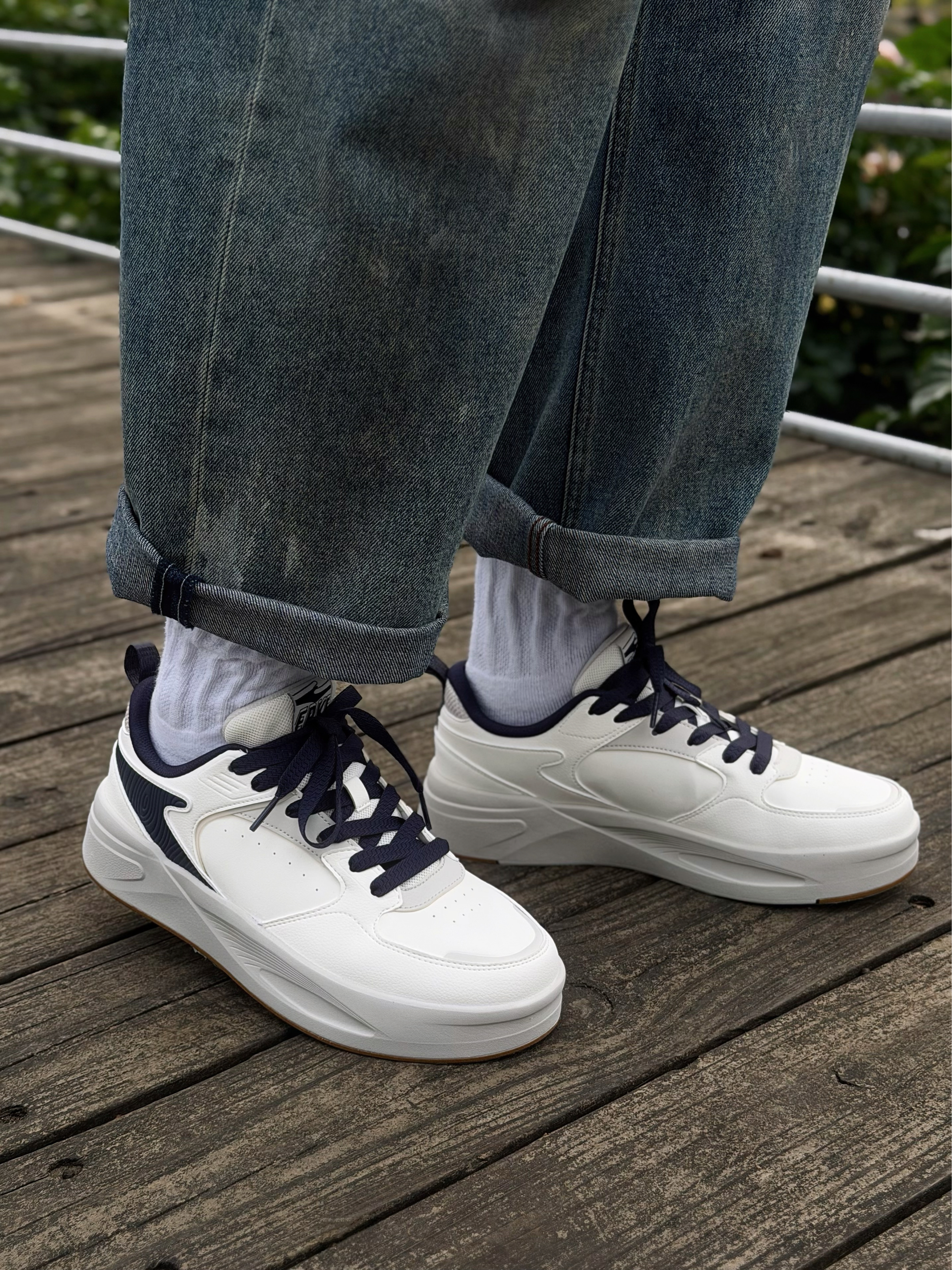 如果说黑白🐼是经典, 那米白和藏蓝的组合就是低调的优雅 今天分享的这双 鸿星尔克 千仞2休闲板鞋 配色看起来就很舒服,带点灰调的米白 清爽又沉稳,皮革鞋面也比较好打理 鞋侧Logo和鞋带等细节藏蓝色💙的点缀 让整双鞋瞬间就有了复古学院风的少年感 还有看起来厚实的发泡中底 但上脚真得轻软,偷偷增高不说久穿还不累 搭配上,从牛仔裤、卫裤到黑色西裤到能融入 ⚠️尺码方面我平时穿42,这双也一样(正...
