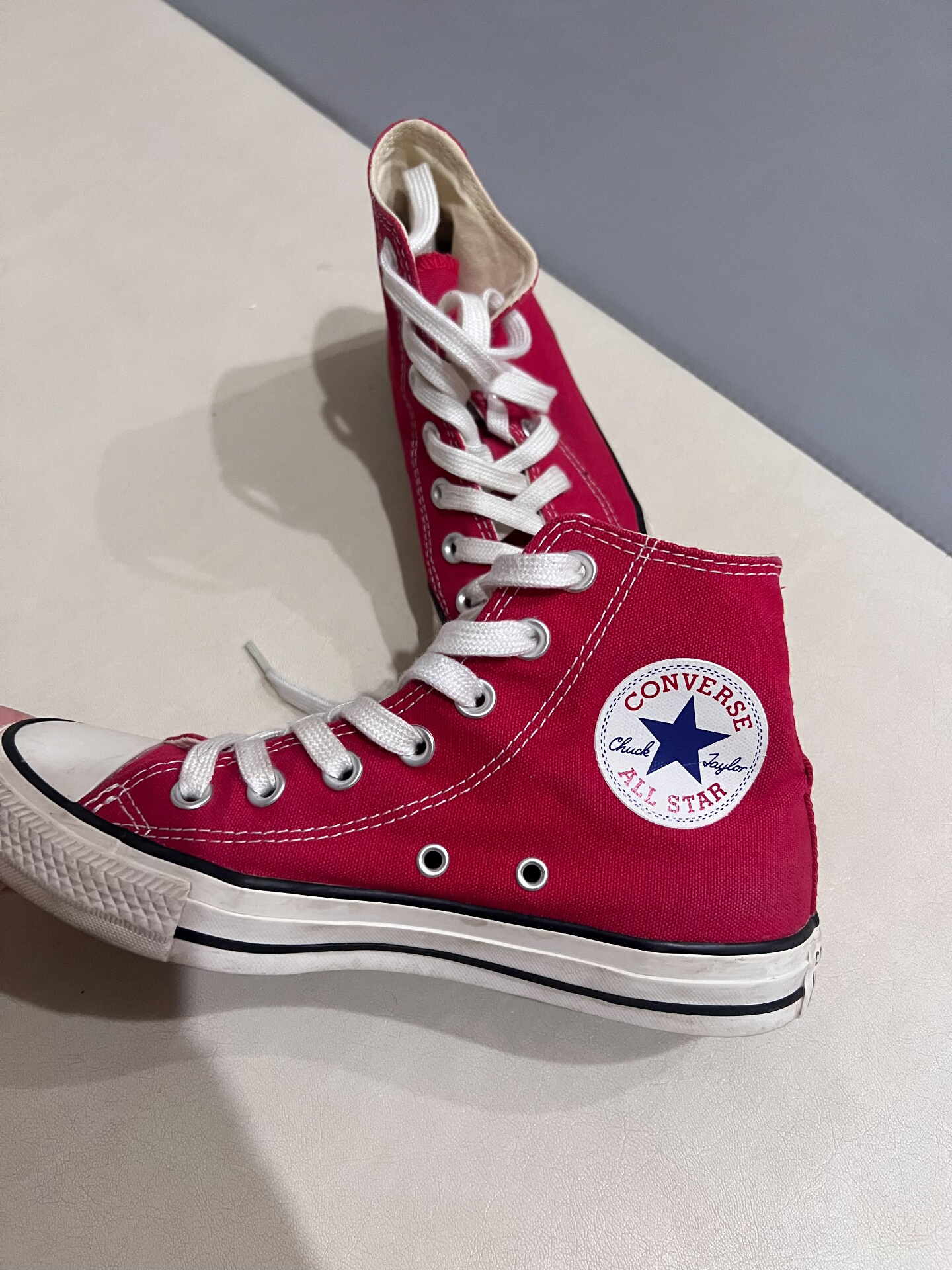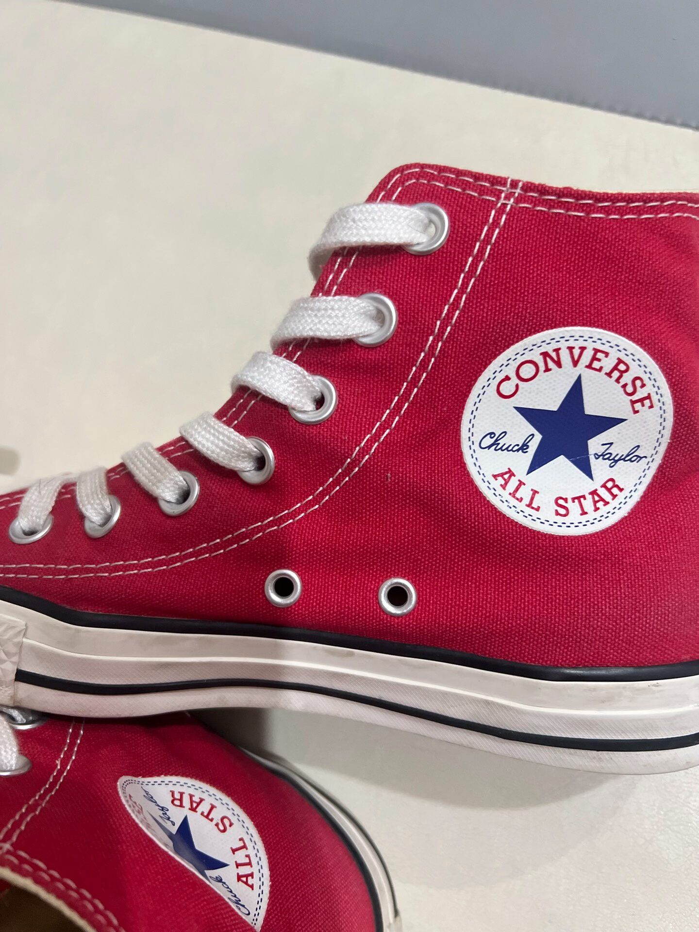 谁的鞋柜里还没有一双匡威?这双经典红色高帮真的是新年穿搭的神,复古又显白,怎么搭都好看! 🌟 颜值暴击 • 正红色帆布+白色鞋带+标志性All Star Logo,复古感直接拉满,新年穿它出门,拍照直接C位出道📸 • 高帮设计修饰腿型,秒变长腿精,不管是配牛仔裤、百褶裙还是运动裤,都能轻松拿捏氛围感 • 白色橡胶鞋头+黑色包边,经典配色永不过时,越旧越有味道,越穿越爱 💪 穿着体验 • 帆...
