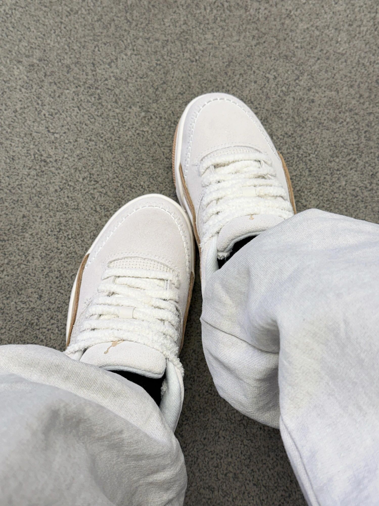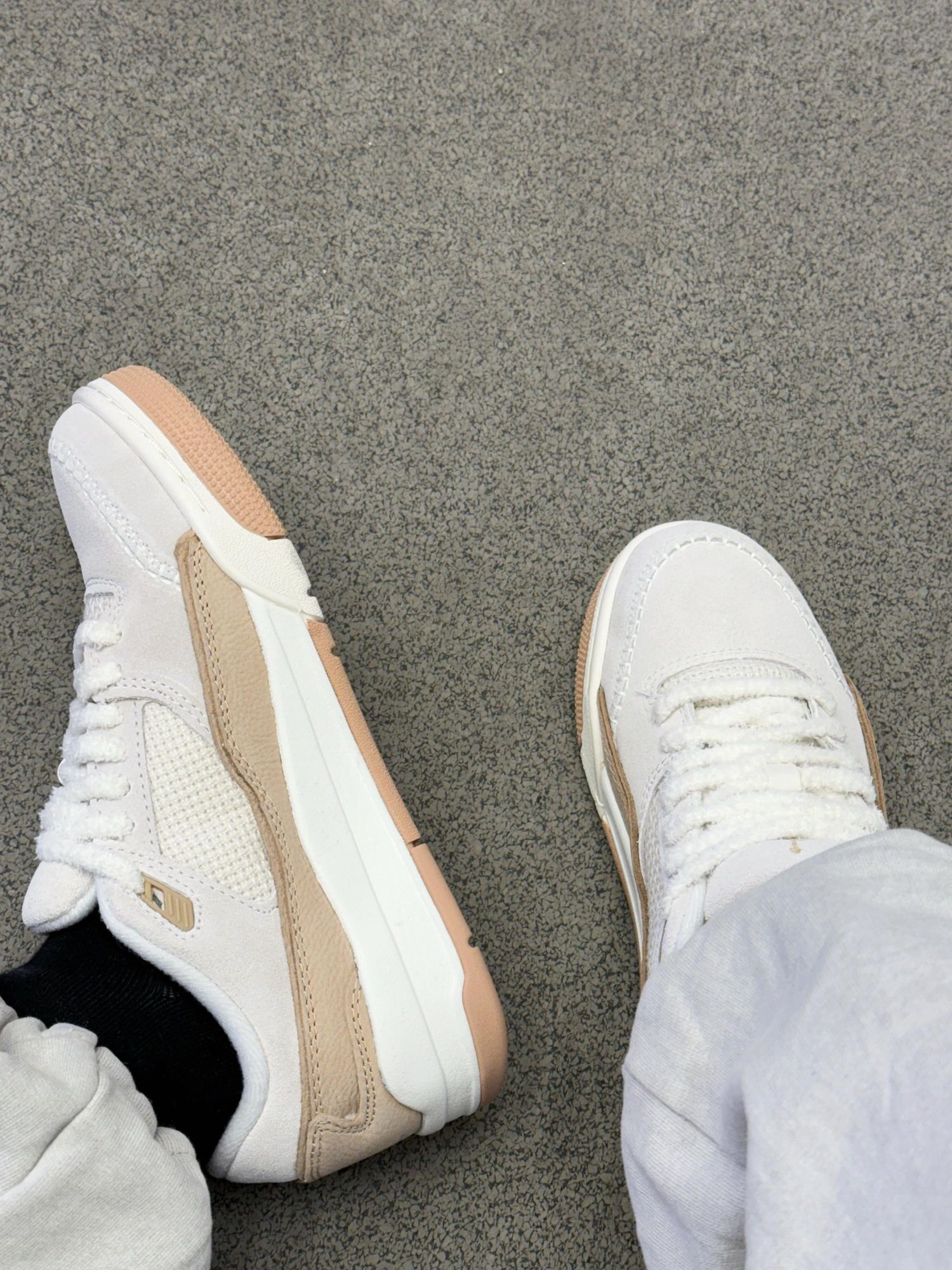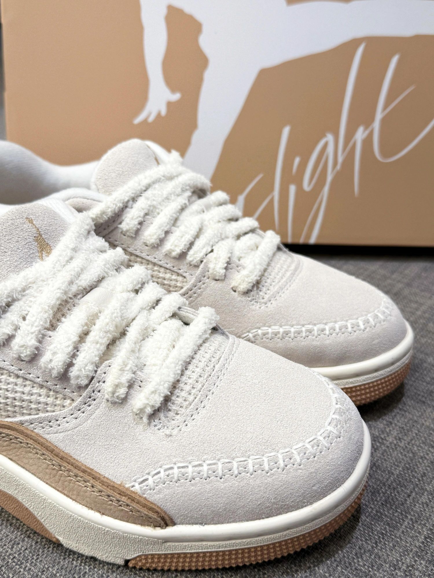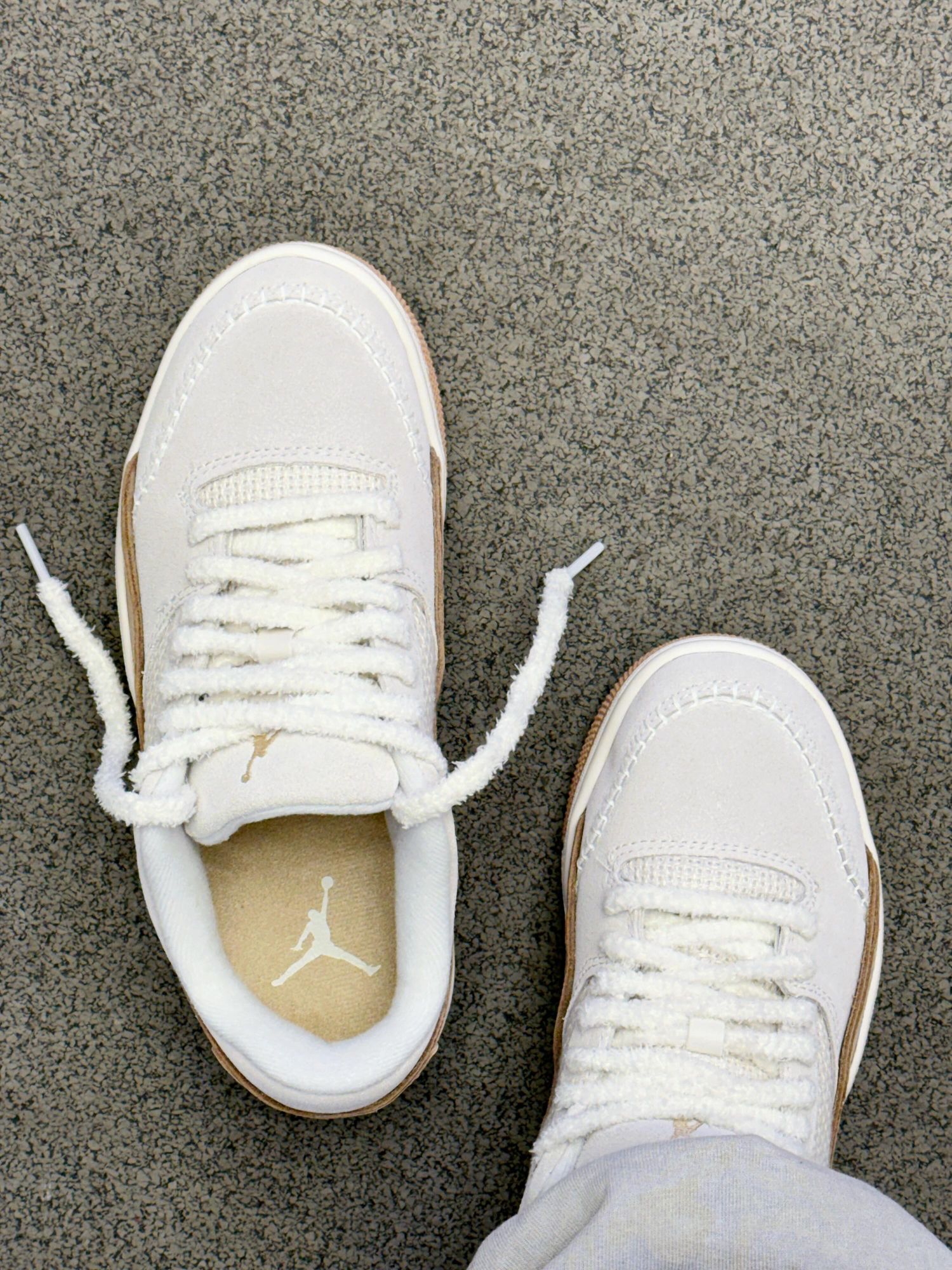 这双AJ的毛绒鞋带直接戳中心巴💕 奶白➕浅棕 软乎乎像块棉花糖~ 脚感软弹走一天都不易累🥰通勤出街双buff! 鞋柜“温柔担当” 搭配裙装裤子都美! 秋冬氛围感直接焊在脚上 超心动💓 双十一耐克活动直接冲!入手不亏~